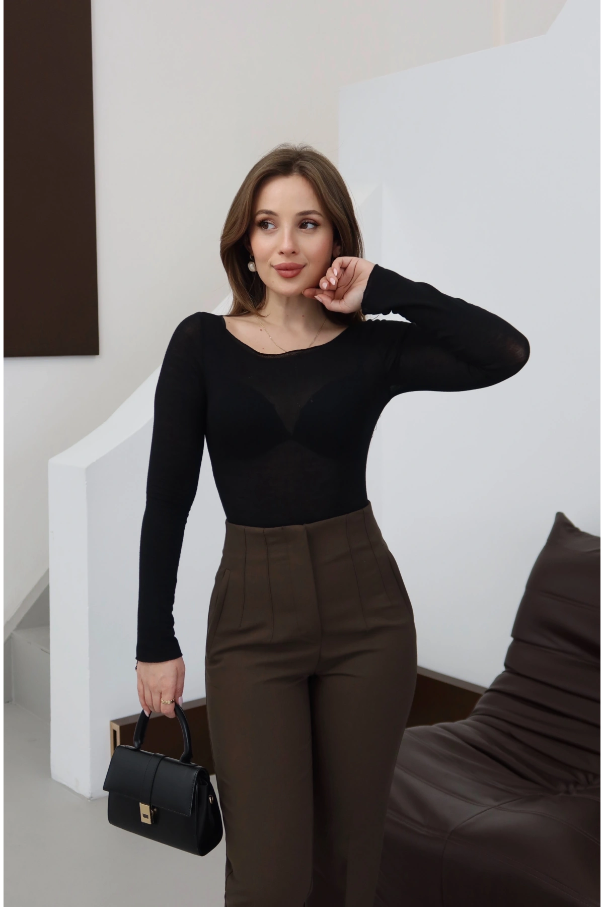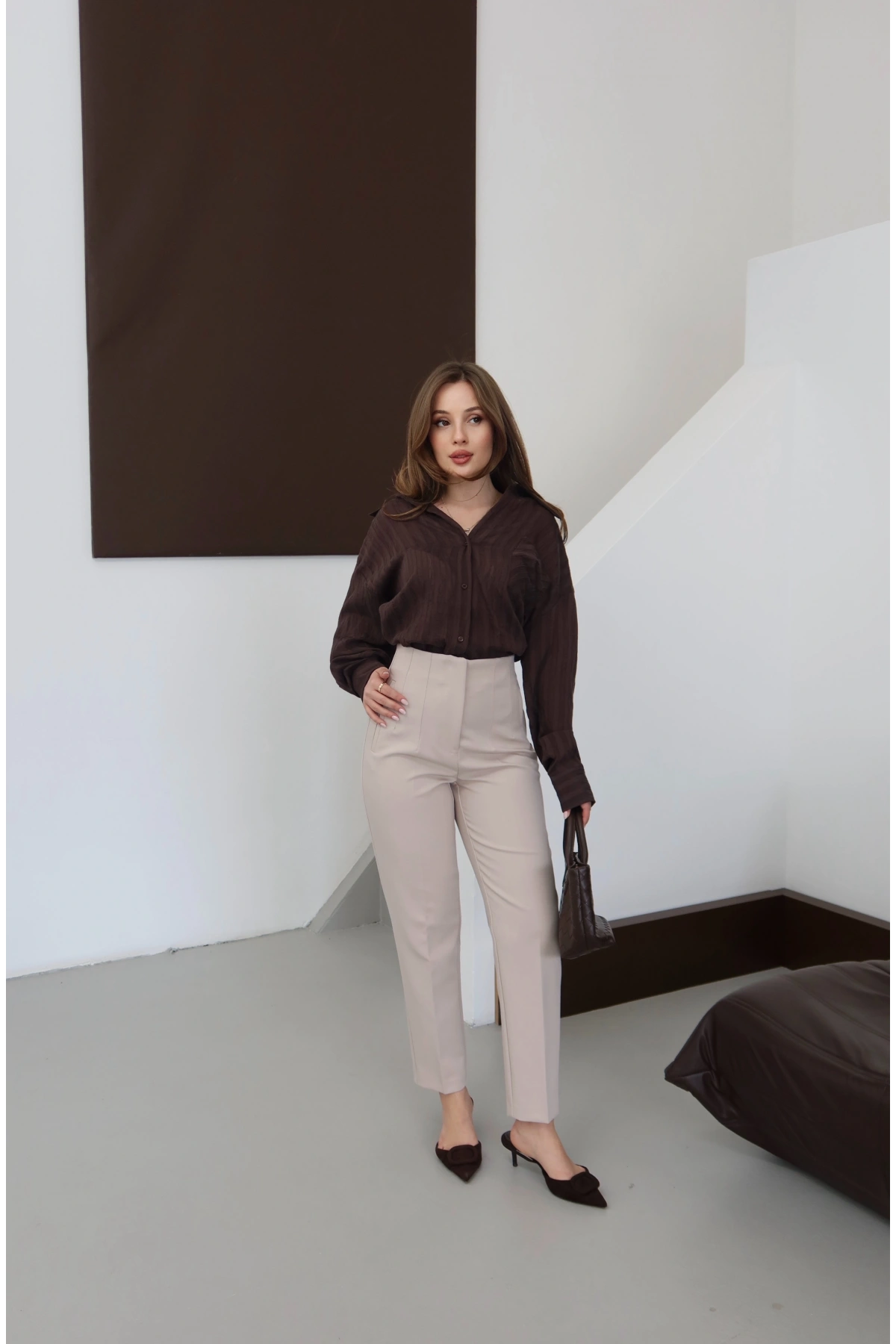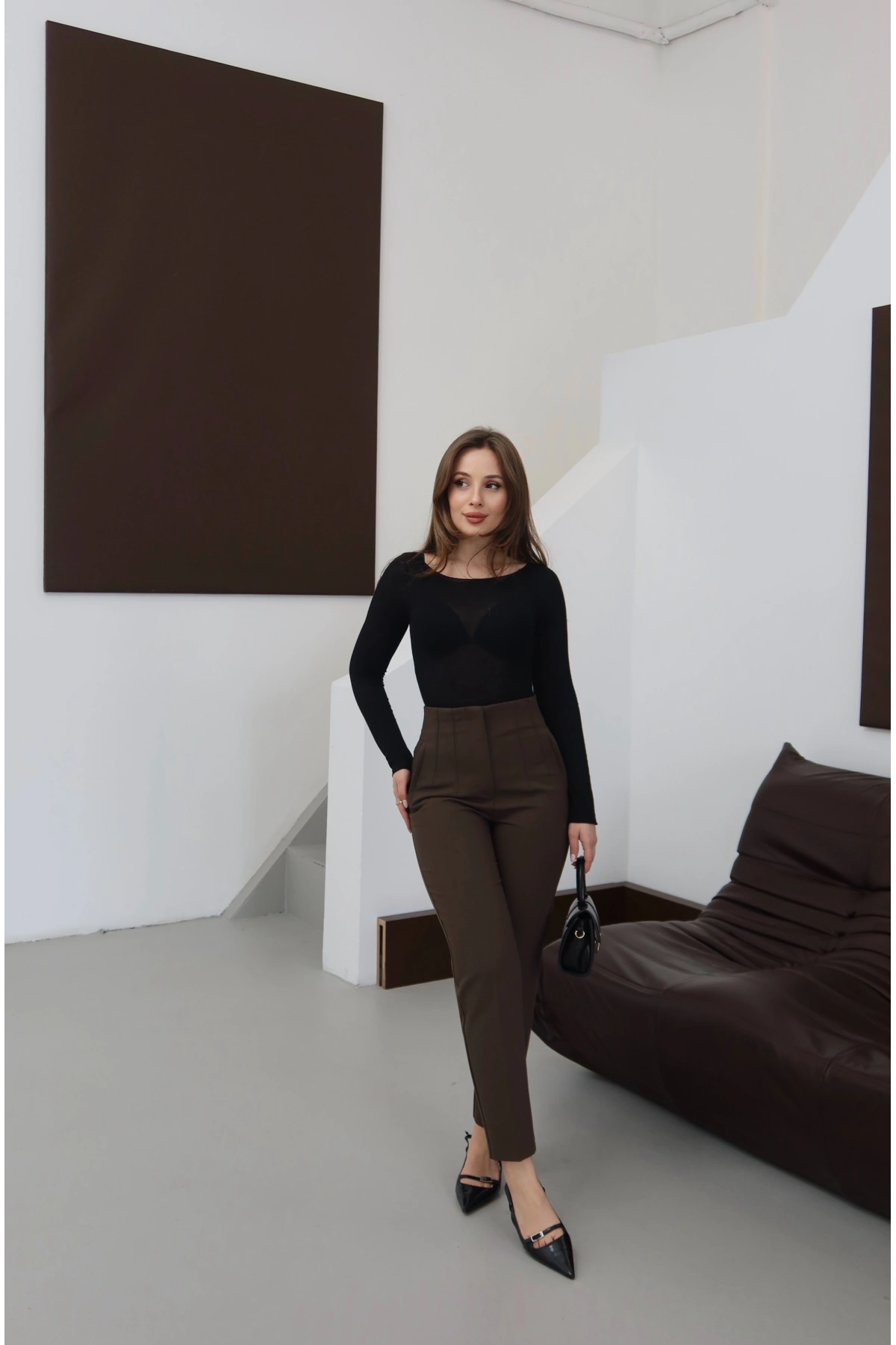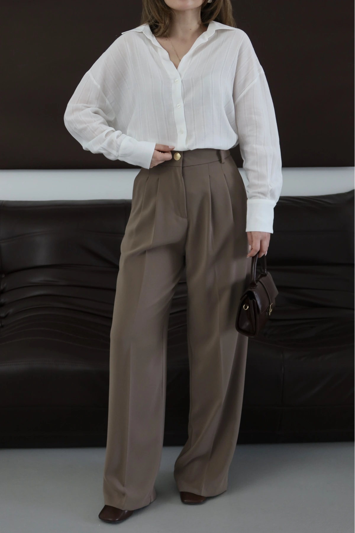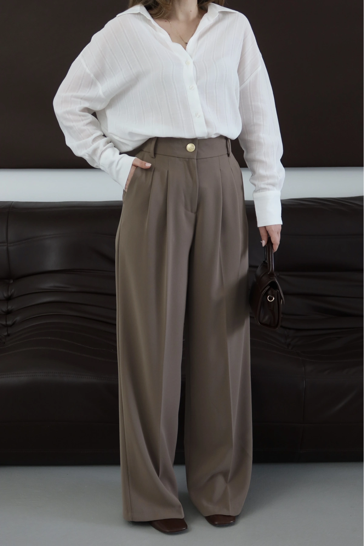 Pens Detaylı Dökümlü Geniş Paça Pantolon Kahve
