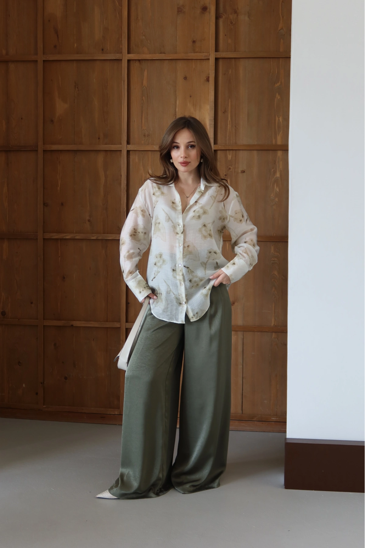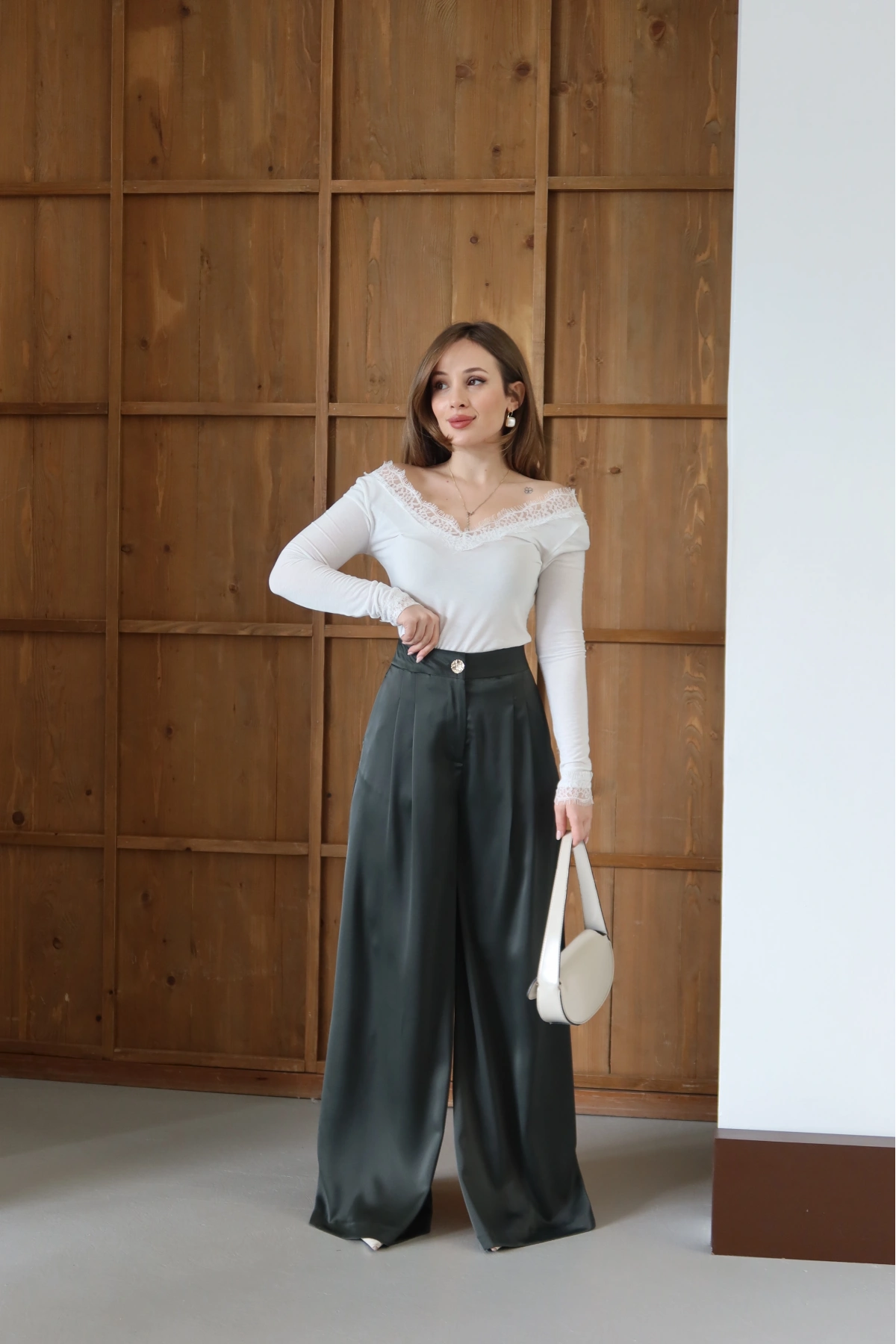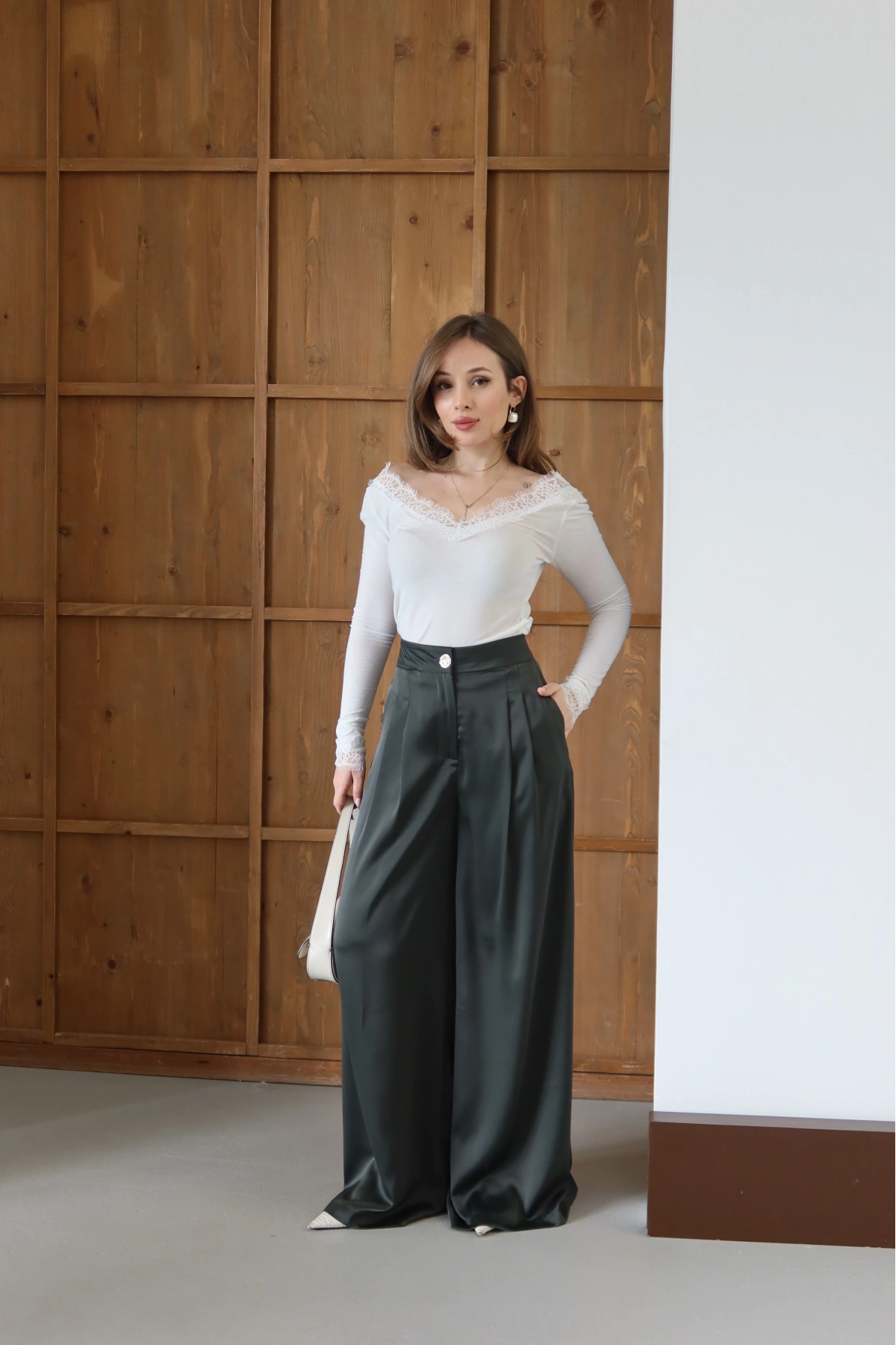 Saten Yüzeyli Dökümlü Pantolon Yeşil