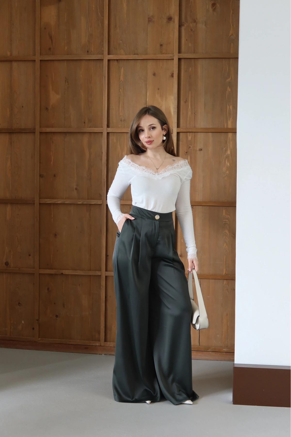Kumaş Detaylı Saten Yüzeyli Dökümlü Pantolon Yeşil