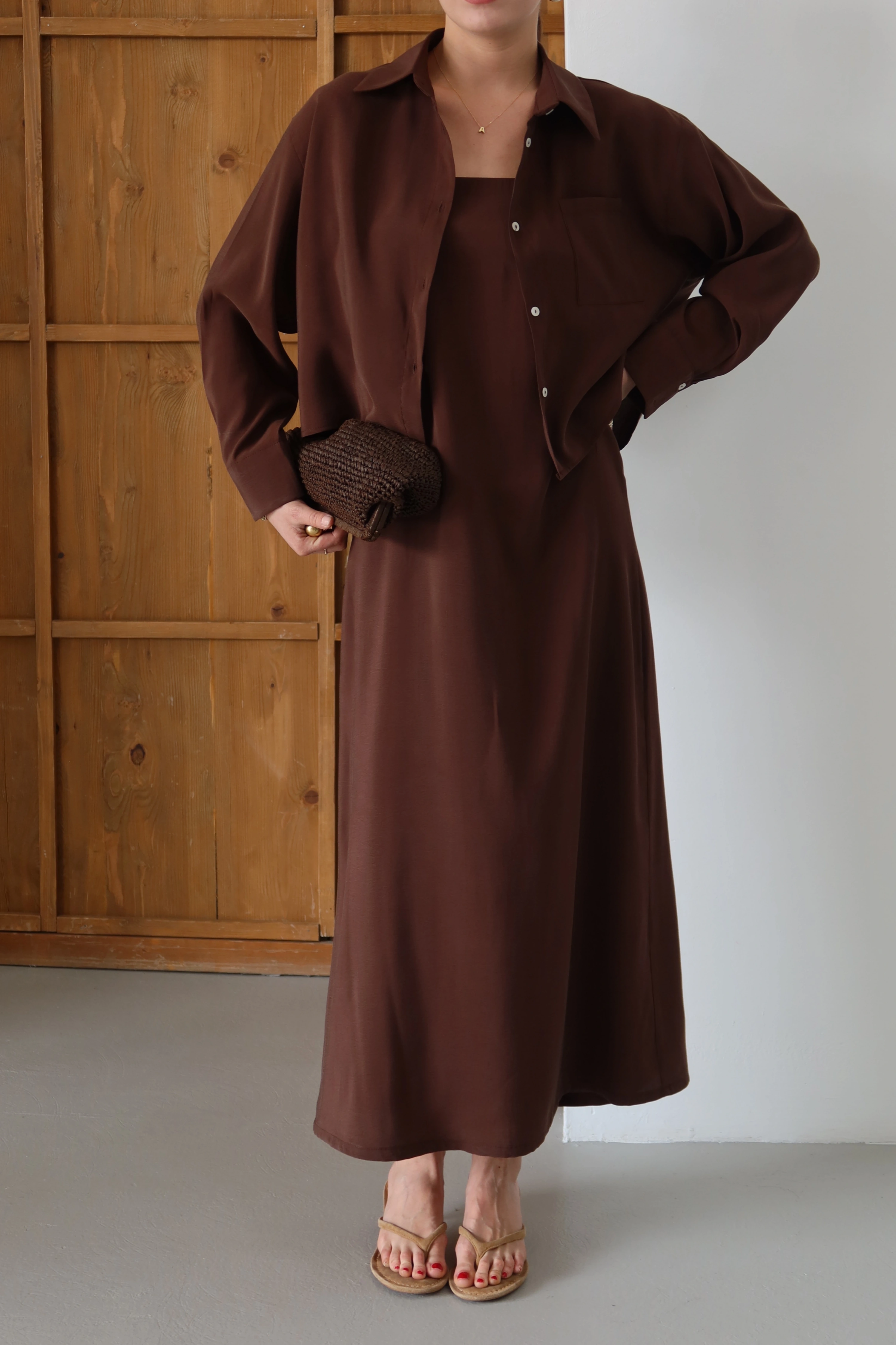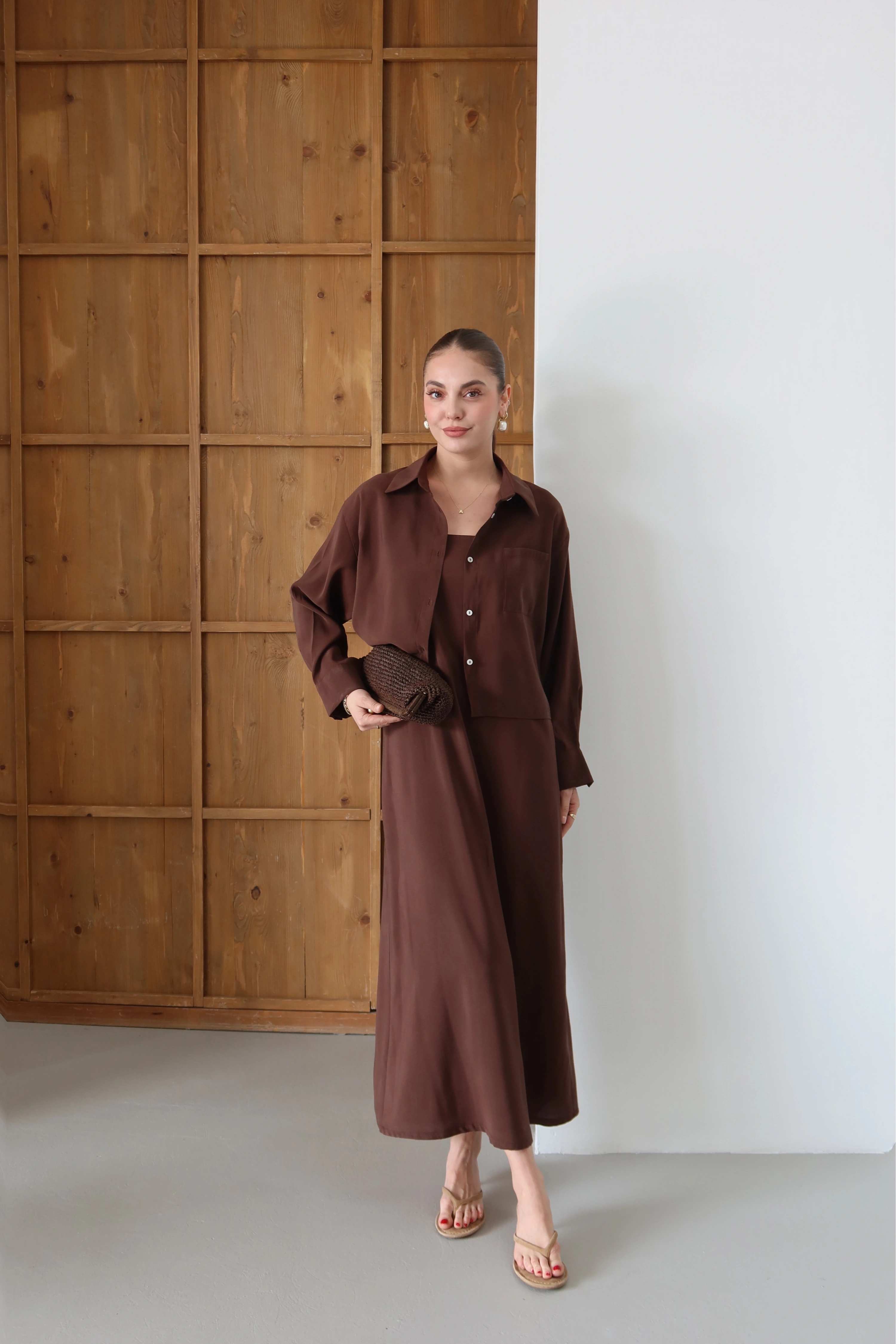 ROÉA kadınının dinamik ruhuna uygun olarak tasarlanan bu ikili set, zamansız gömlek formu ile feminen askılı elbiseyi bir araya getiriyor. İster bir arada kullanarak katmanlı bir stil yaratın, ister ayrı parçalarla kendi kombinlerinizi kurgulayın. Üst segment dokusu ve vücudu özgür bırakan kalıbıyla gün boyu konfor ve yüksek stil vaat ediyor.