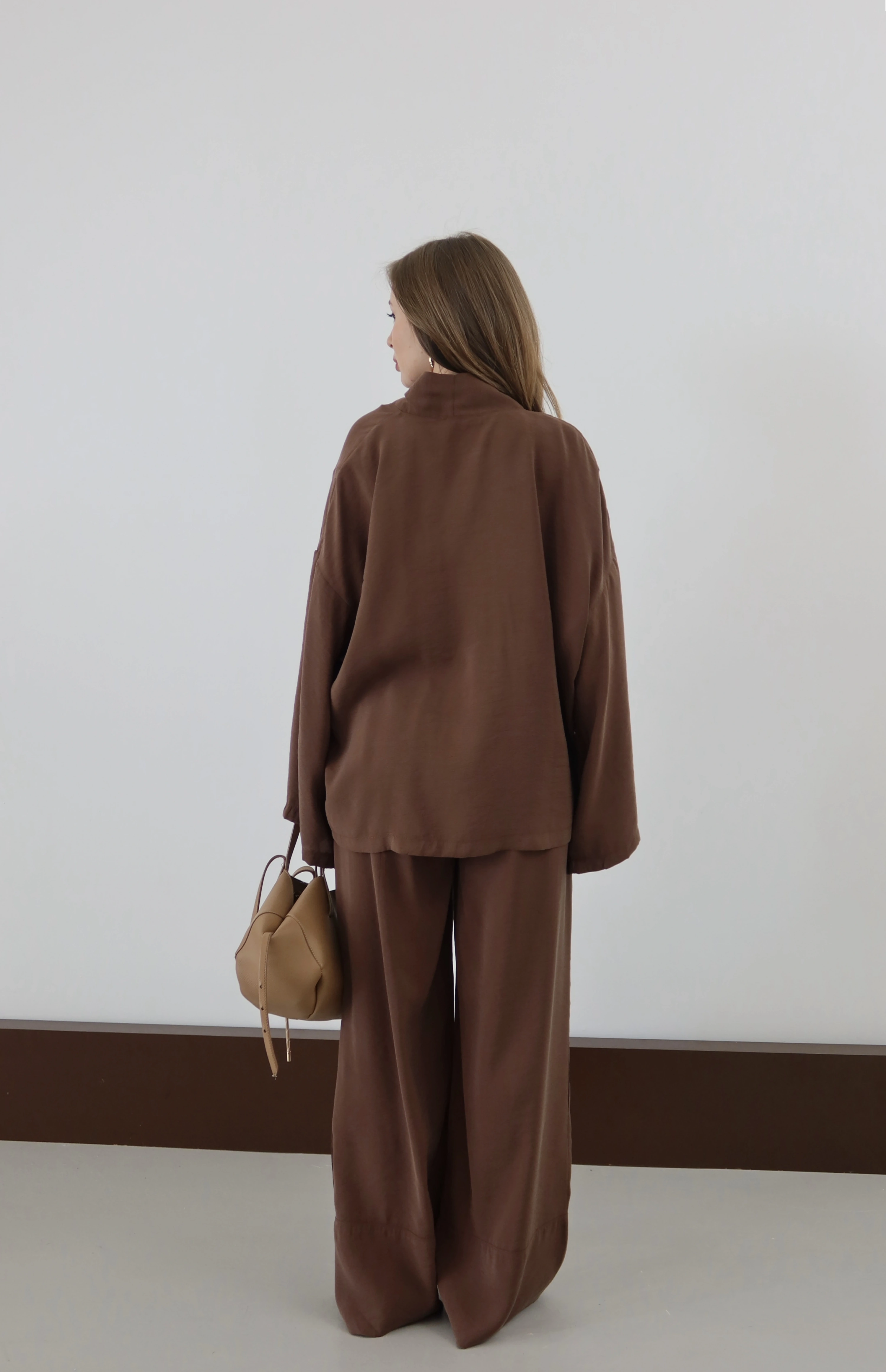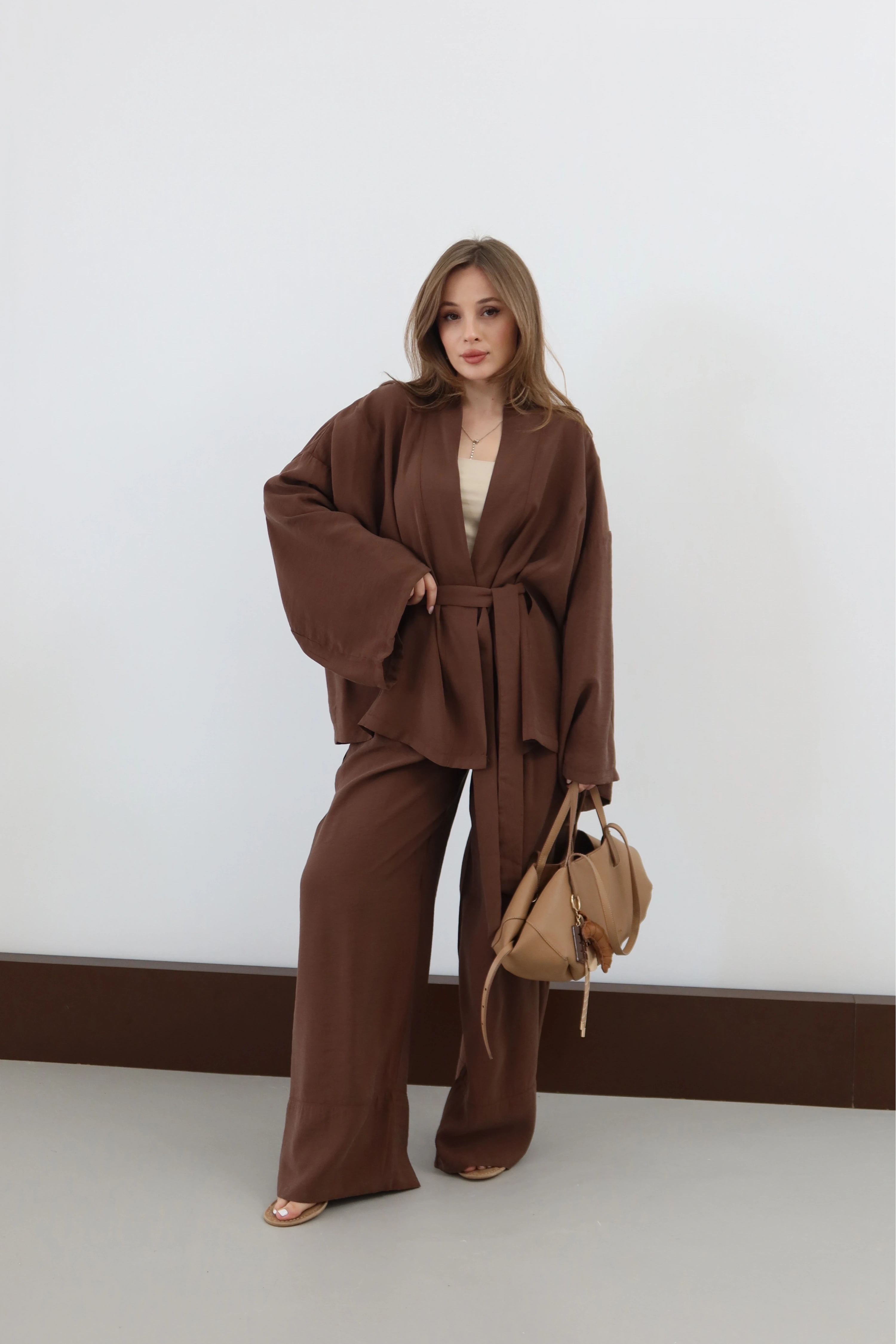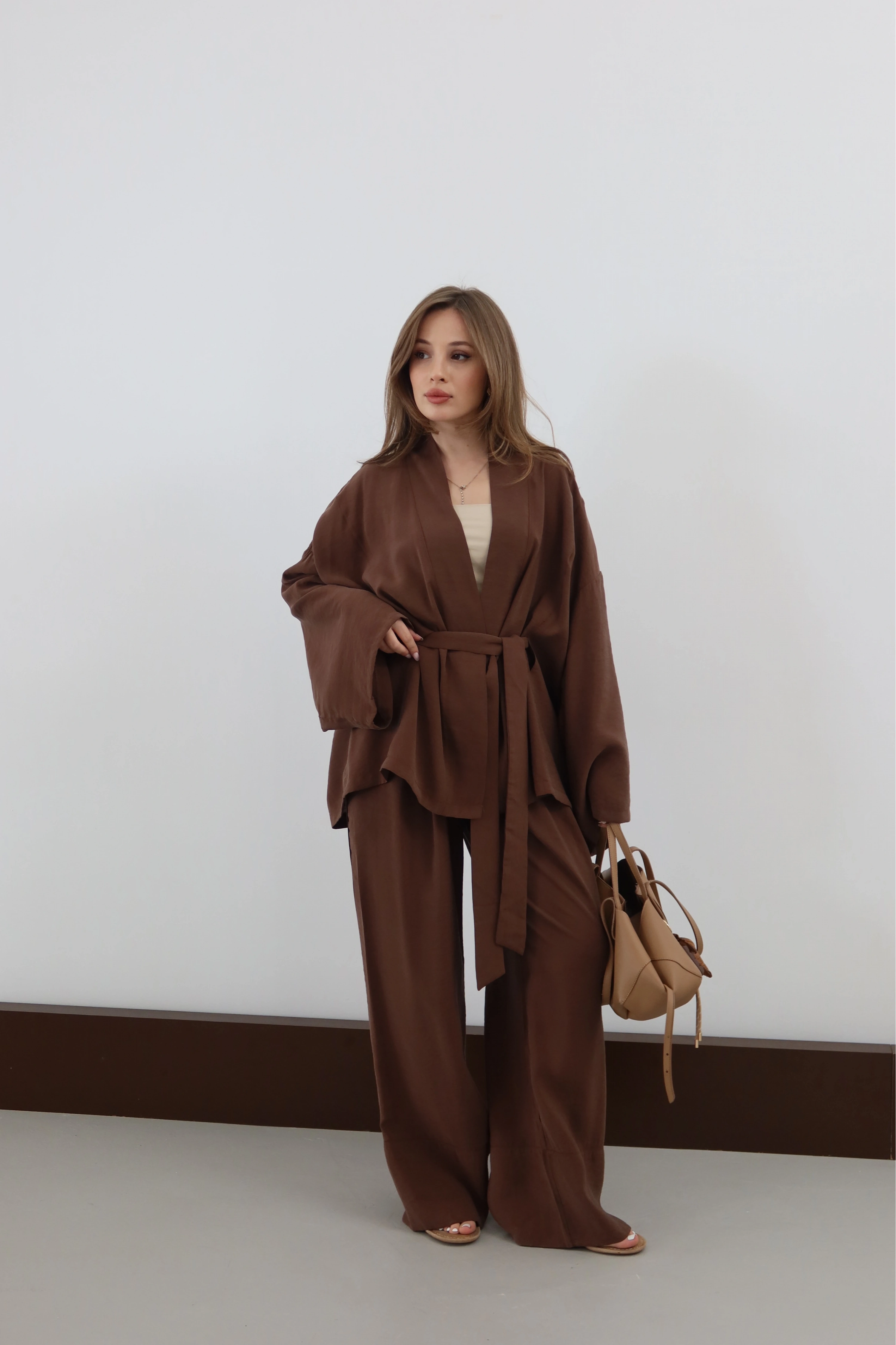 ROÉA’nın Modal Takımı, bedeni özgür bırakan kesimi ve ipeksi dokusuyla zahmetsiz şıklığın tanımını yeniden yapıyor. Kimono üstün zarif bağlama detayı bel hattınızı vurgularken, dökümlü pantolonuyla birleşerek bütünsel ve asil bir duruş sergiliyor. Doğal modal liflerinin nefes alan yapısı, gün boyu süren bir hafiflik sunarken; tasarımın yalınlığı sizi ev konforundan şehir şıklığına saniyeler içinde taşıyor.