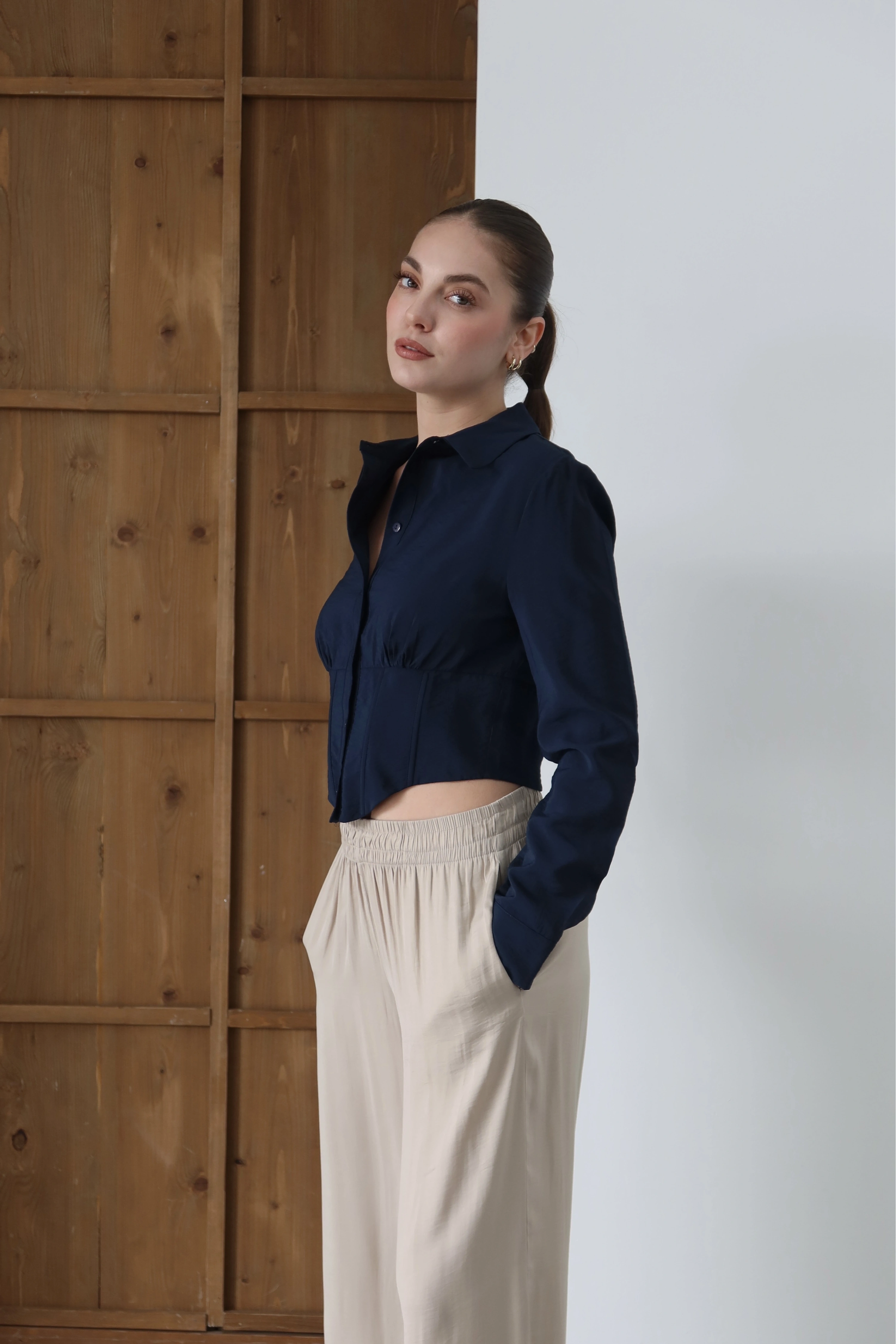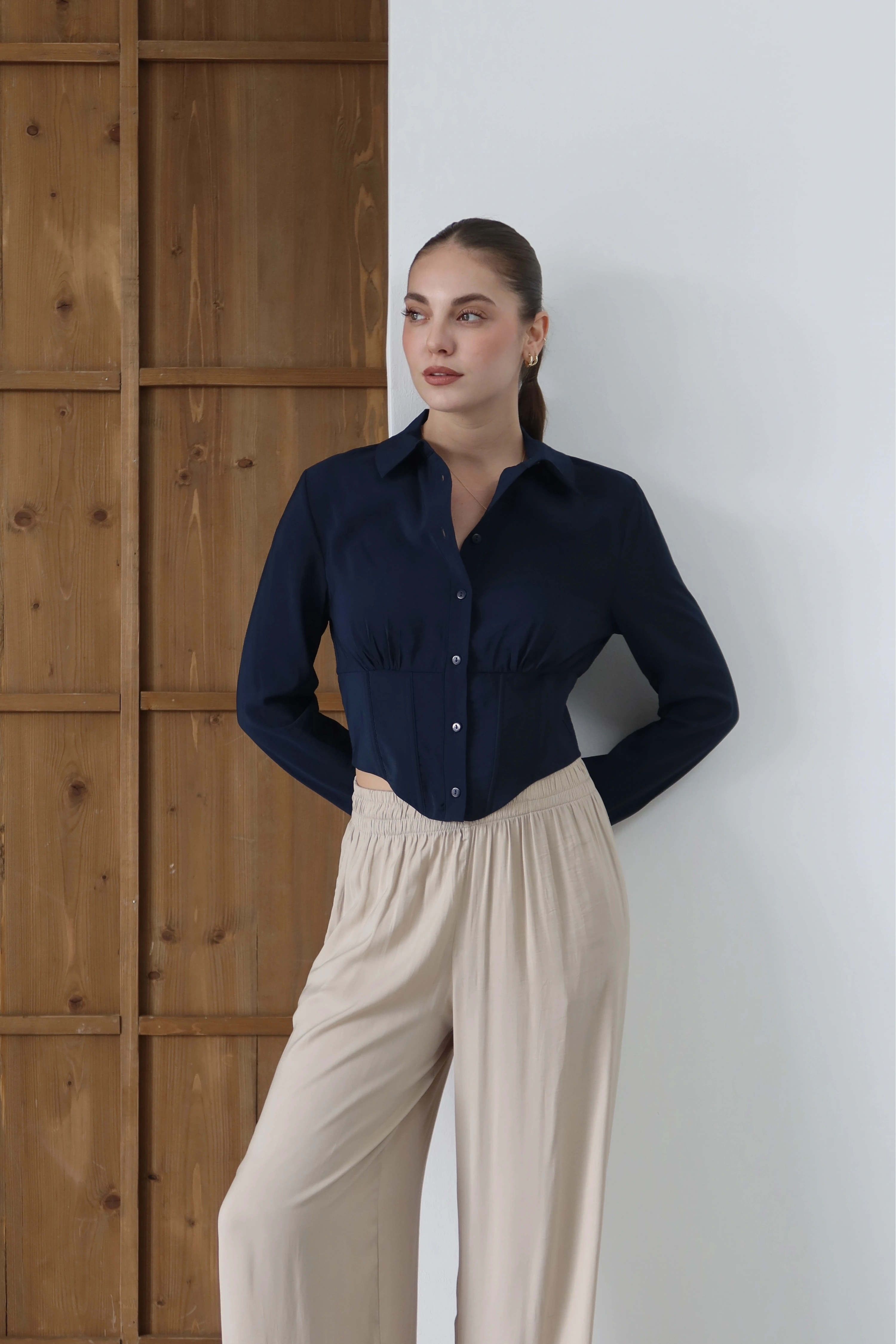 Geleneksel gömlek formunu, bel hattını vurgulayan mimari bir korse detayıyla yeniden tanımlıyoruz. Uzun kollu ve klasik yakalı yapısının yarattığı maskülen tavır, modern crop boyu ve beli sıkıca kavrayan yapısıyla feminen bir silüete dönüşüyor. Hem güçlü hem de zarif bir duruş sergileyen bu parça, modern şehir gardırobunun en karakteristik oyuncularından biri.