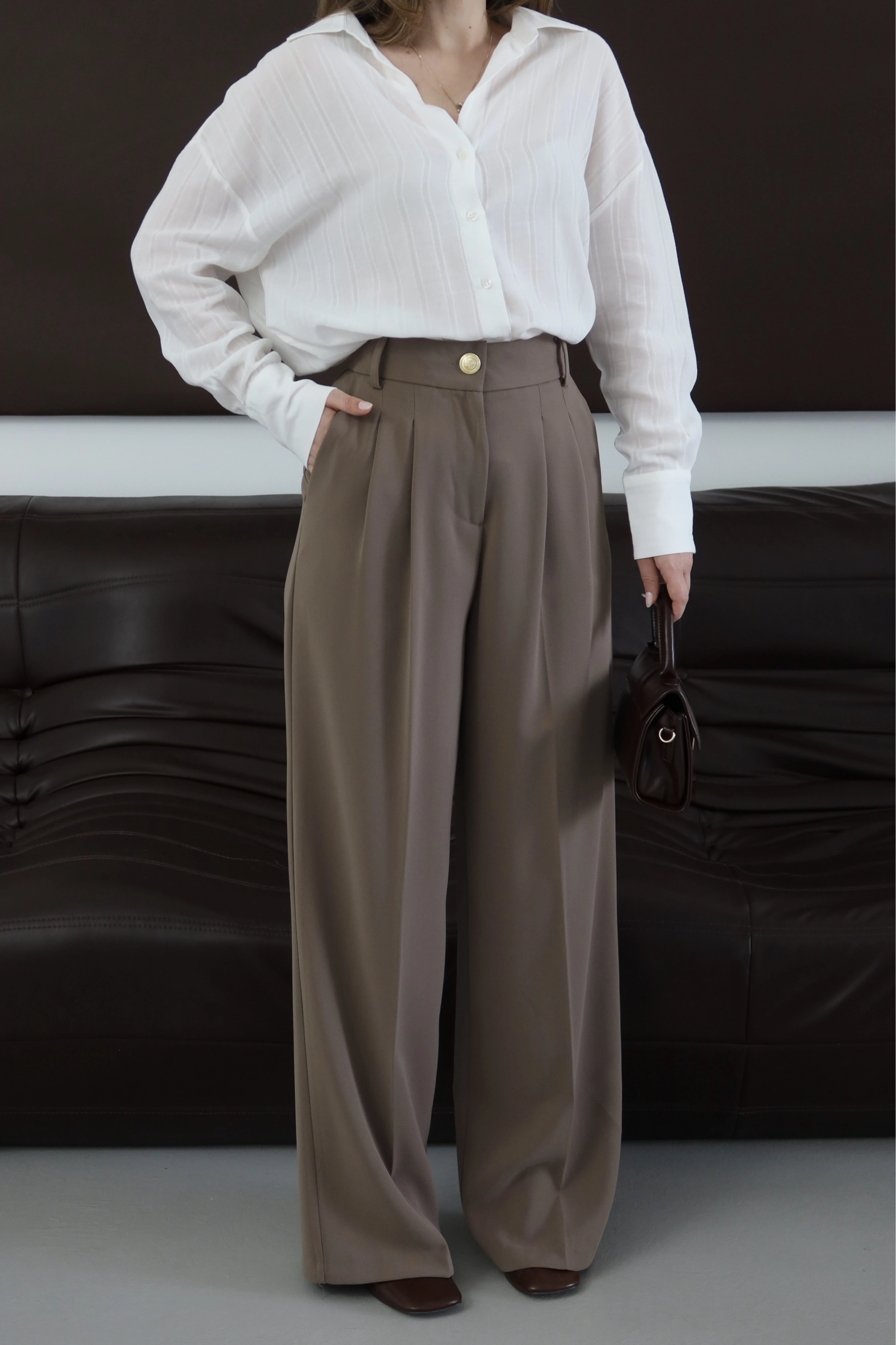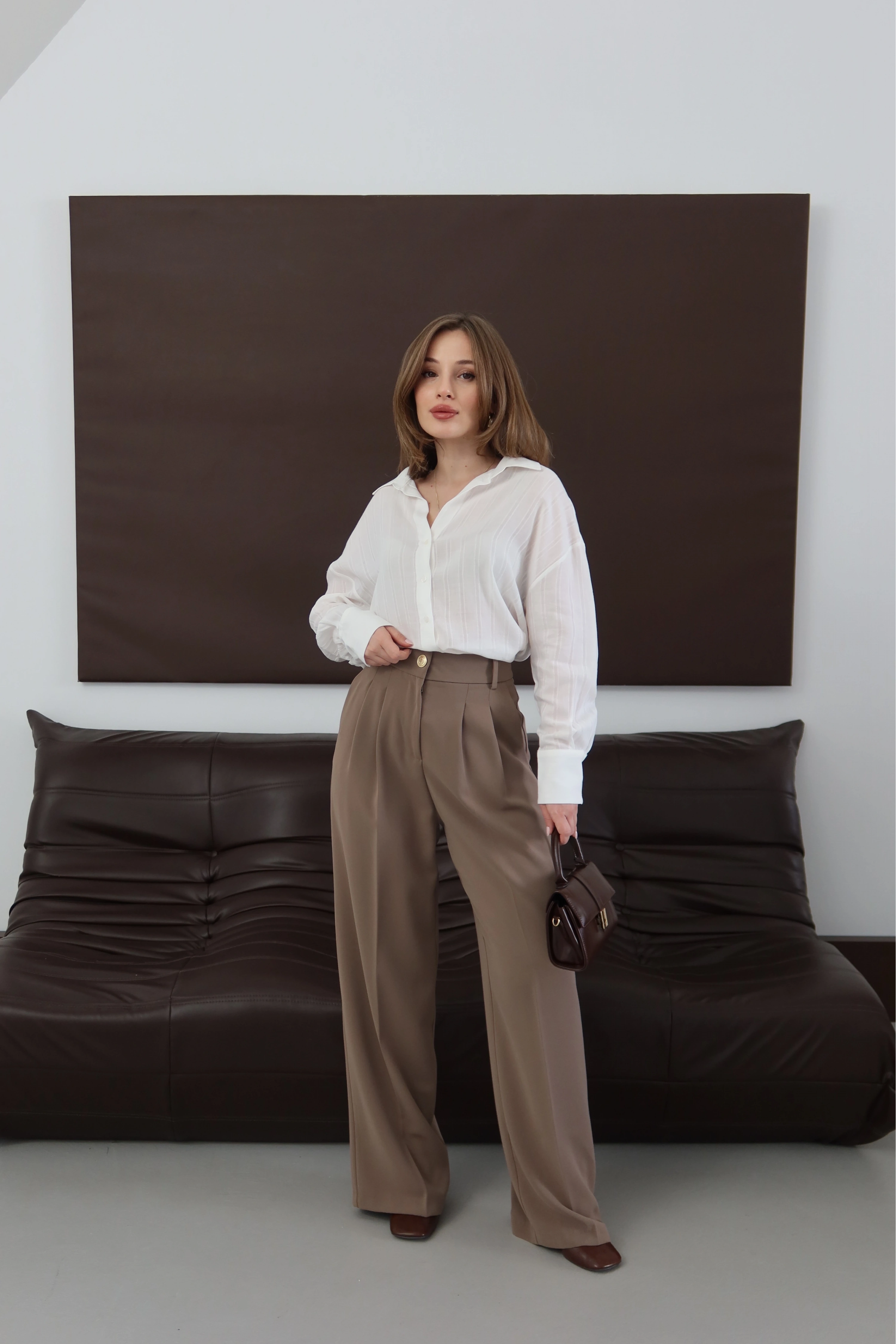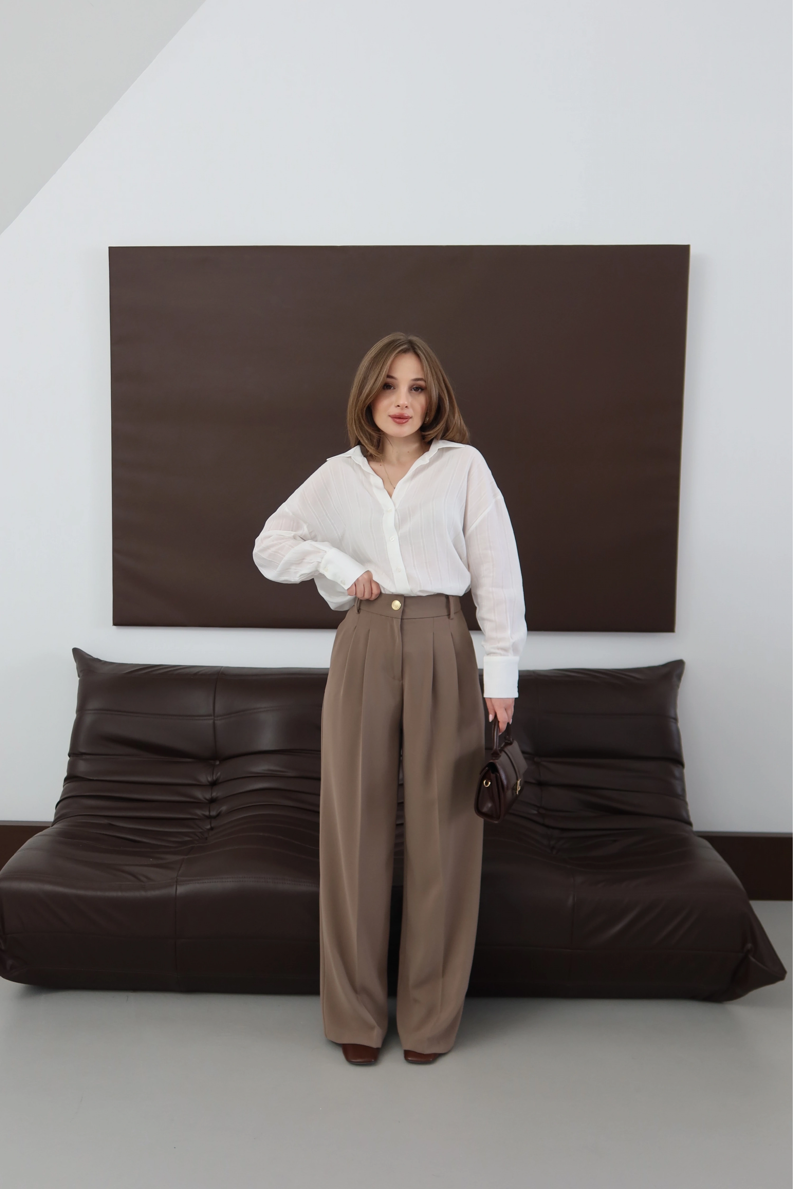 ROÉA’nın tasarım vizyonuyla yeniden hayat bulan bu klasik pantolon, geleneksel şıklığı beli lastikli yapısının sunduğu eşsiz konforla birleştiriyor. Kusursuz bir ütü izi ve keskin hatlarla şekillenen maskülen silüet, cep kısımlarında yer alan ikonik gold düğme detaylarıyla feminen bir ışıltı kazanıyor. Gün boyu formunu kaybetmeyen yüksek kaliteli kumaşı ve bele tam oturan elastik yapısı, stilden ödün vermeden özgürce hareket etmenizi sağlıyor.