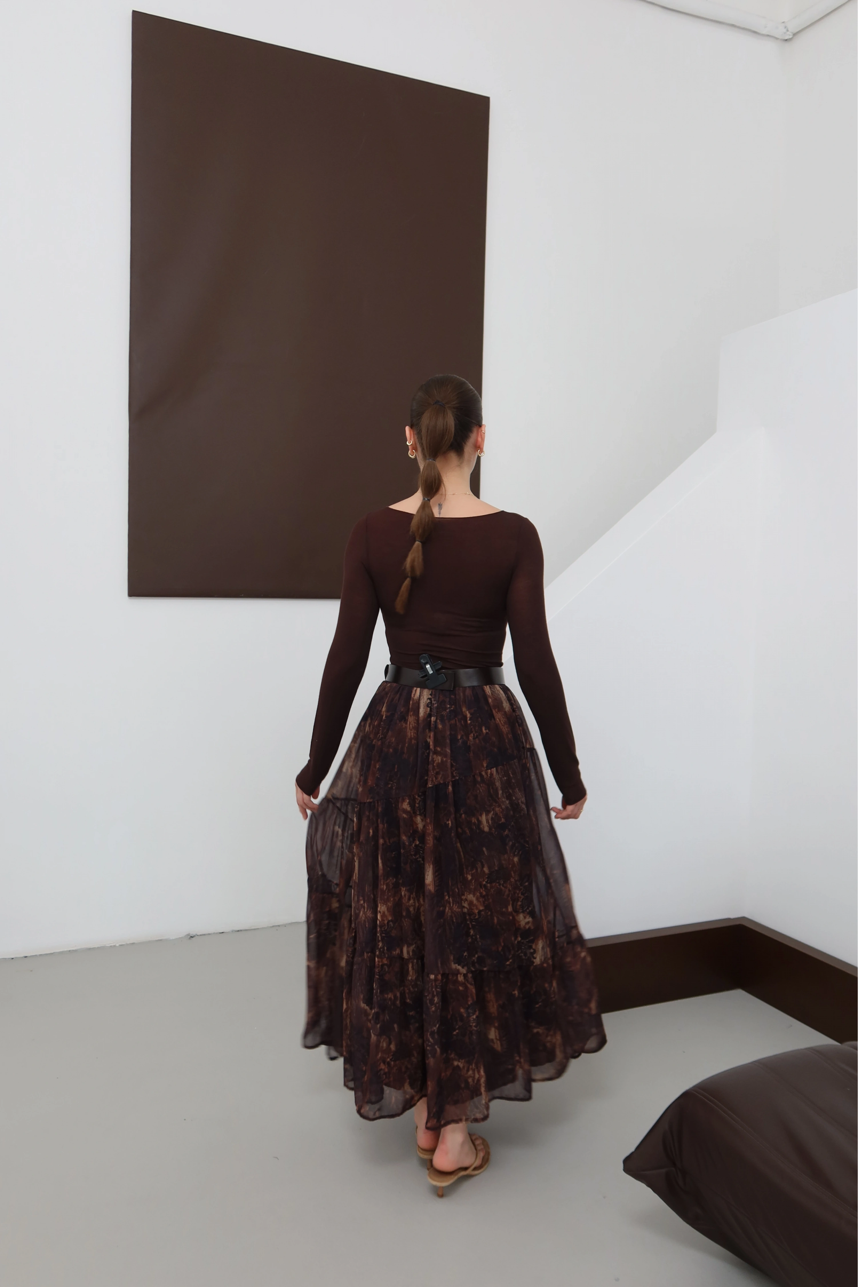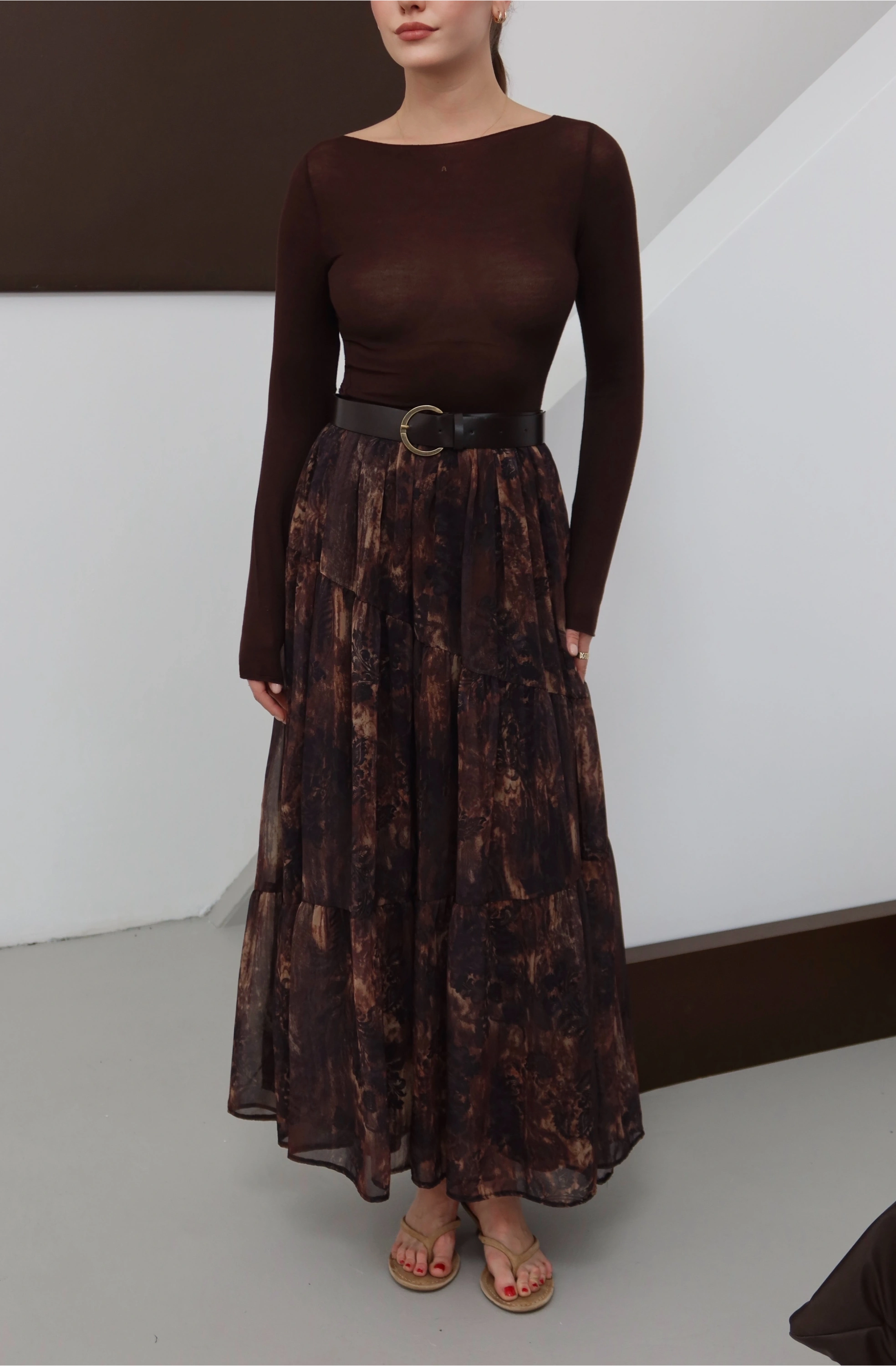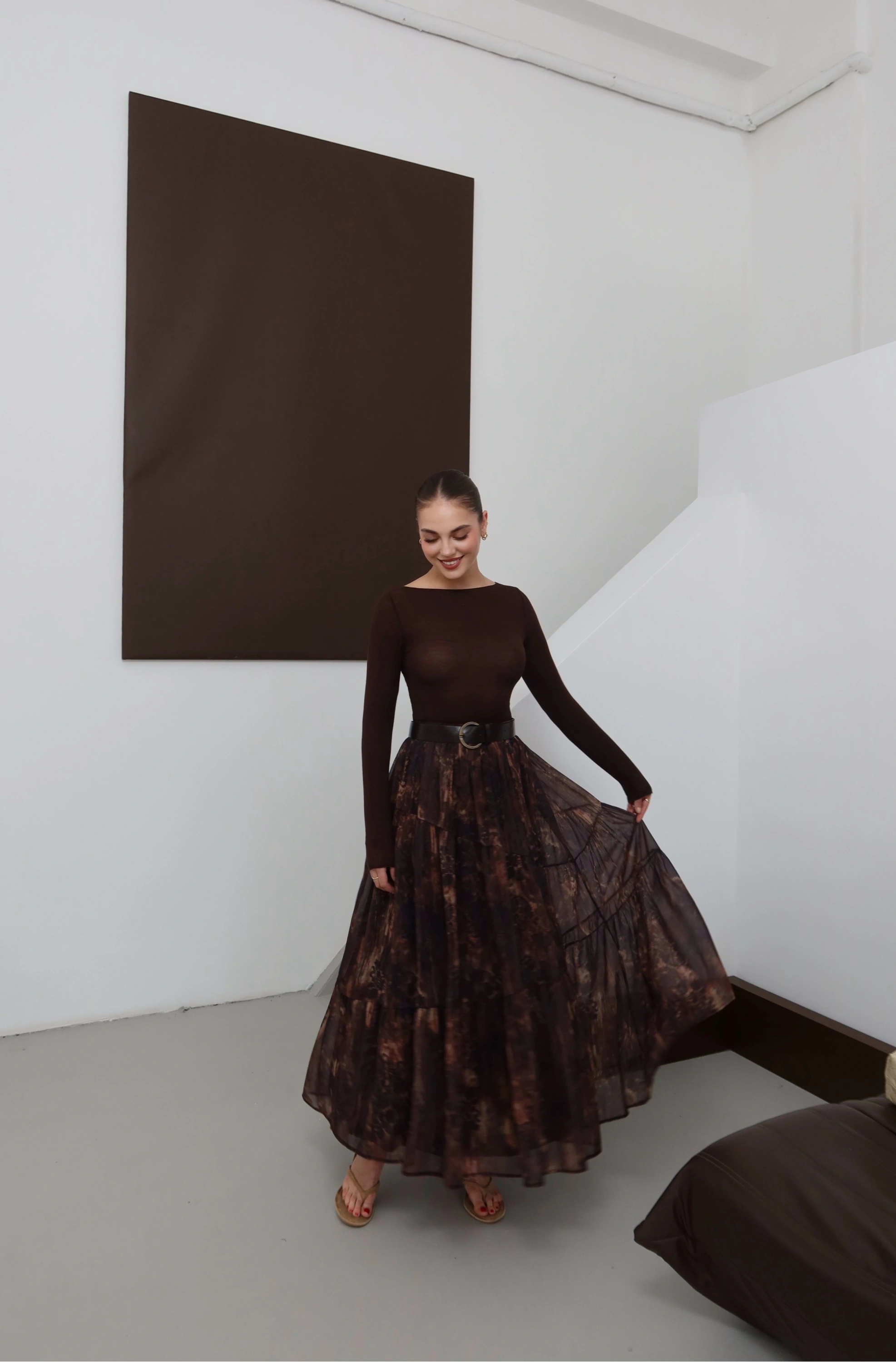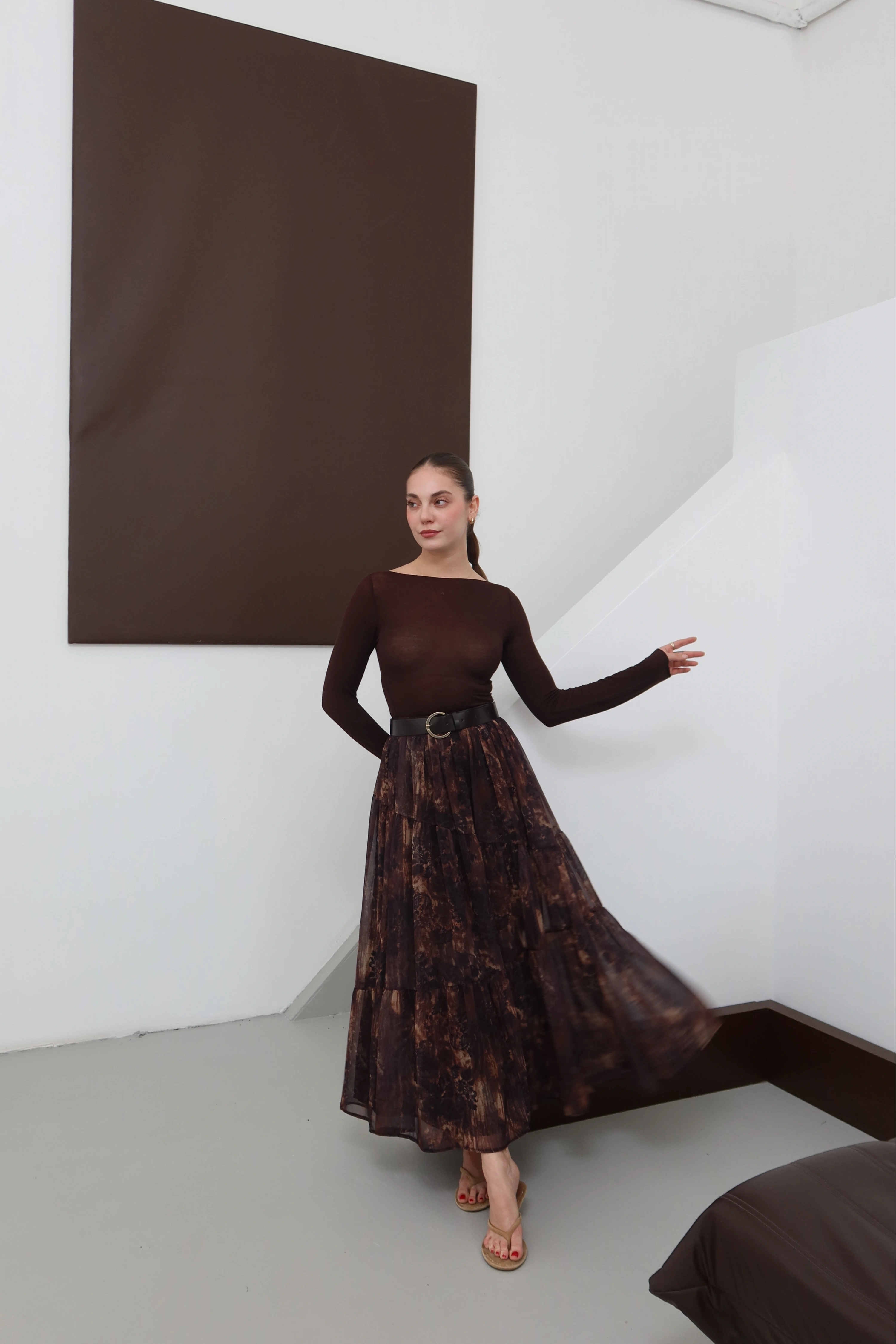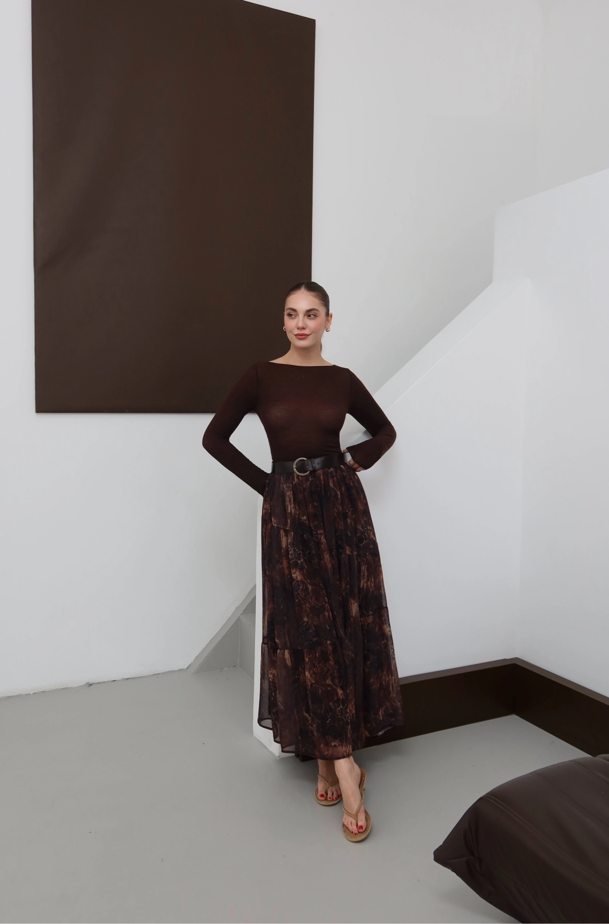 Desenli Kemerli Astarlı Midi Boy Etek Kahve