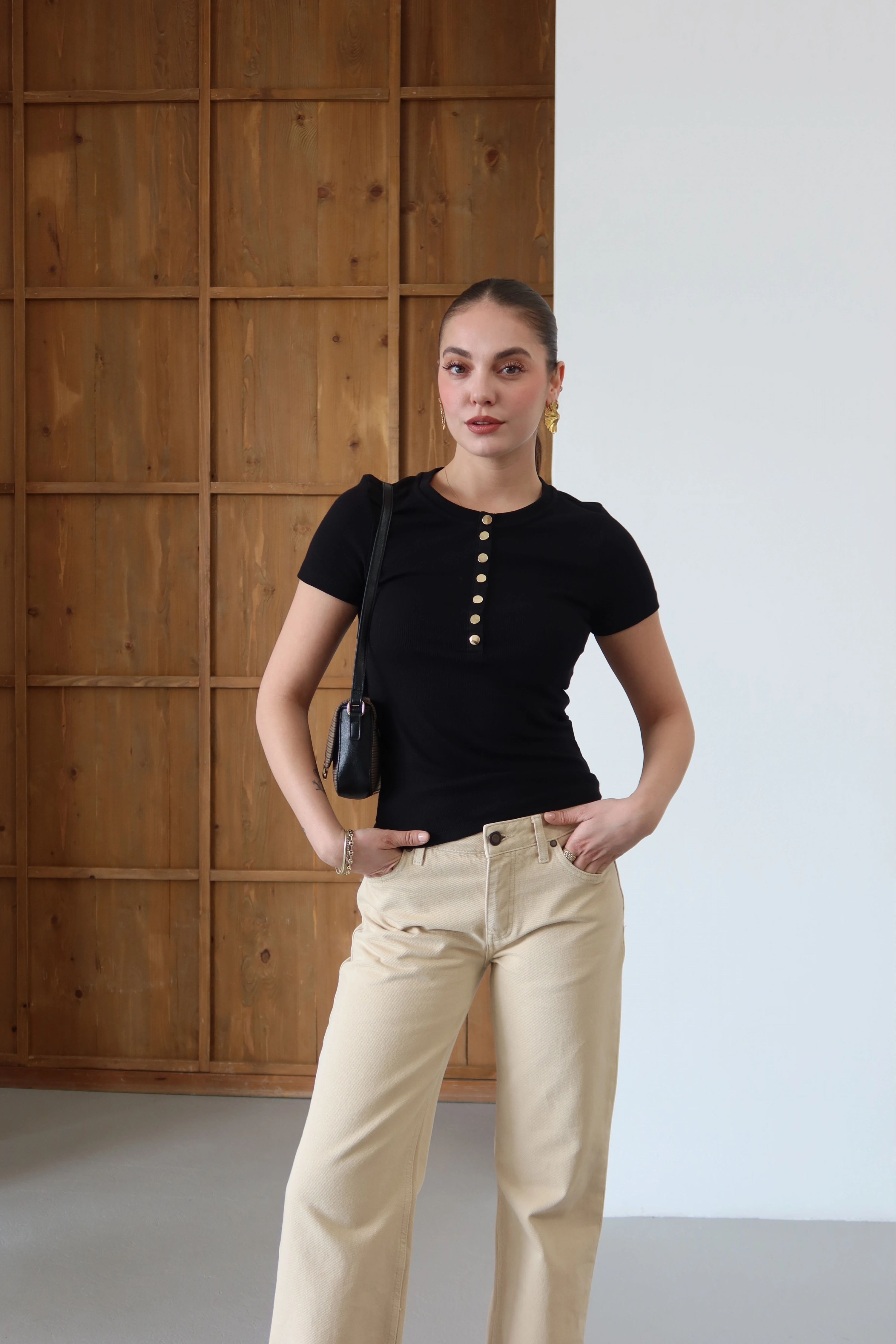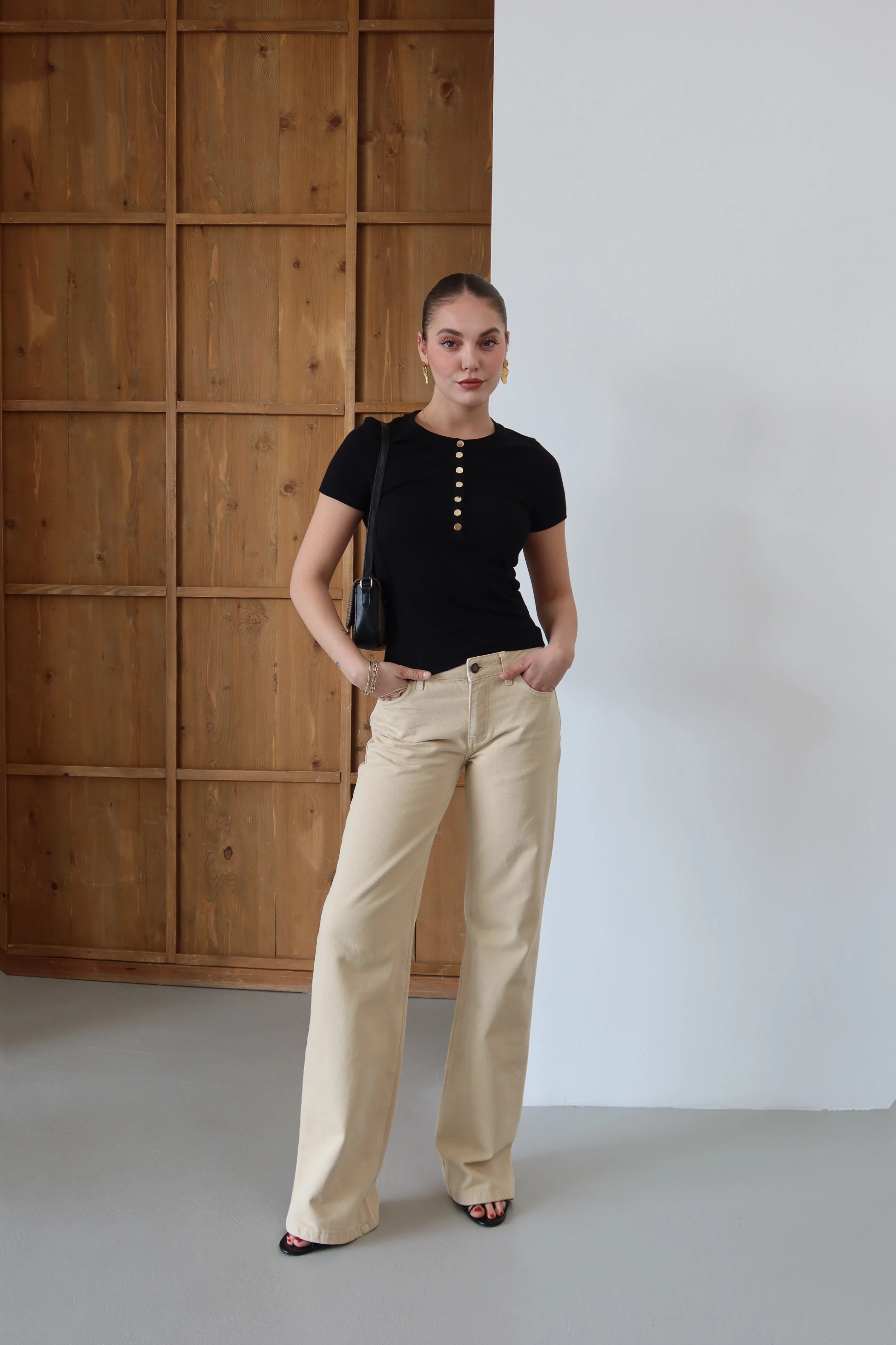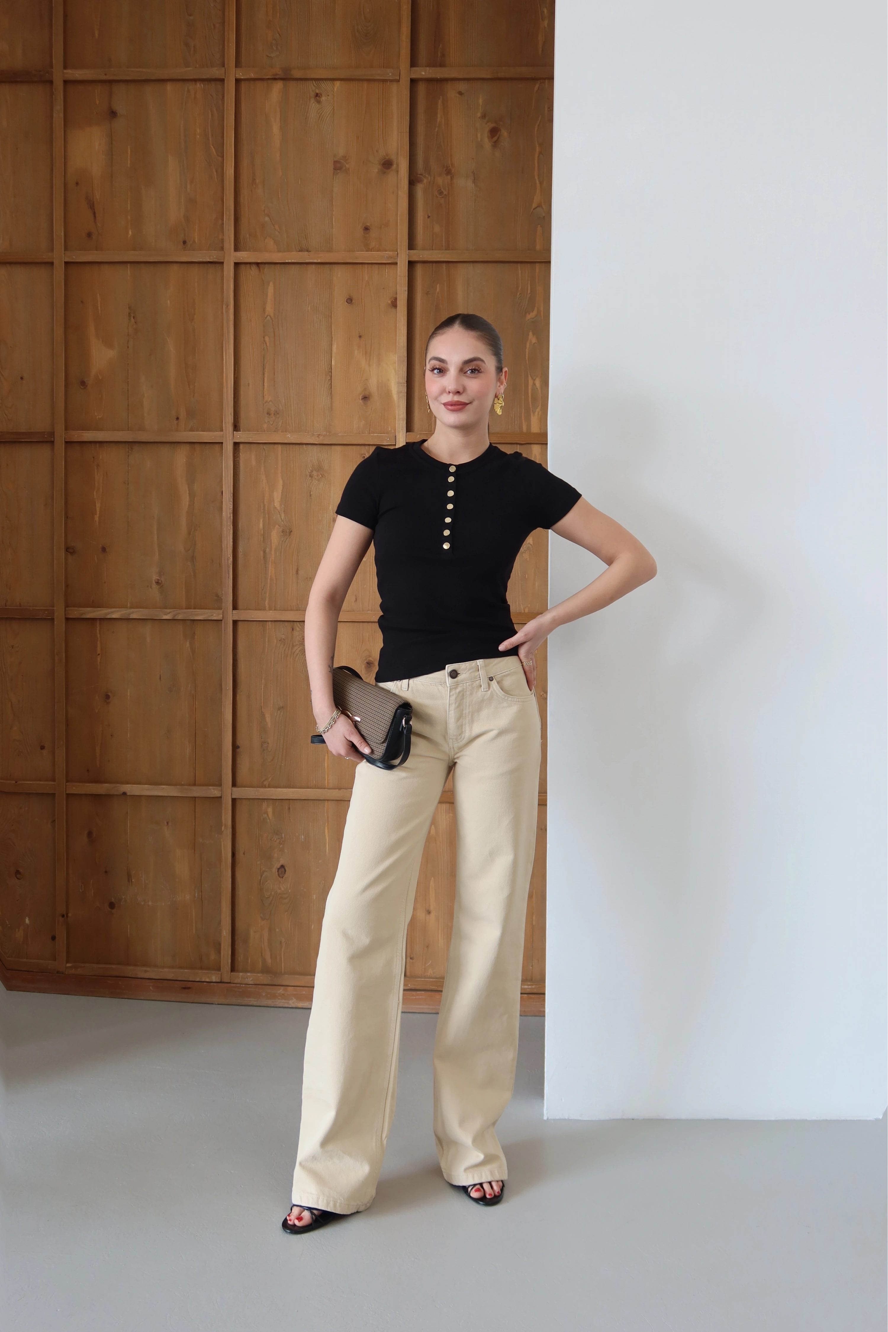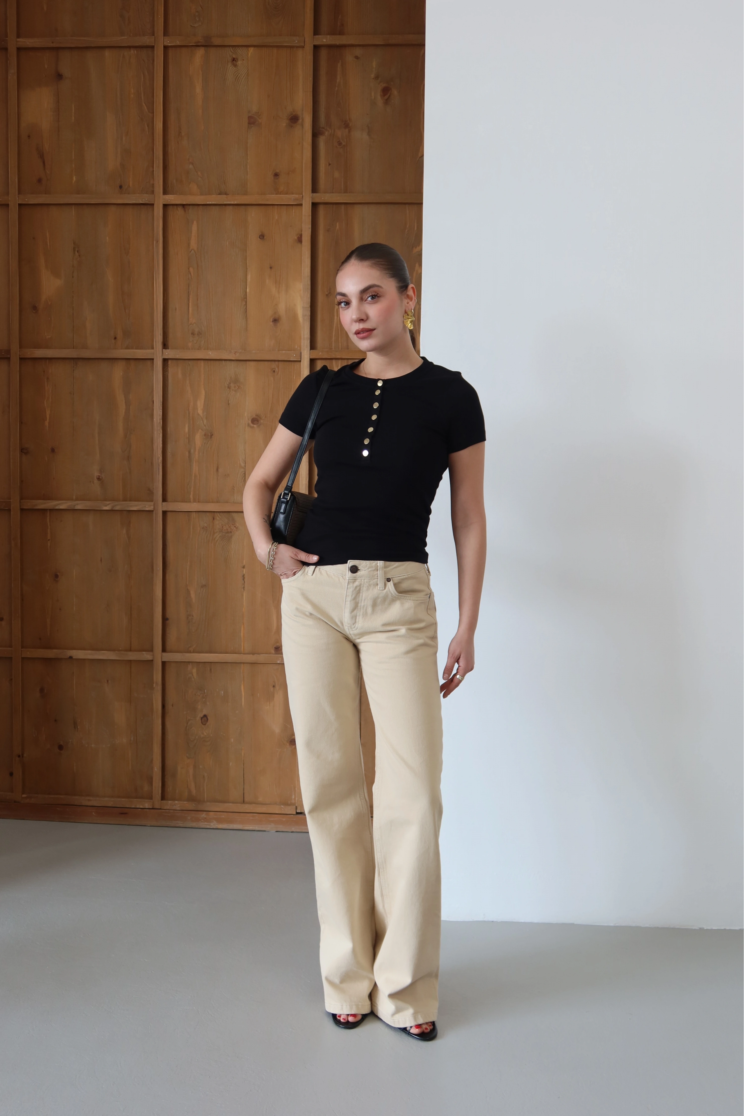Düşük belin karakteristik duruşu, dizden hafifçe açılan bootcut paça kesimiyle dengeleniyor. Bej tonunun doğal dinginliği, denimin güçlü dokusuna yumuşak bir estetik katıyor. Silüeti zarifçe uzatan ve hareket özgürlüğünü merkeze alan bu tasarım, nostaljik bir formu modern şehir hayatına adapte ediyor.