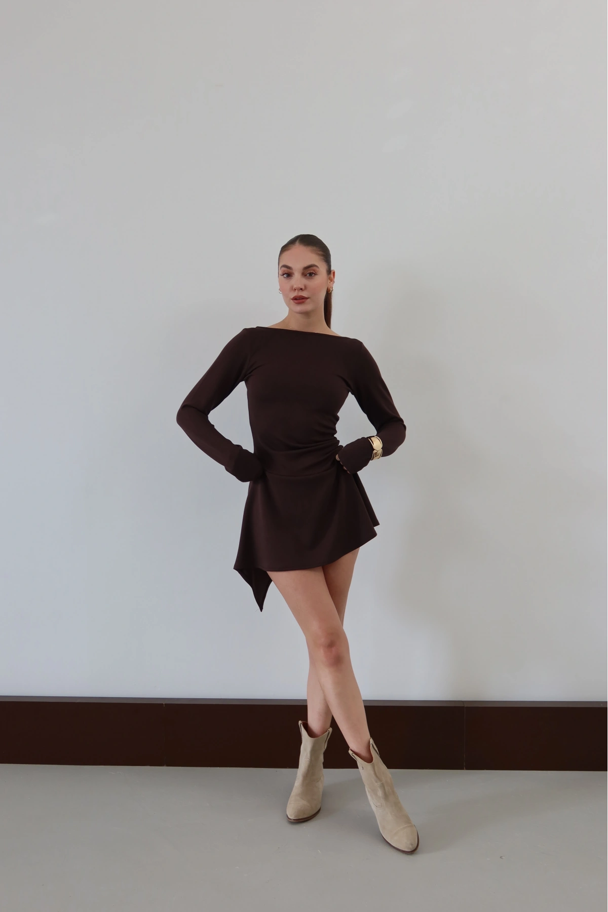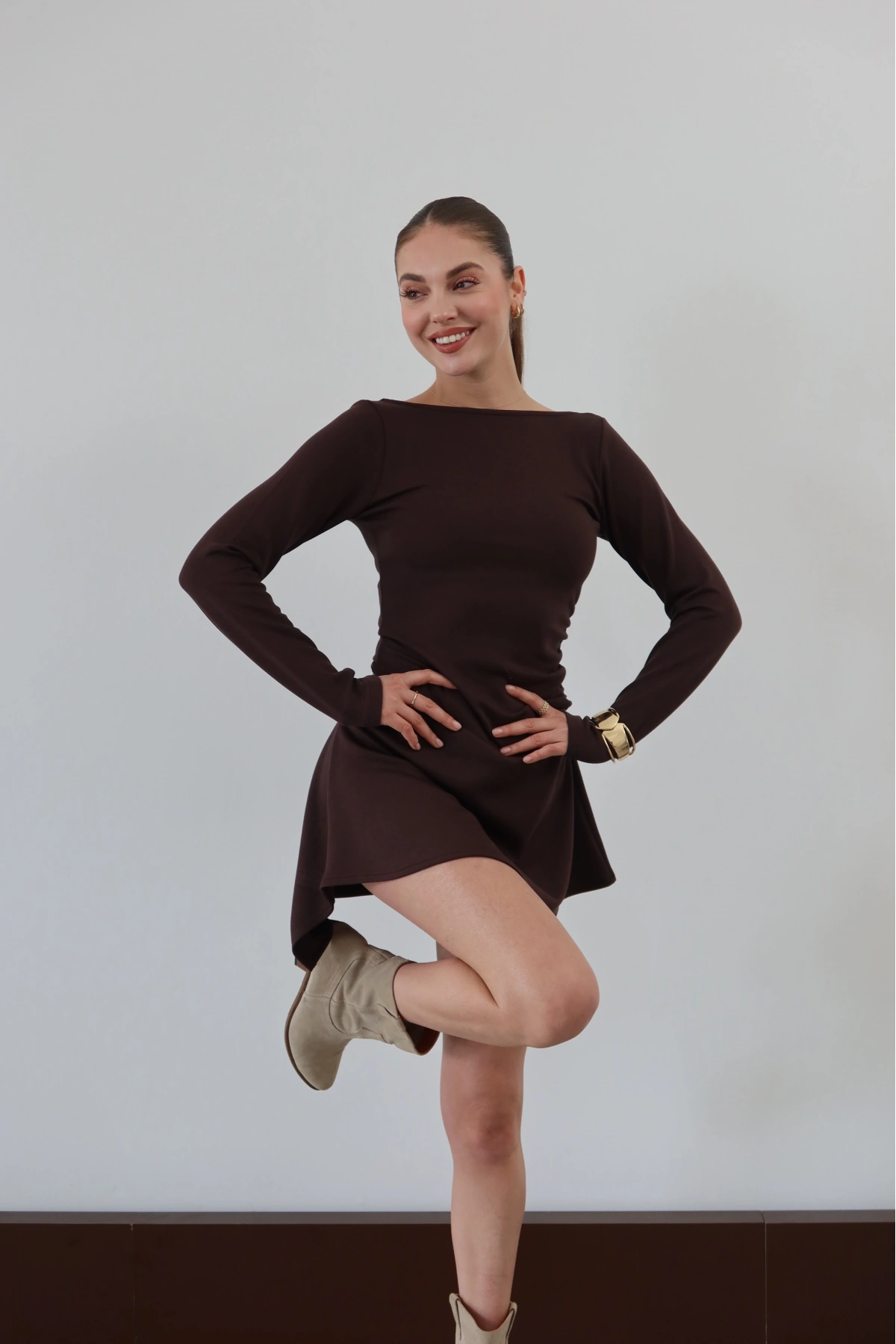 Sırt Detaylı Uzun Kollu Elbise Kahve