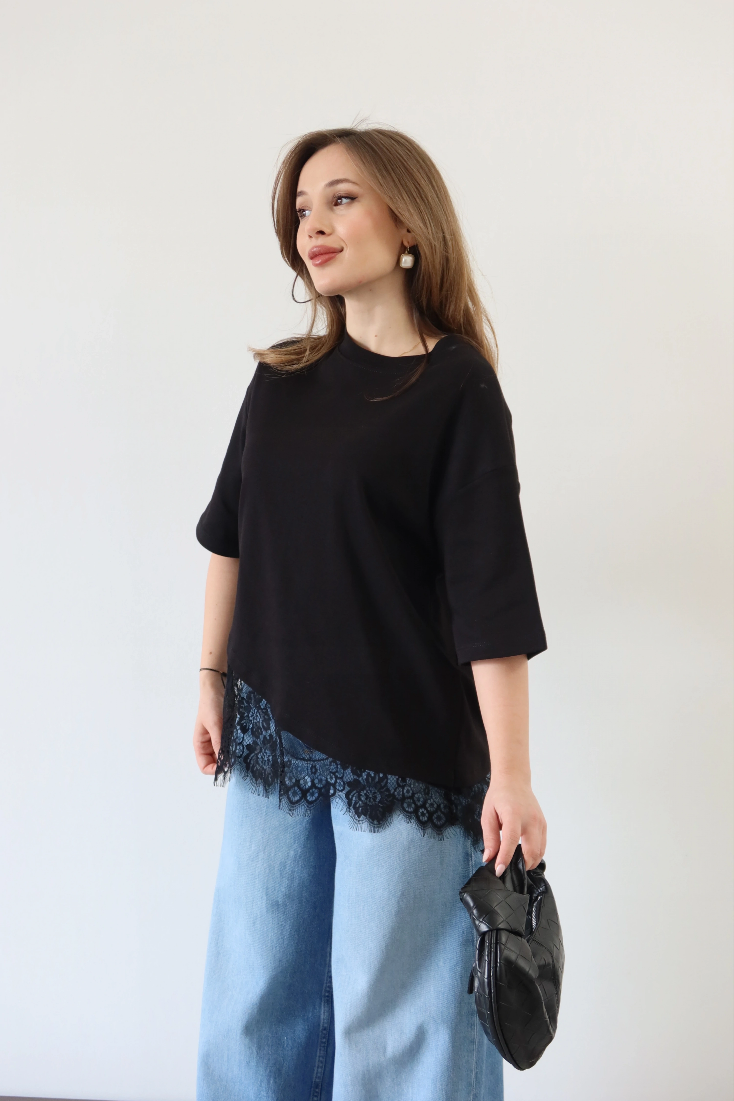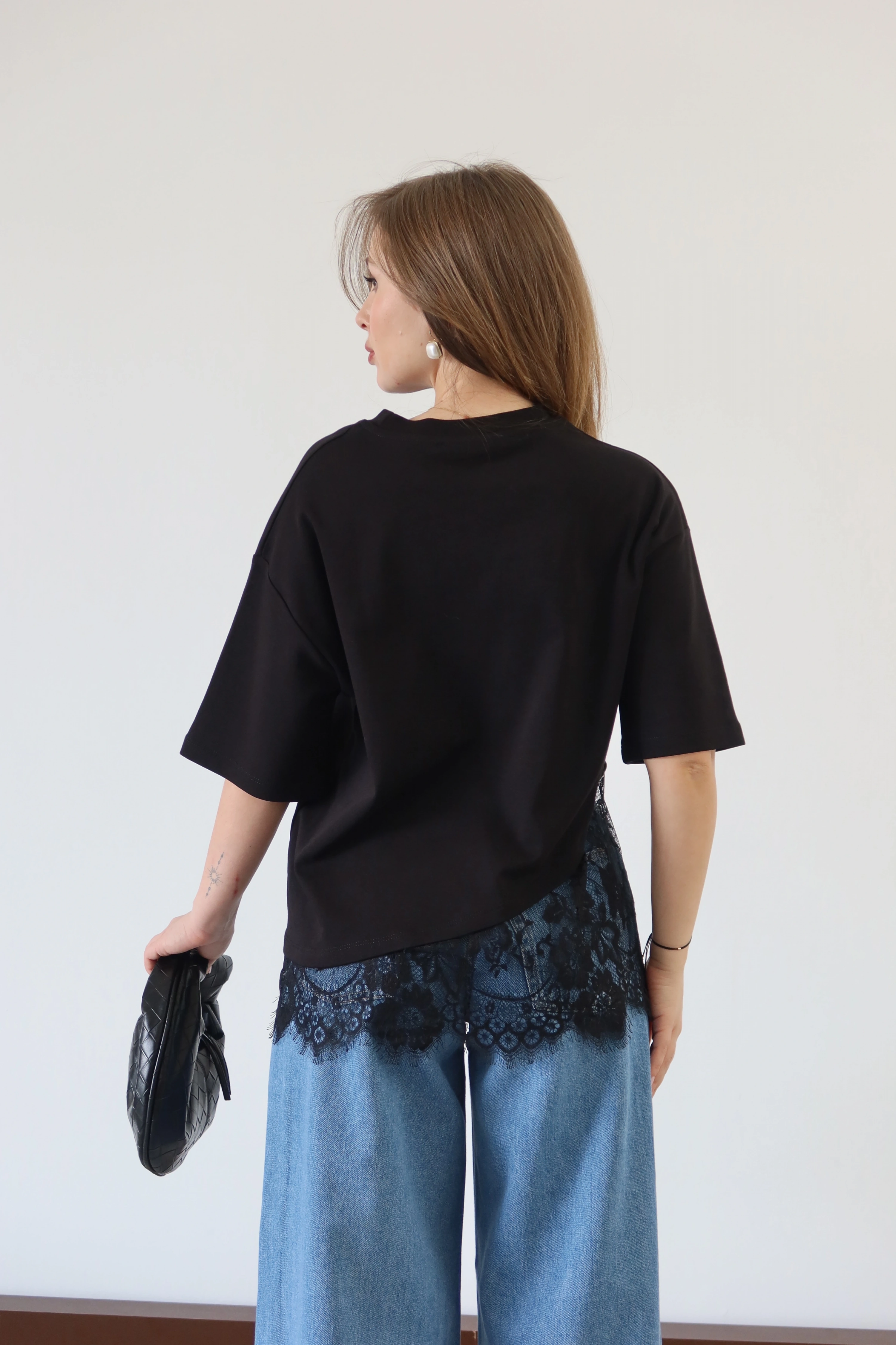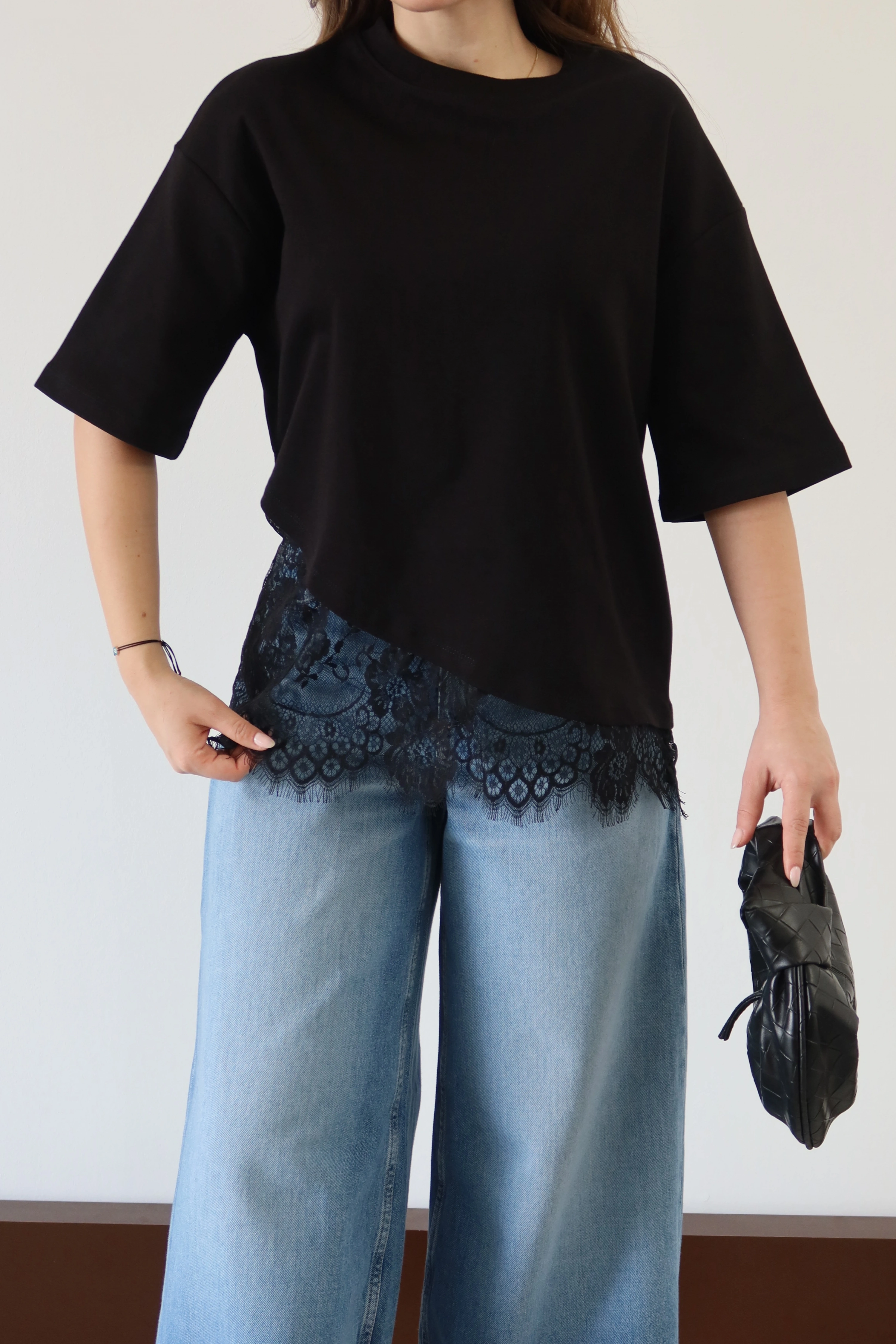 ROÉA Eteği Dantelli T-shirt, günlük gardırobunuzun en rahat parçasını bir tasarım objesine dönüştürüyor. Yumuşak, nefes alan pamuklu dokusu t-shirt konforunu sunarken; etek ucundaki zarif dantel işlemesi stilinize beklenmedik bir zarafet katıyor. Katmanlı giyimin en şık temsilcisi olan bu parça, hem tek başına hem de kısa ceketlerin altından sarkan dantel detayıyla göz kamaştırmak için tasarlandı.