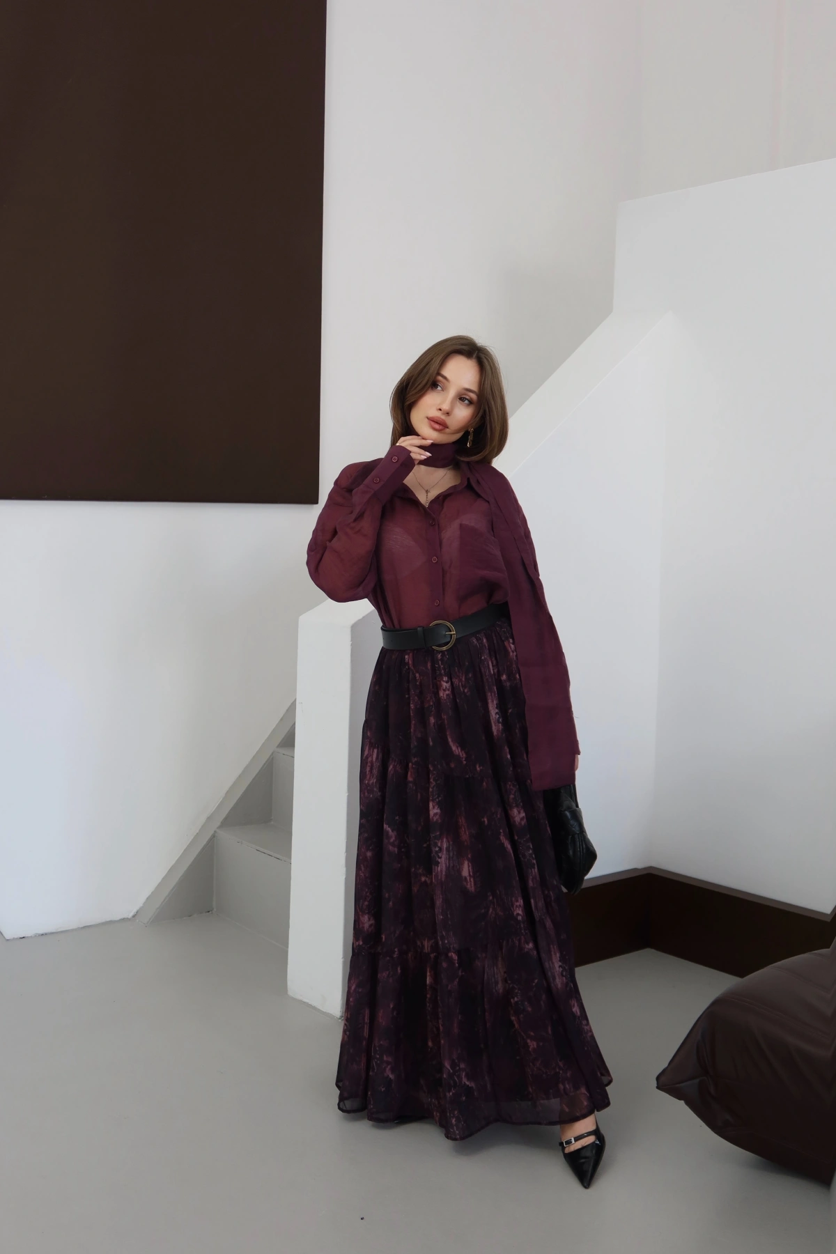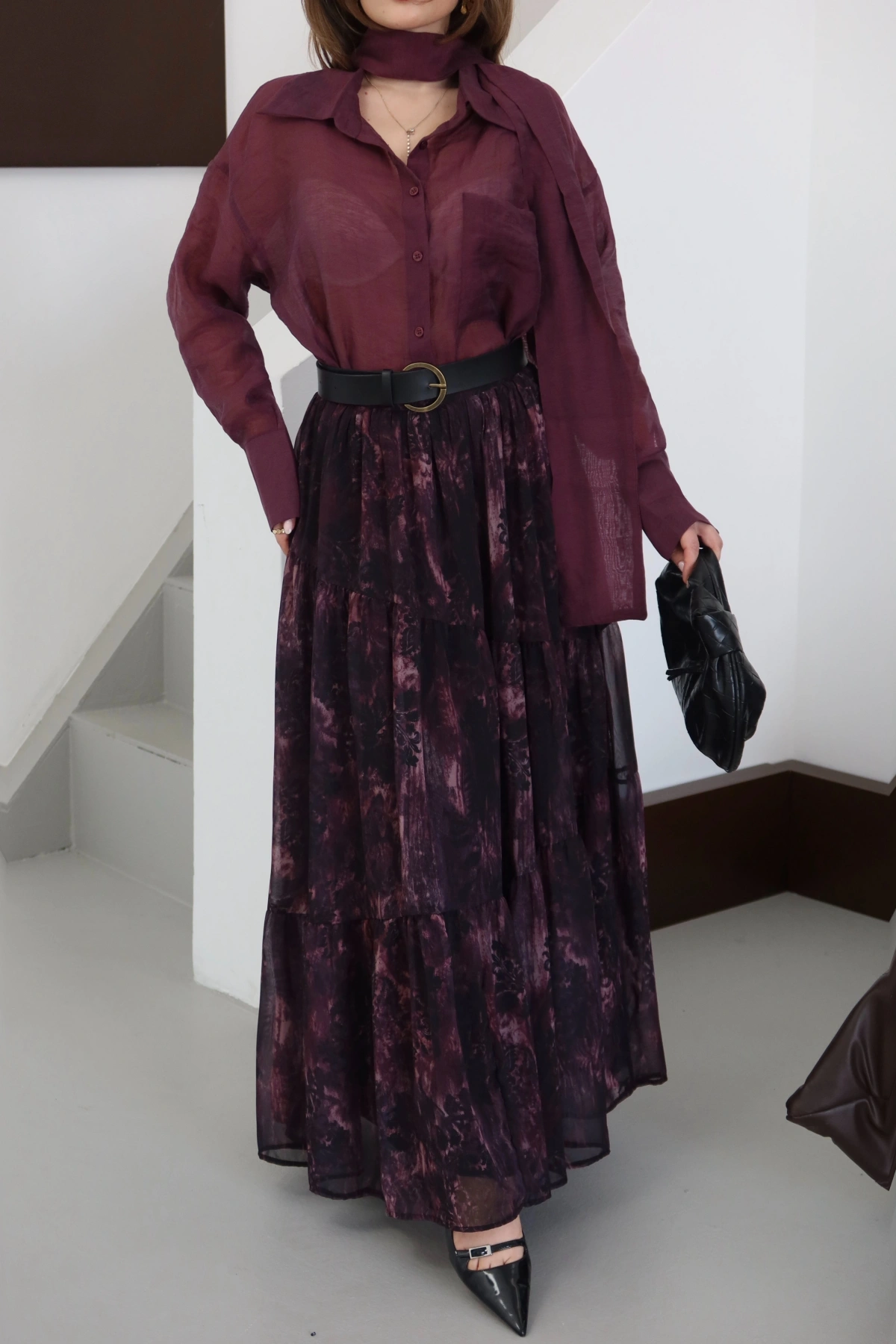 Desenli Kemerli Astarlı Midi Boy Etek Mürdüm