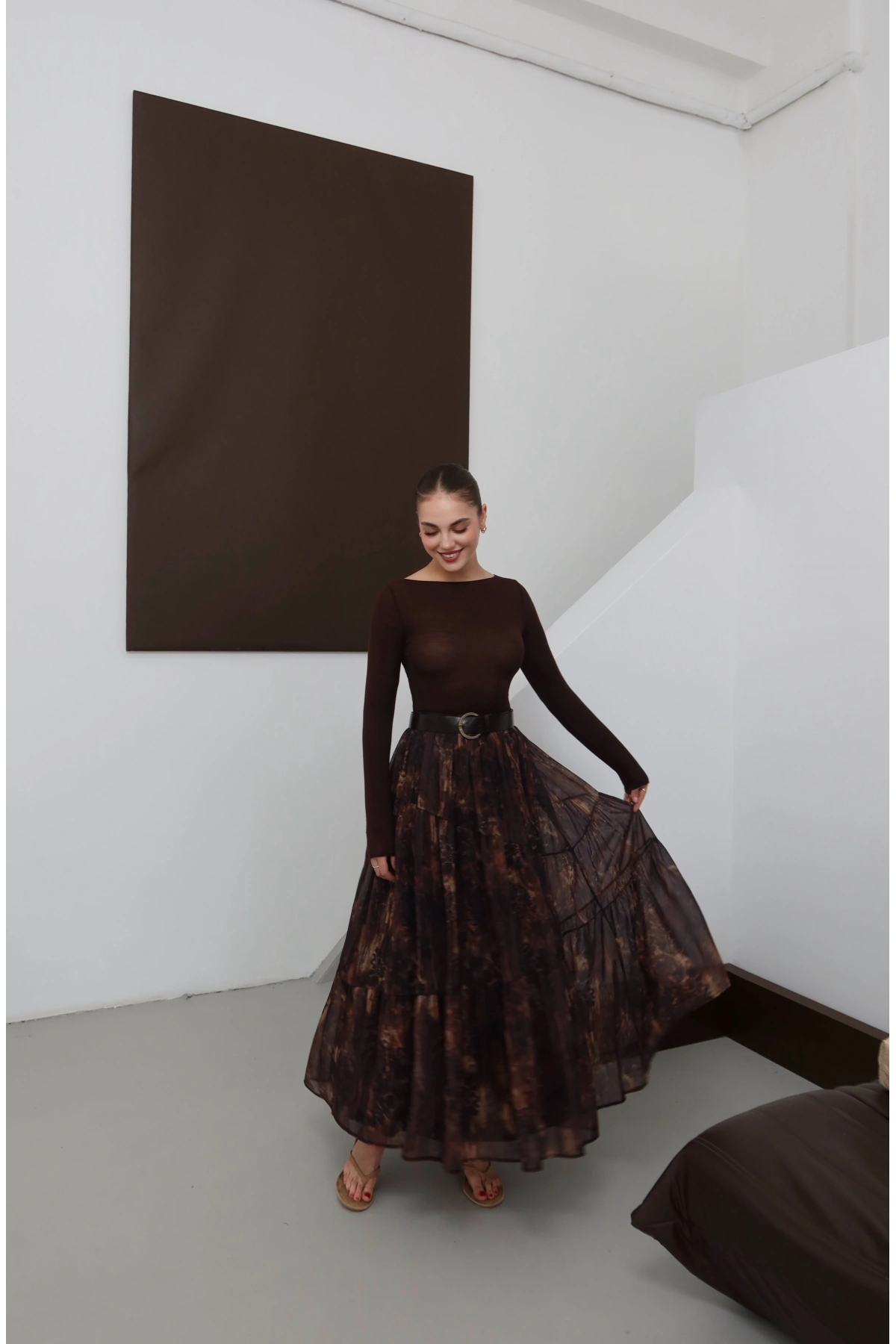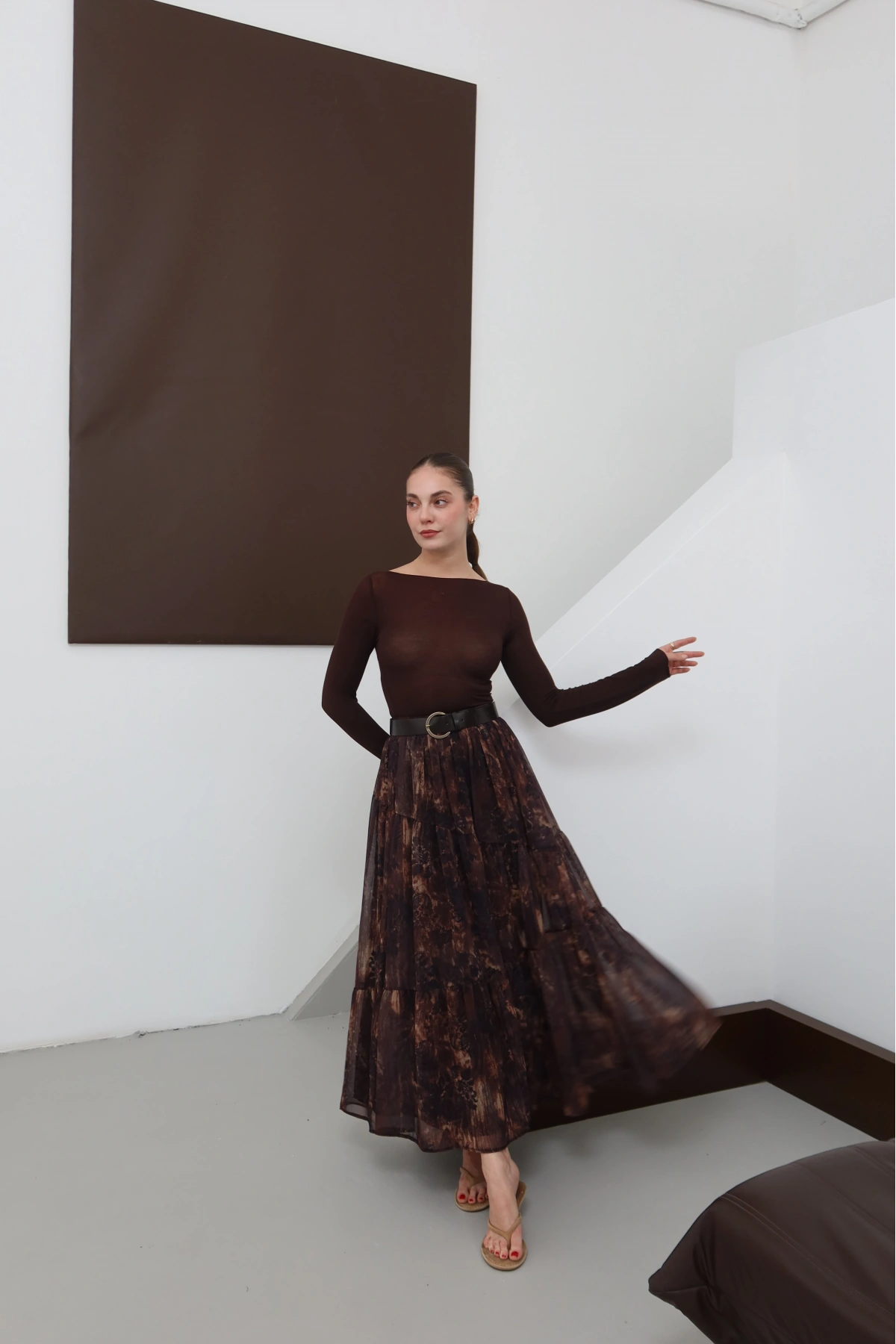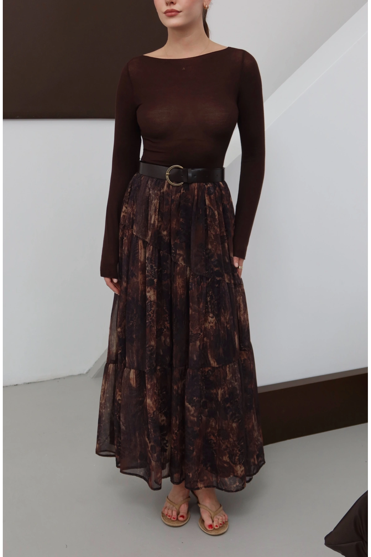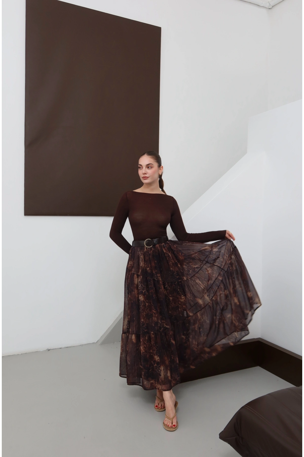 Desenli Kemerli Astarlı Midi Boy Etek Kahve