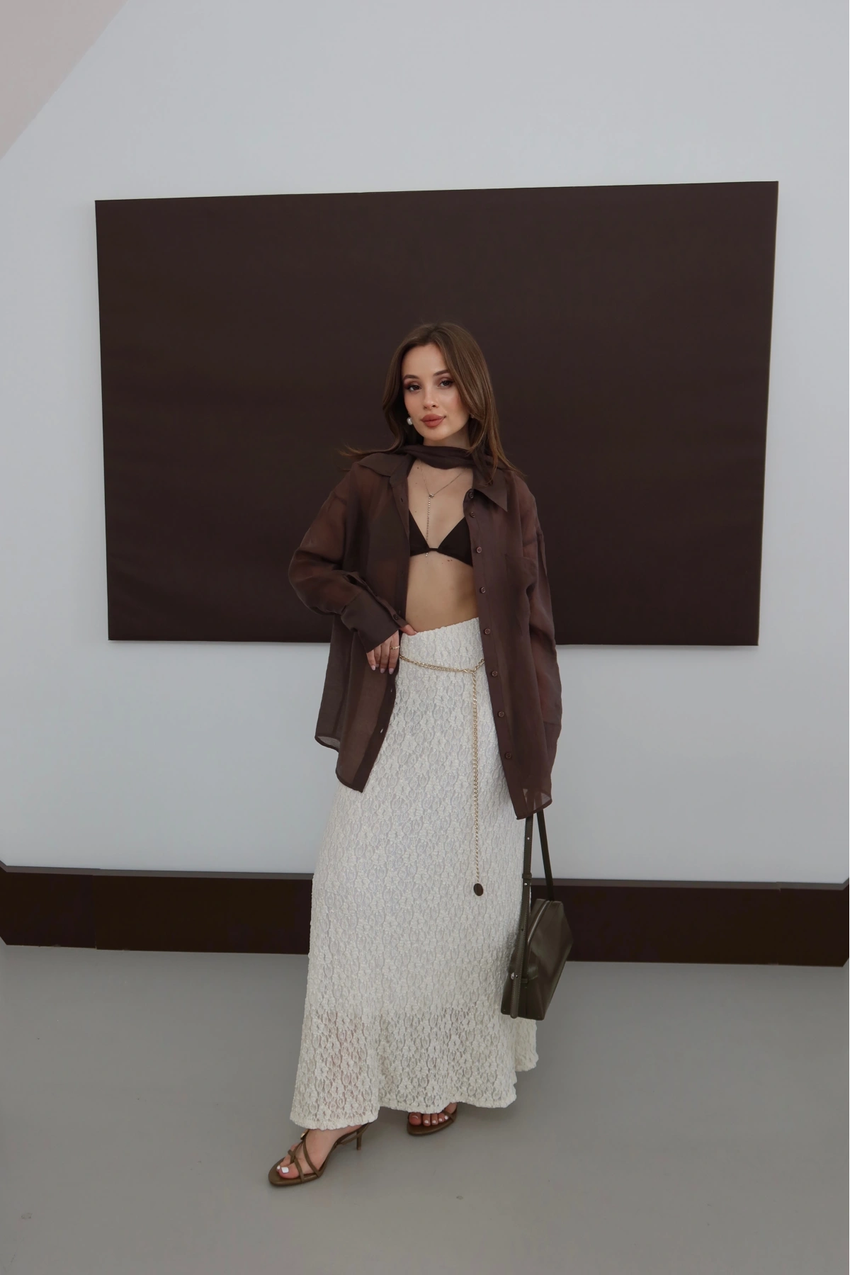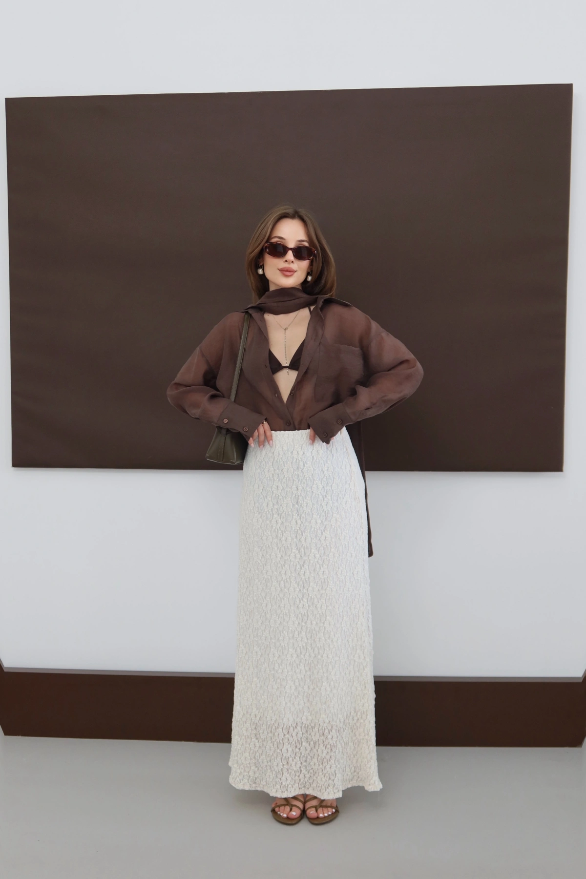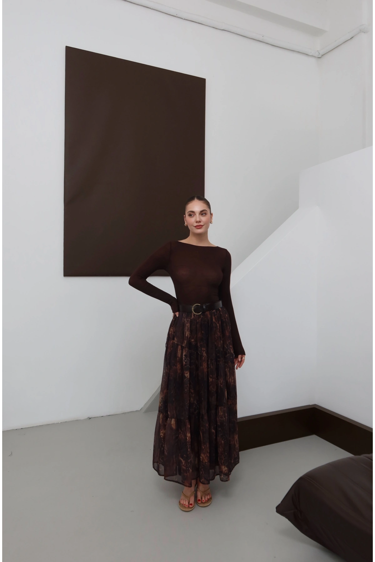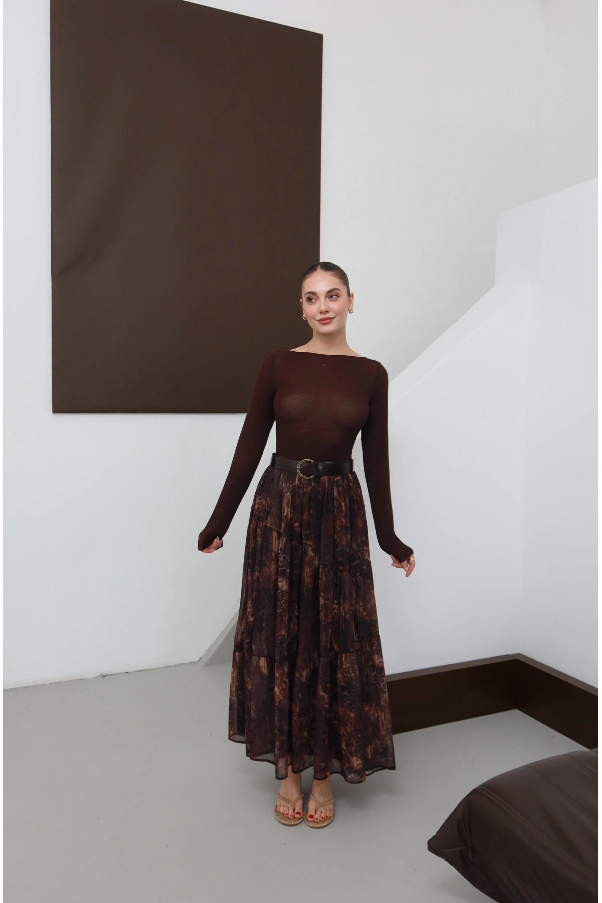 Desenli Kemerli Astarlı Midi Boy Etek Kahve