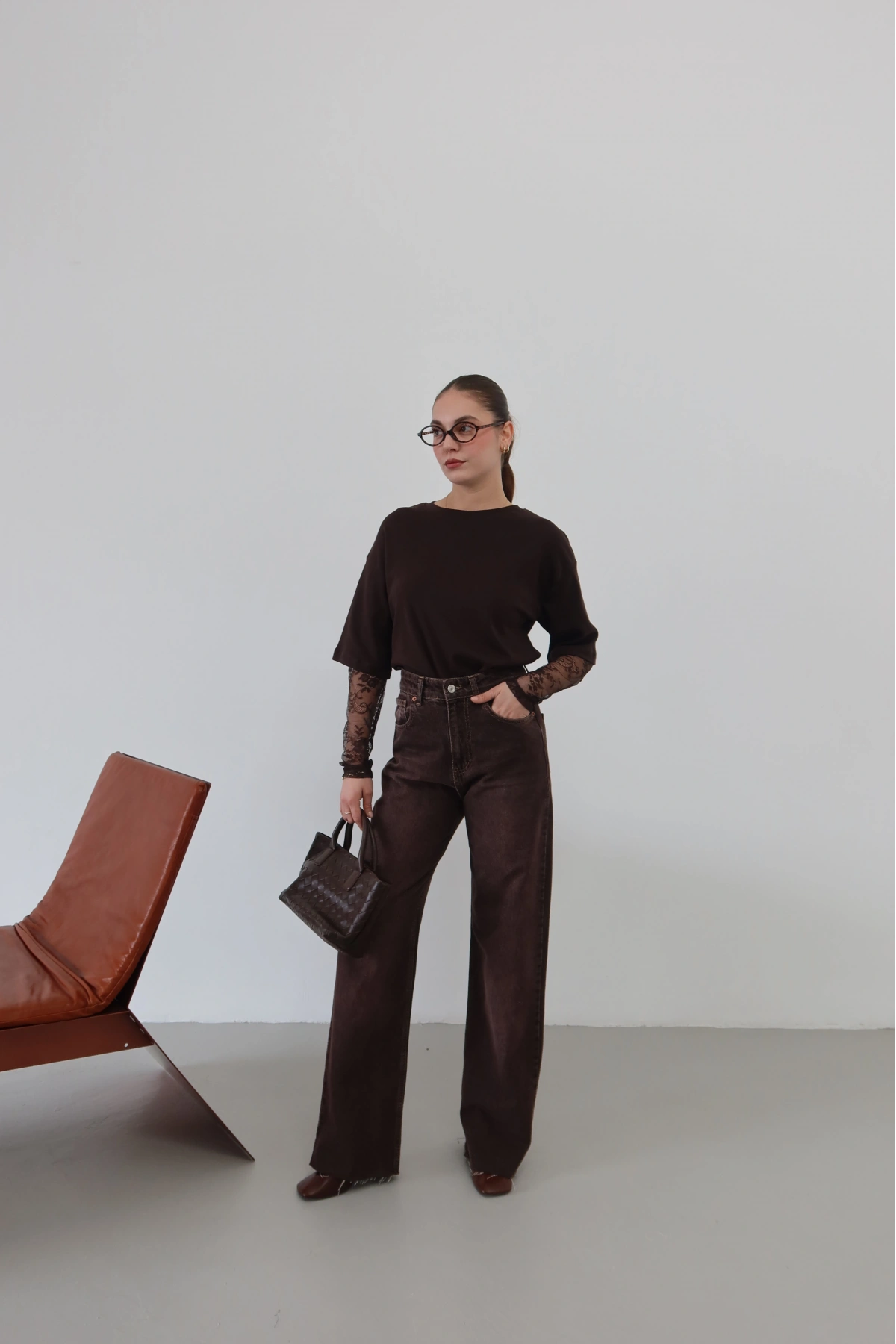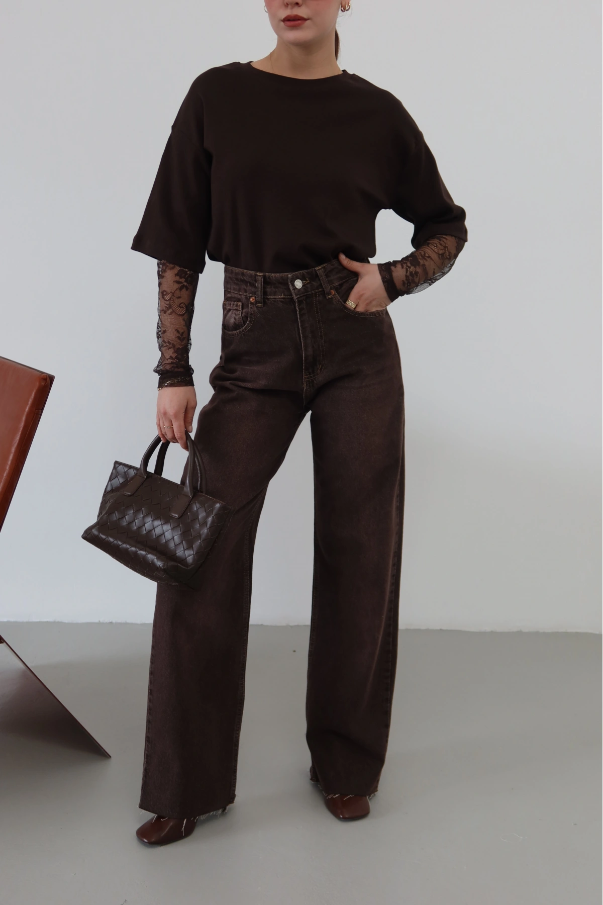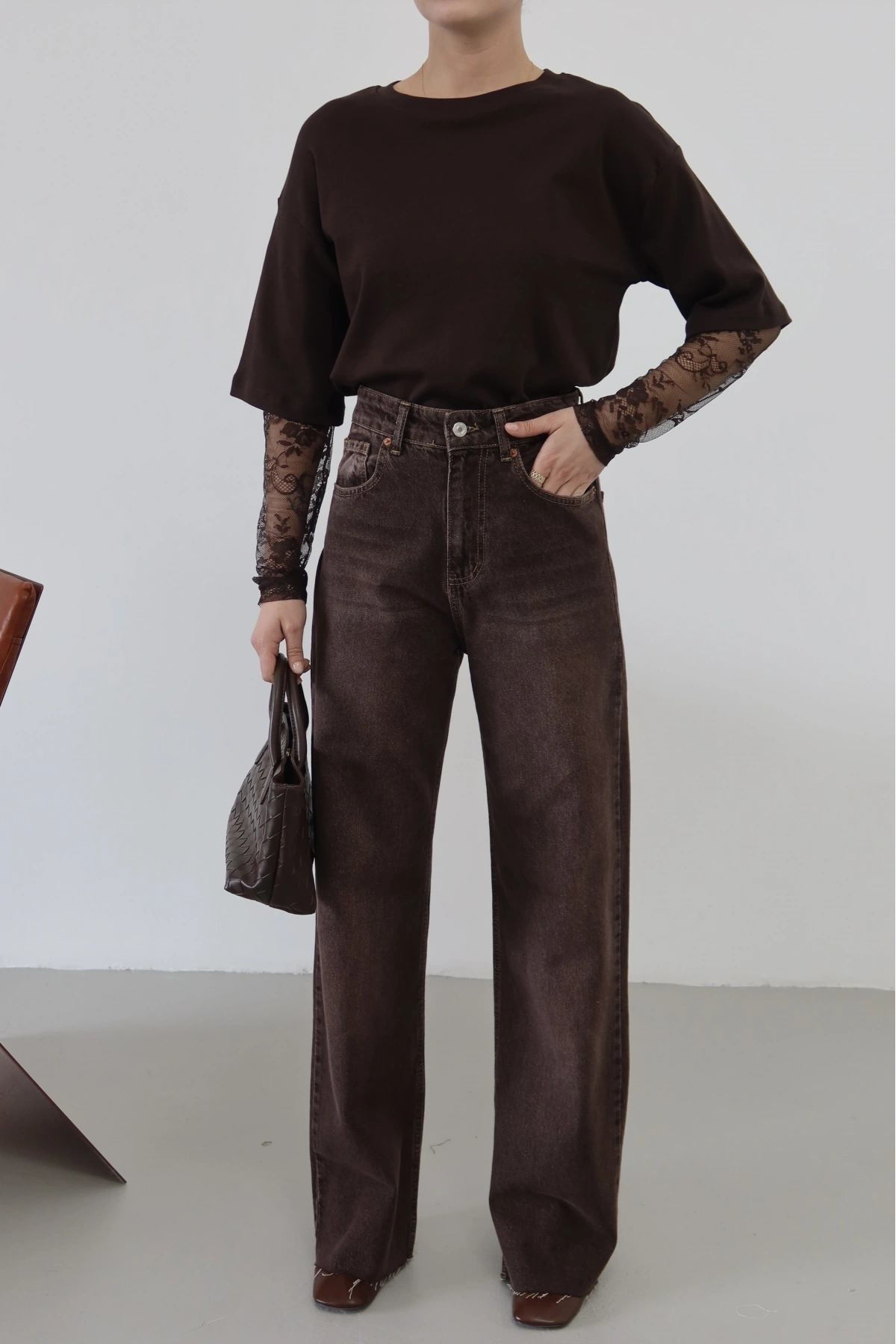 Yüksek Bel Kesik Boru Paça Jean Kahve
