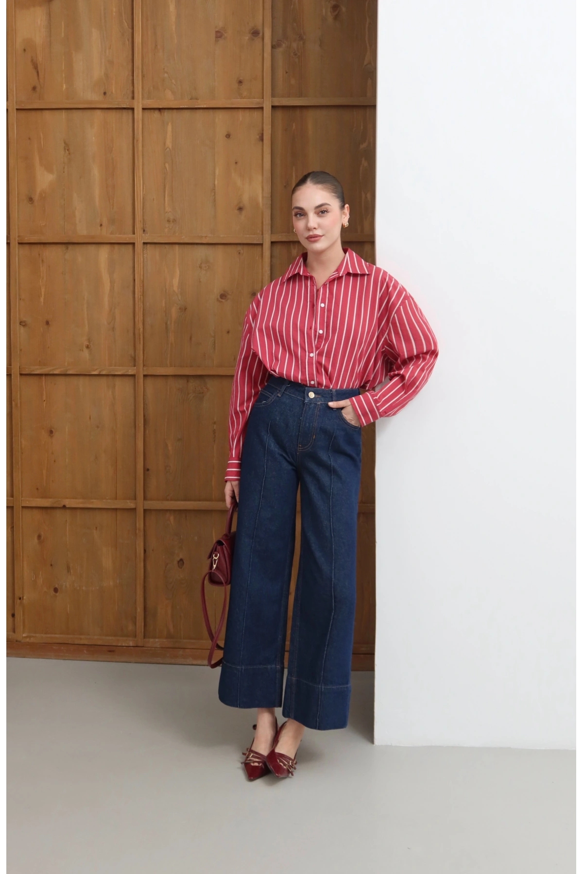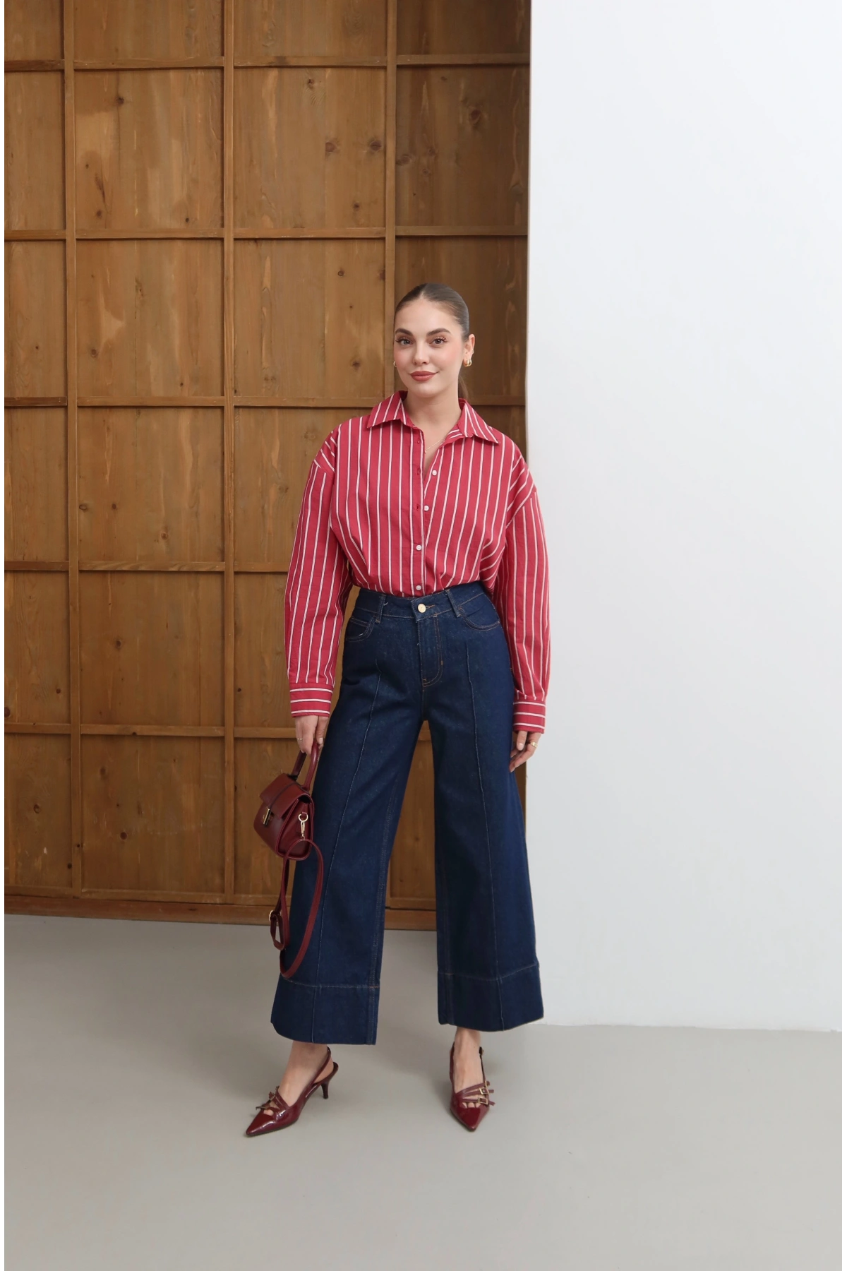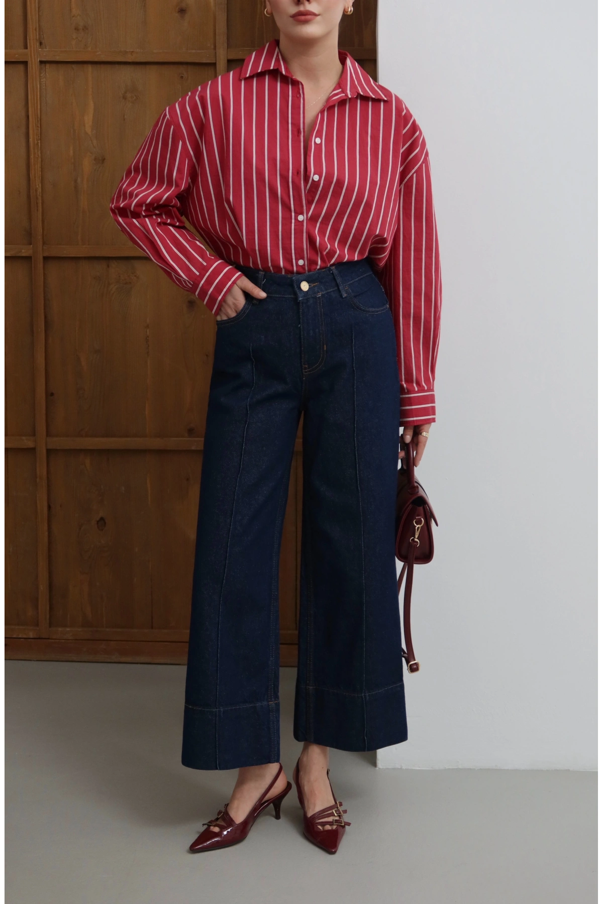 Yüksek Bel Kesik Boru Paça Jean Mavi
