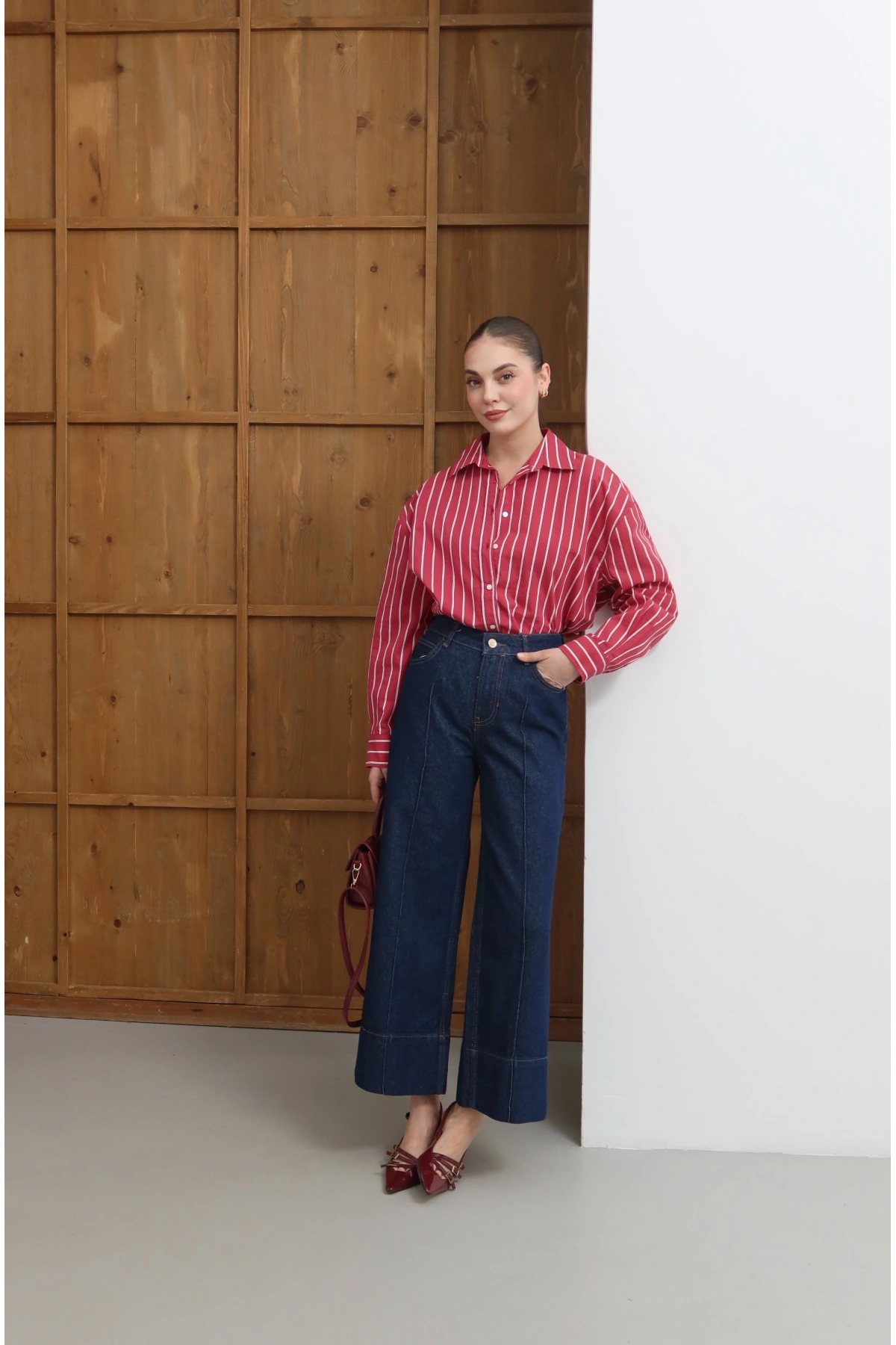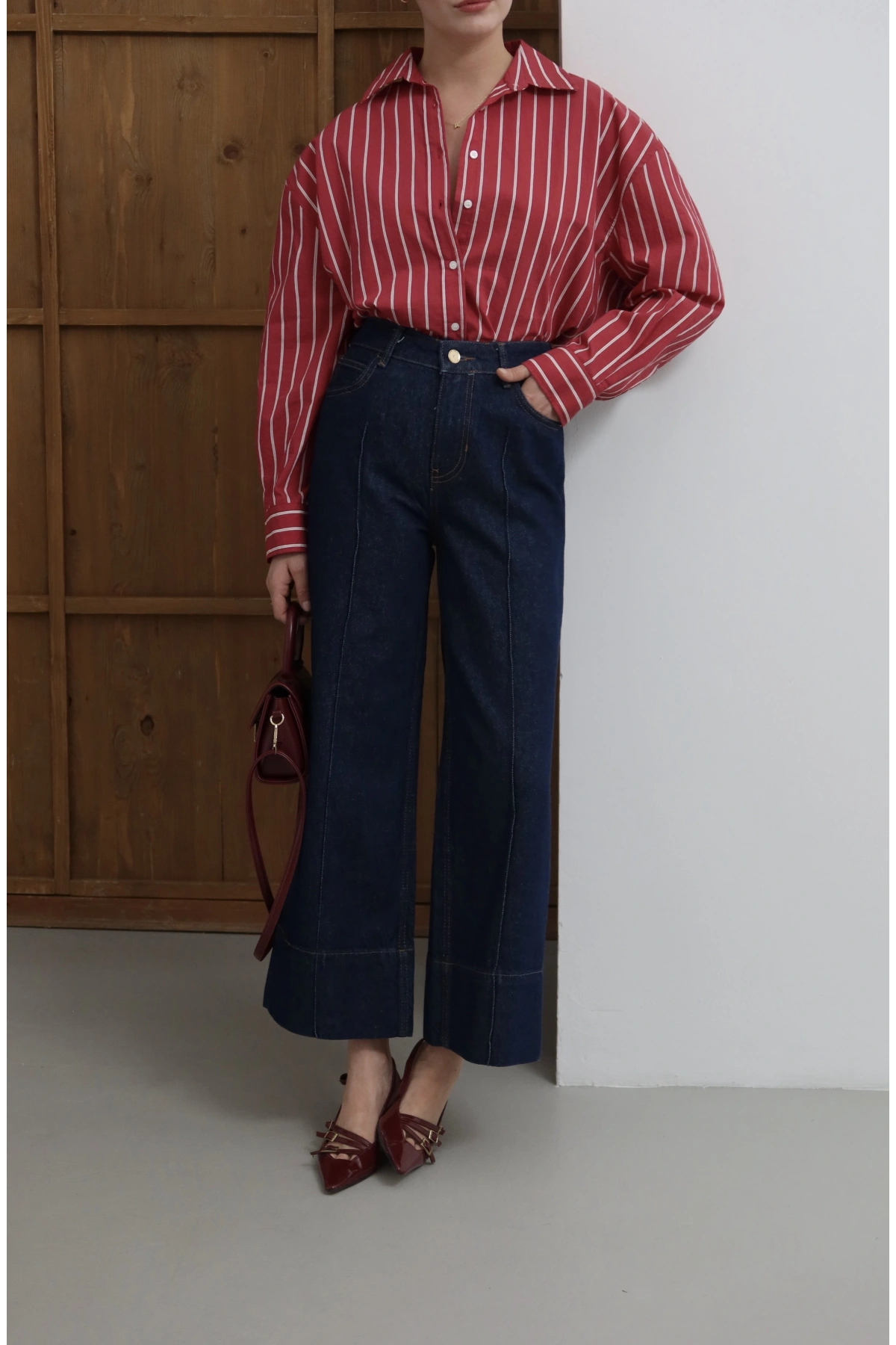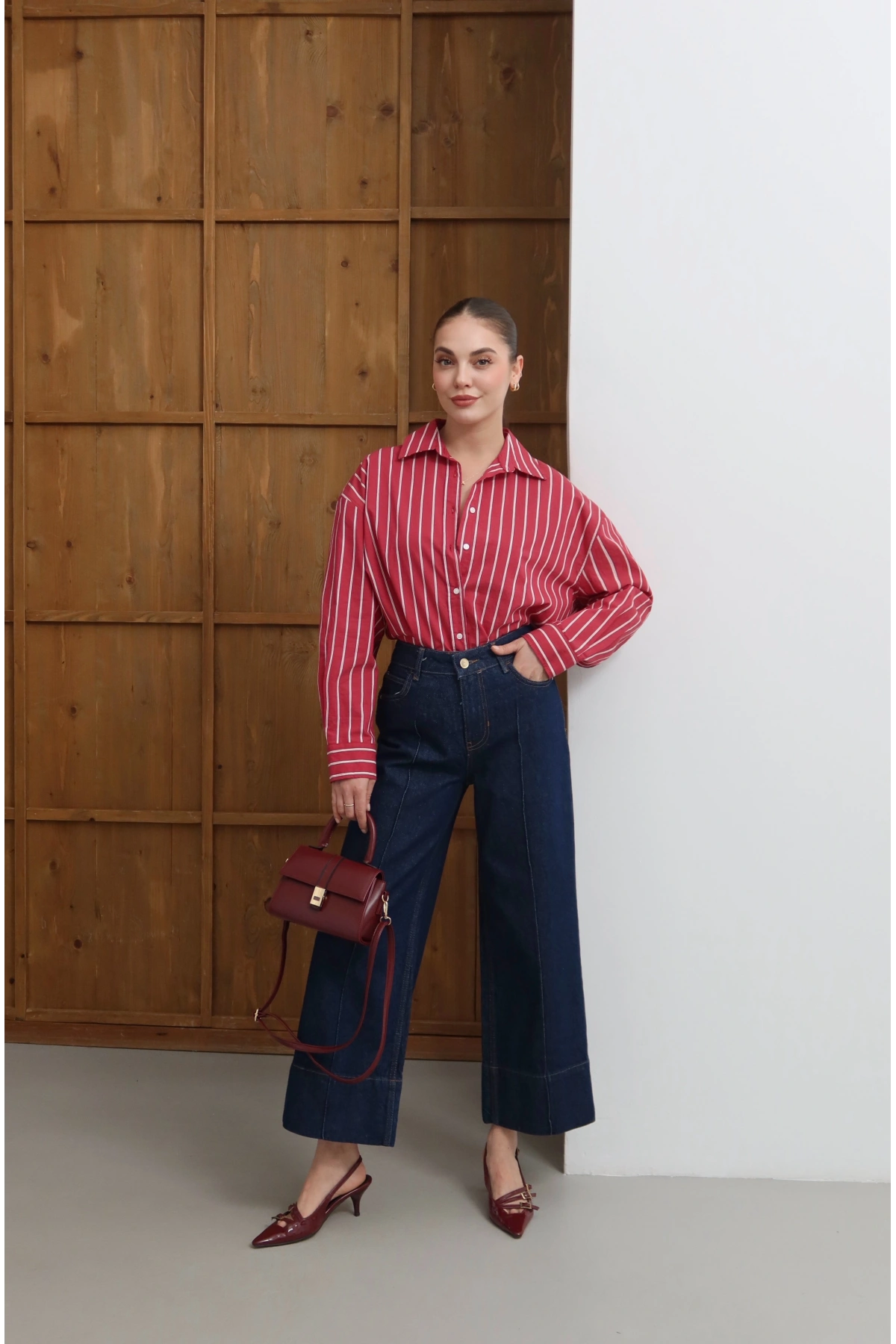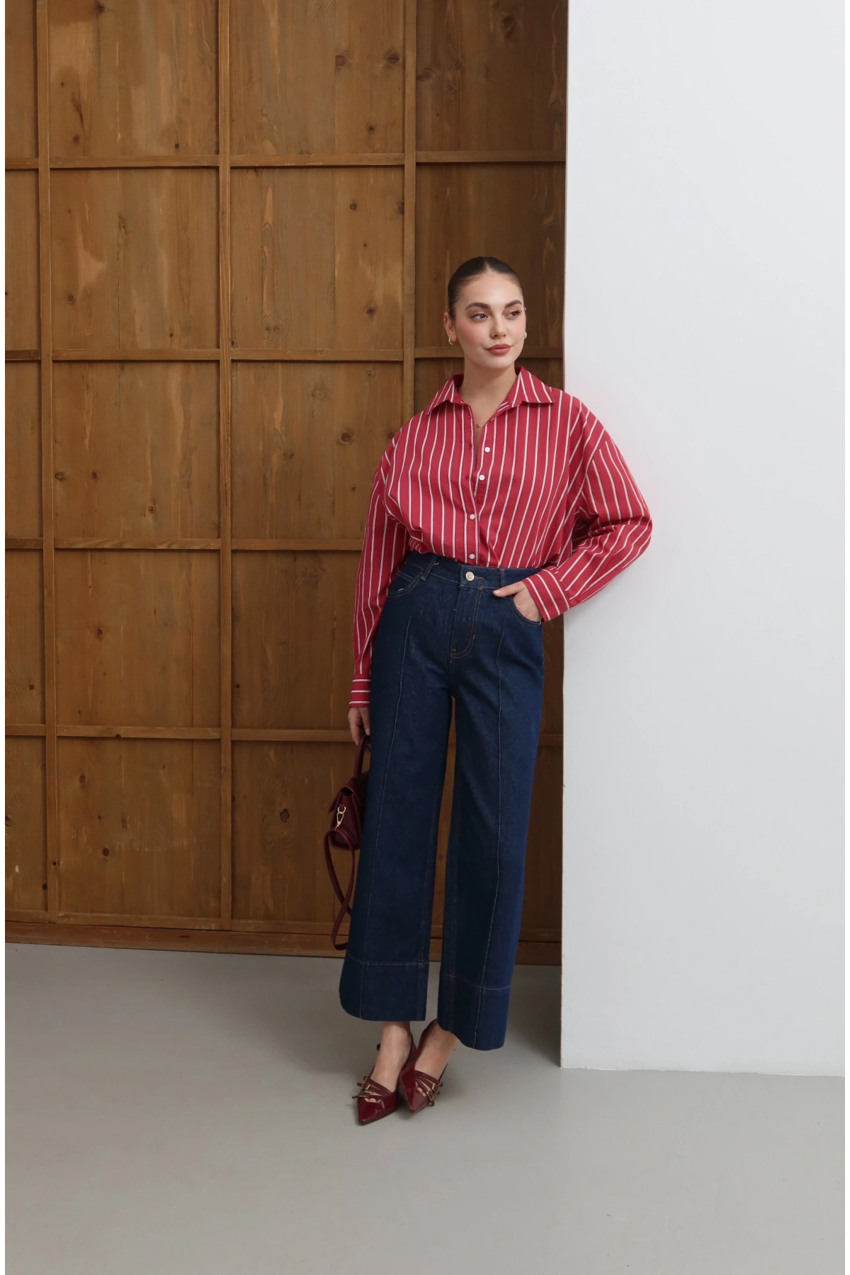 Yüksek Bel Kesik Boru Paça Jean Mavi