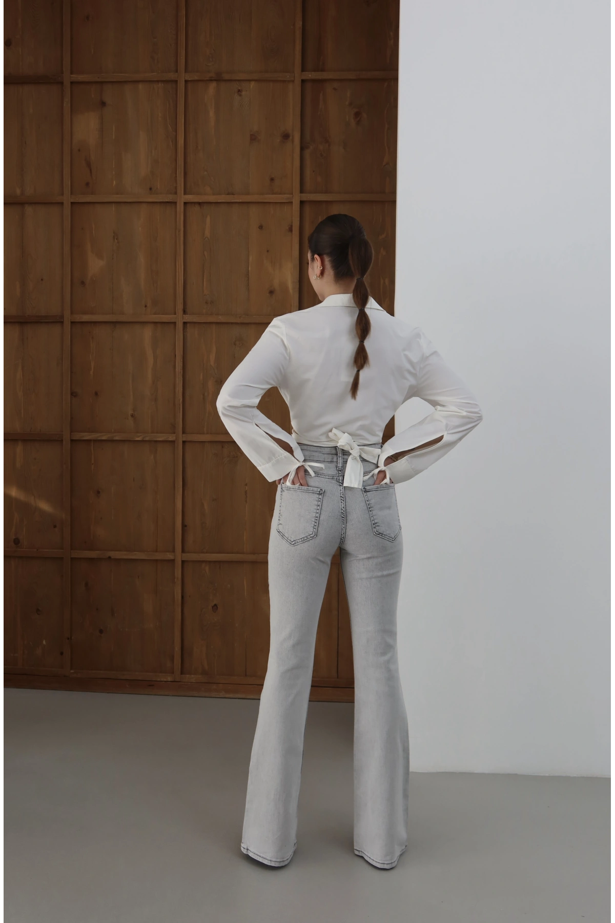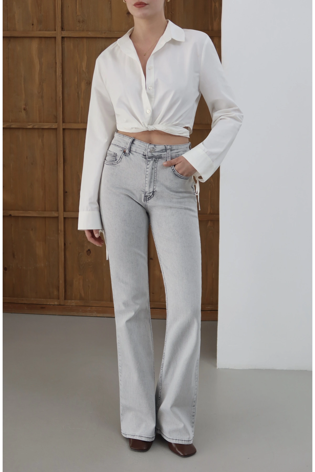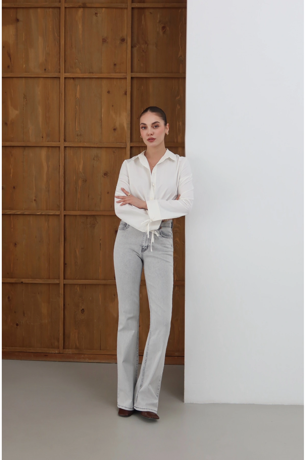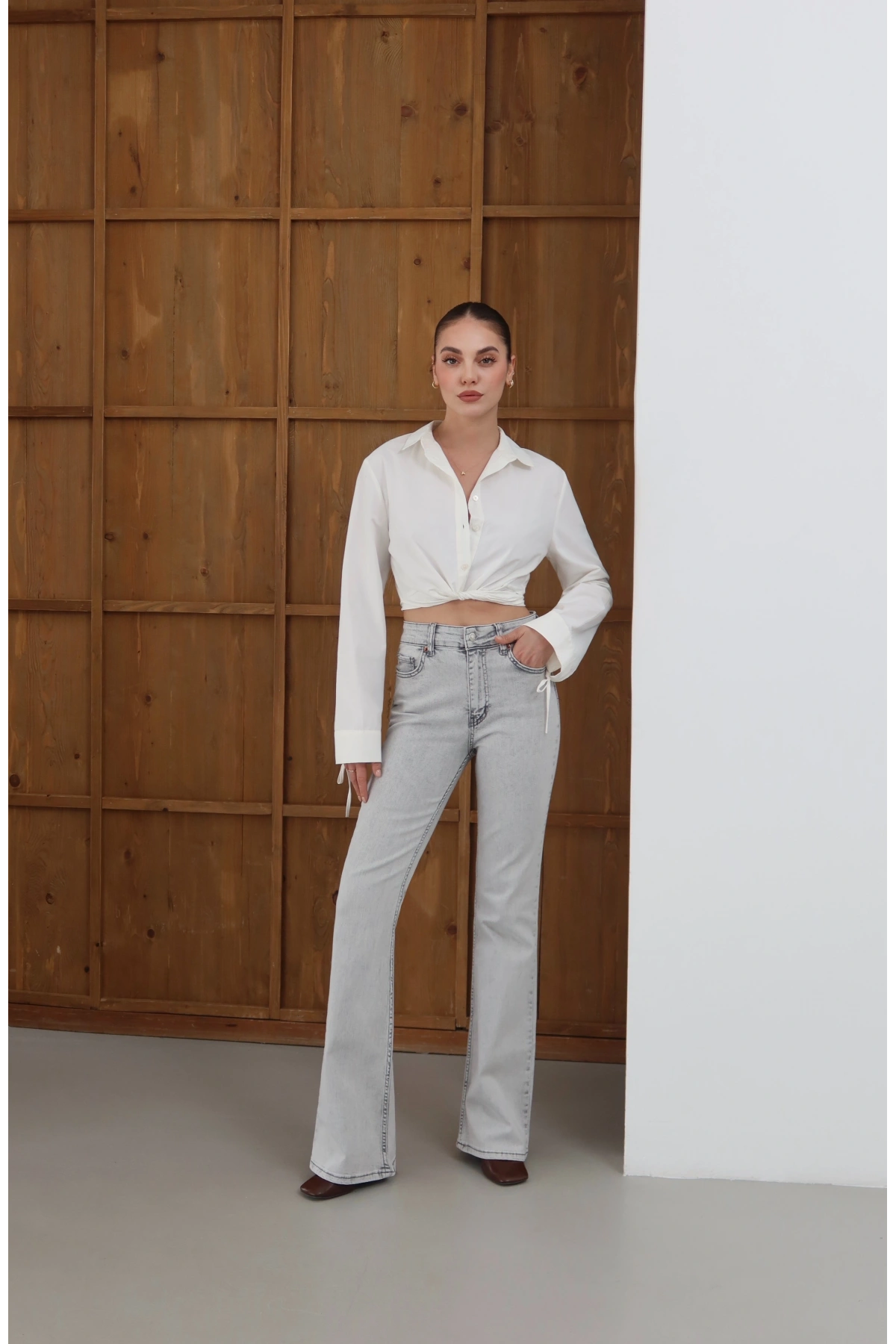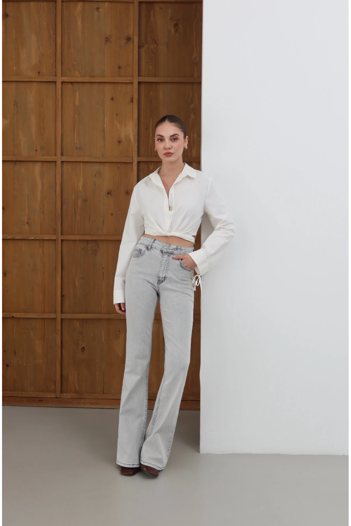 Yüksek Bel Likralı İspanyol Paça Jean Gri