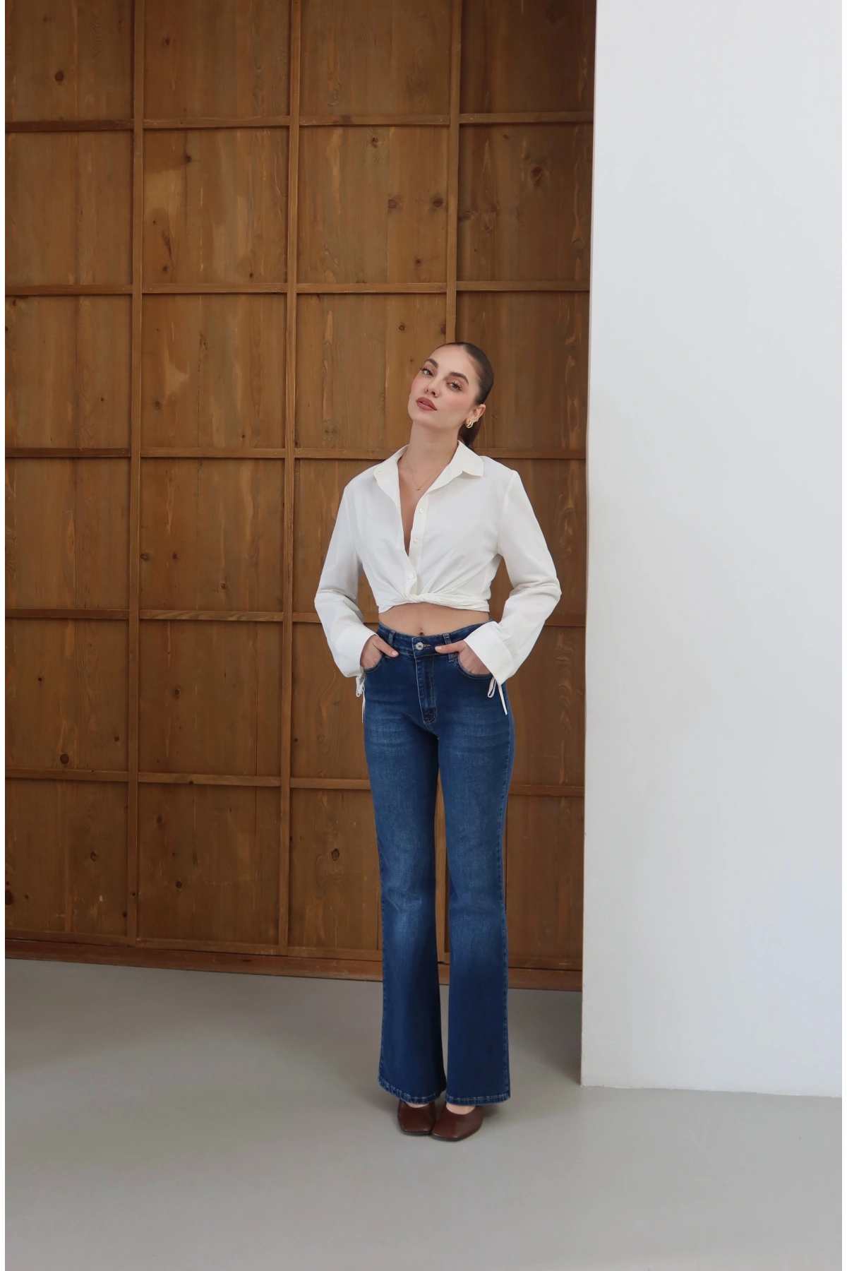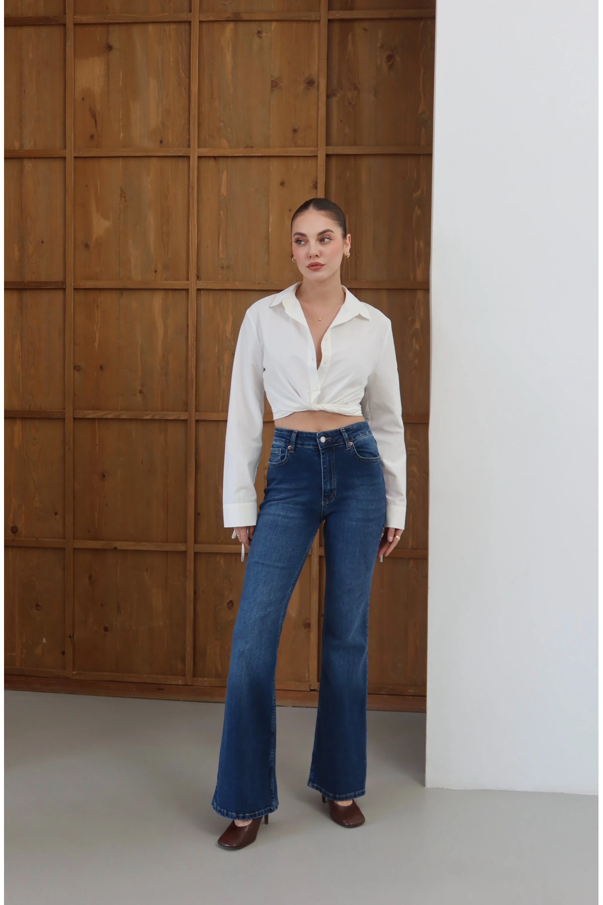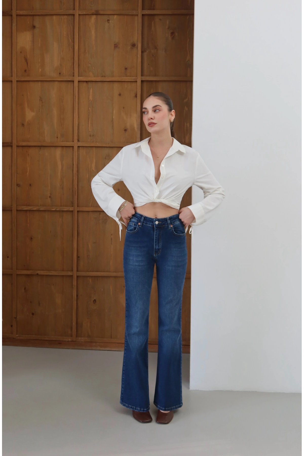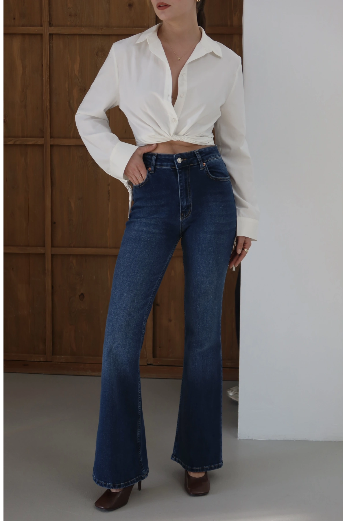 Yüksek Bel Likralı İspanyol Paça Jean Lacivert