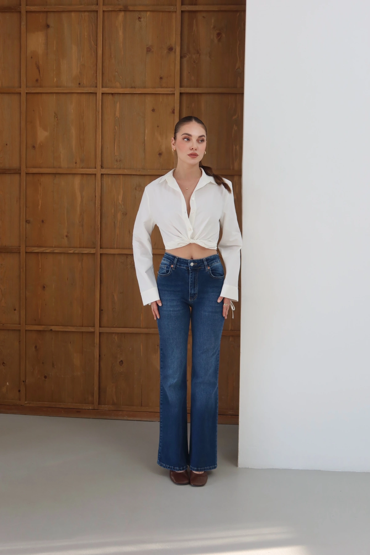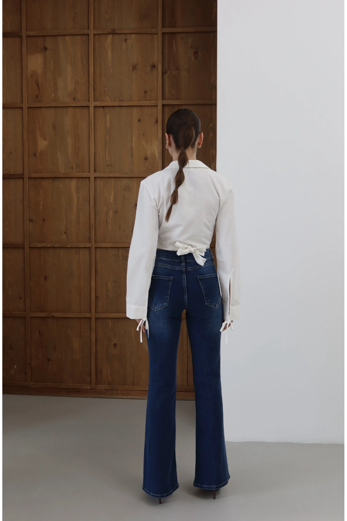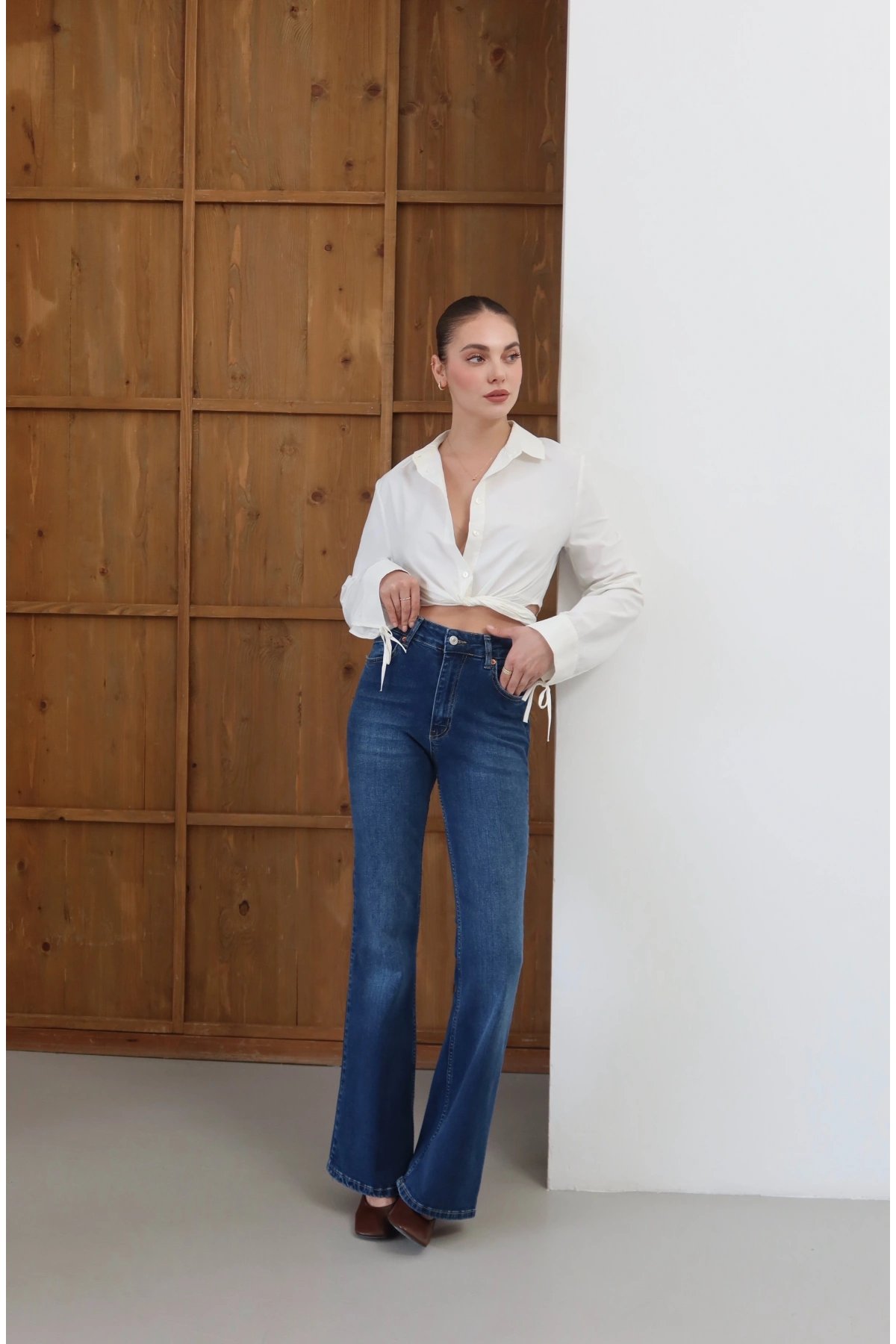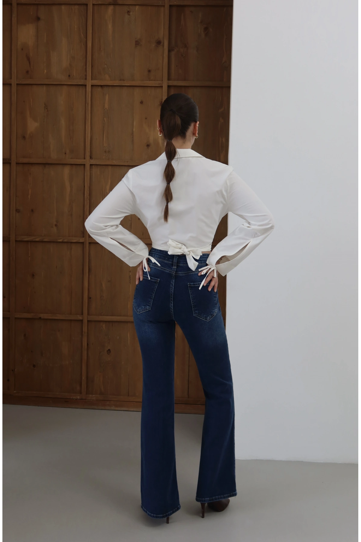 Yüksek Bel Likralı İspanyol Paça Jean Lacivert