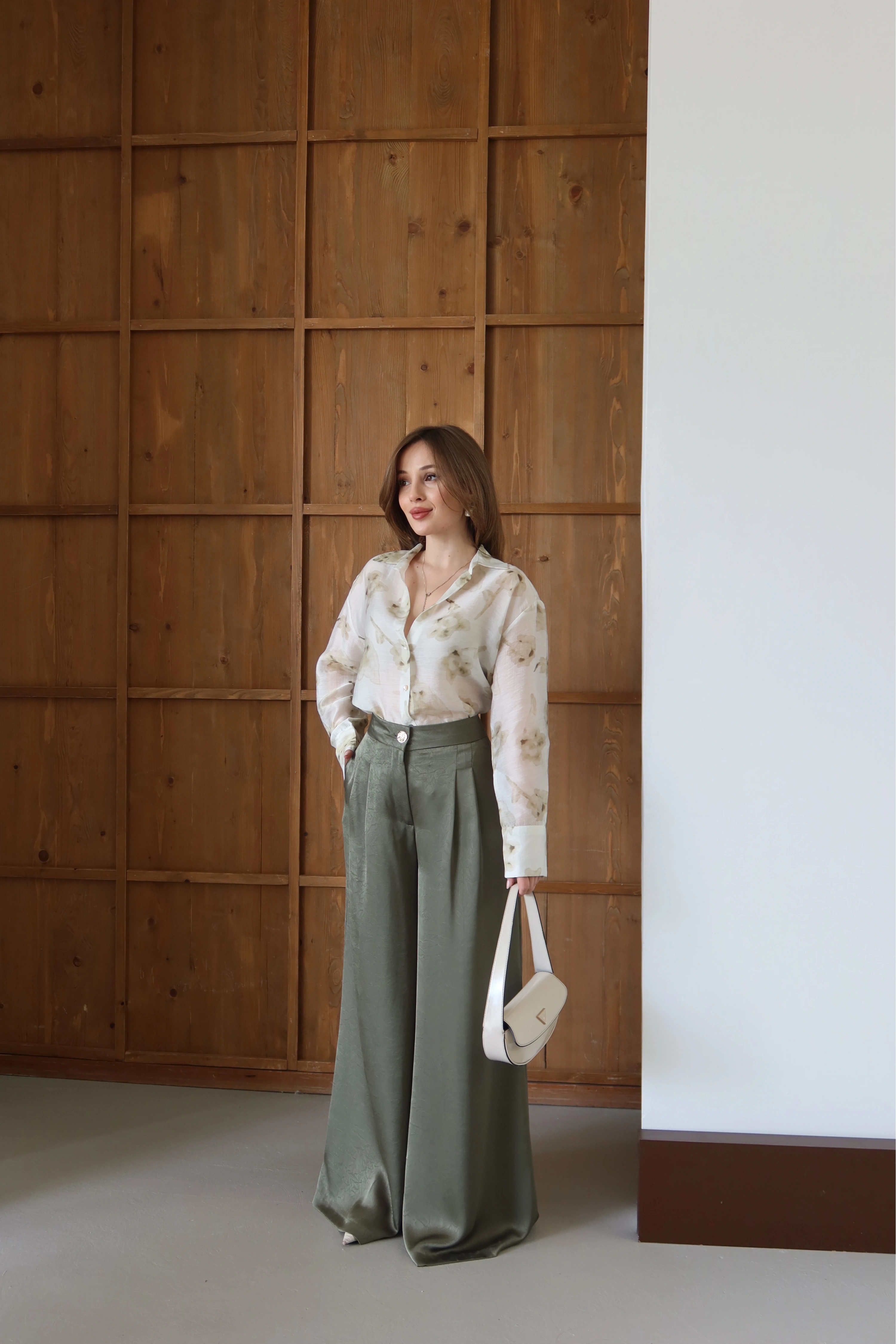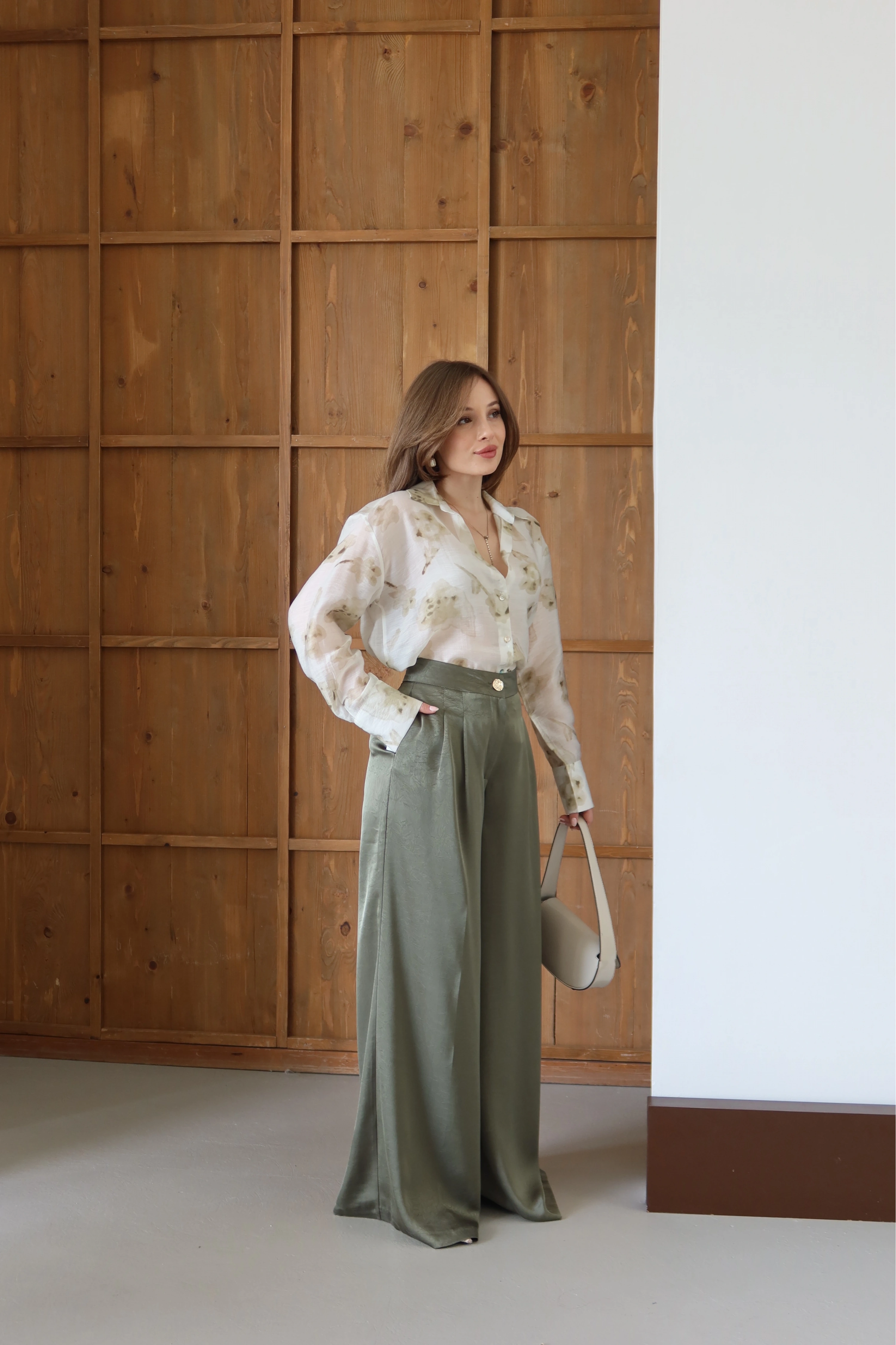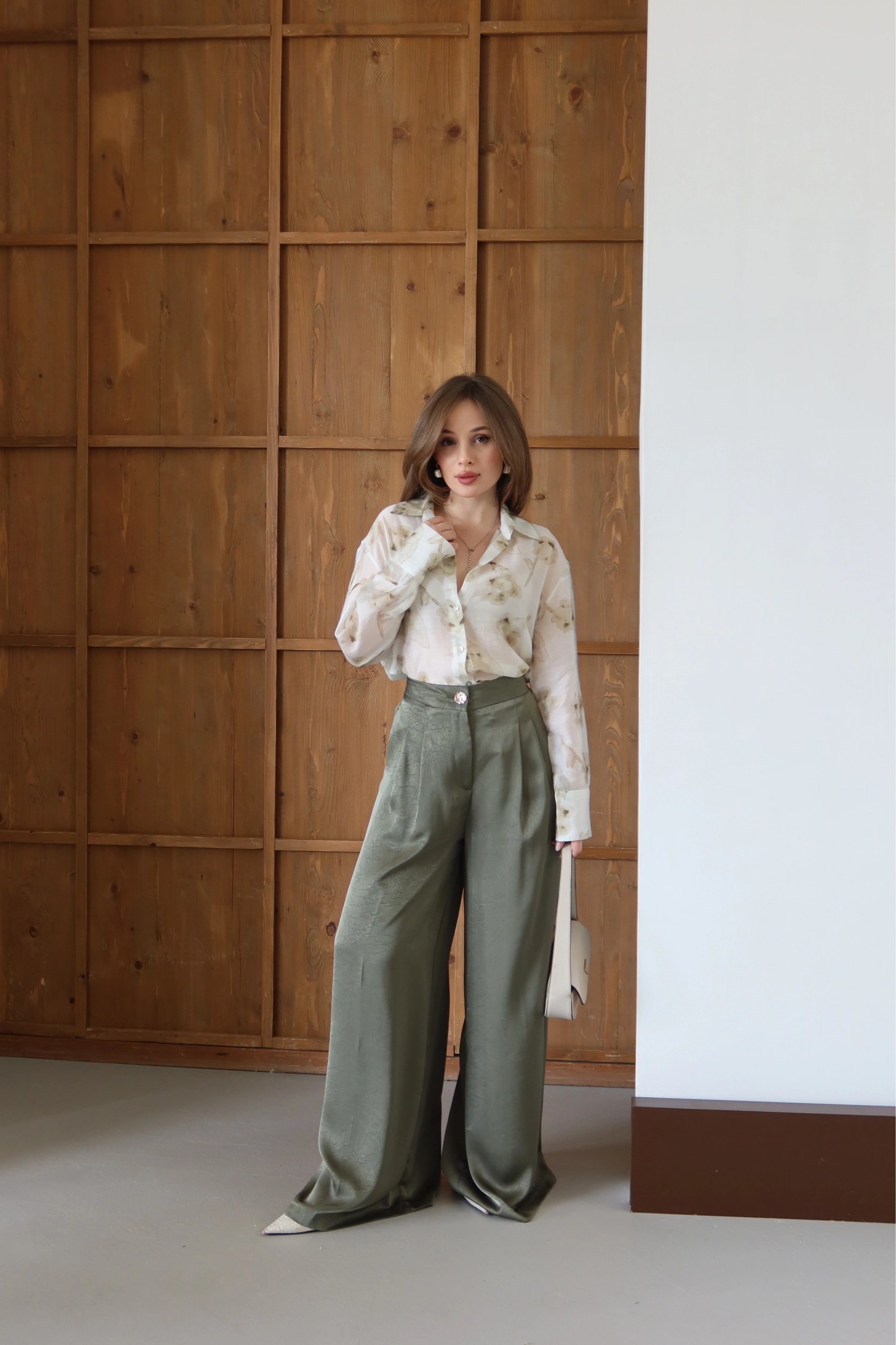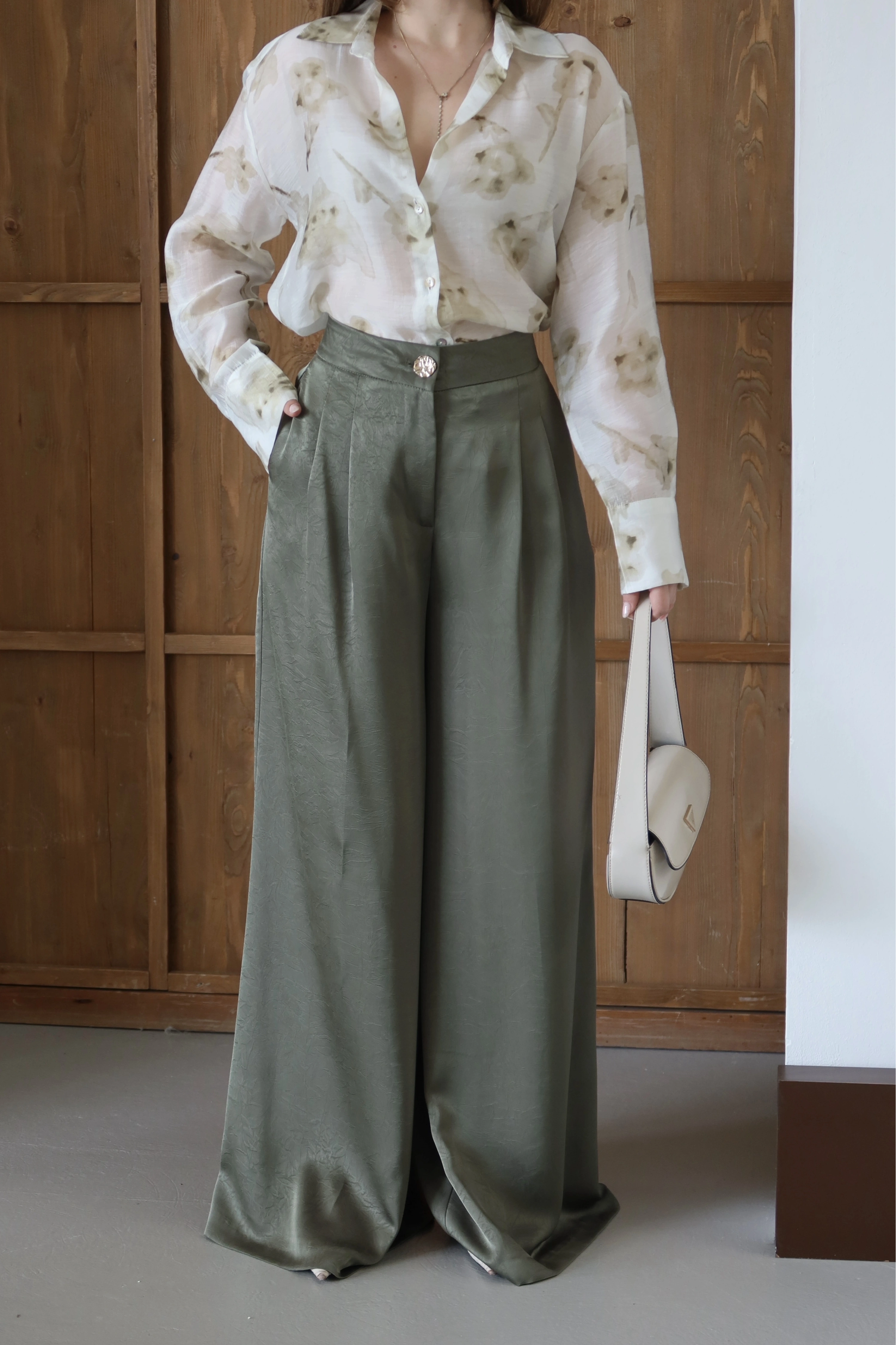 ROÉA’nın bu özel tasarımı, satenin büyüleyici ışıltısını stratejik kumaş detaylarıyla birleştirerek zengin bir görsel derinlik yaratıyor. Pantolonun yüksek belinden paçasına kadar uzanan dökümlü formu, yanlardaki veya bel hattındaki mat kumaş garnileriyle dengelenerek silüetinize modern bir karakter katıyor. Her adımda ışığı farklı açılardan yansıtan bu parça, akışkan kesimiyle konforu; kumaş kombinasyonuyla ise yüksek moda anlayışını temsil ediyor.