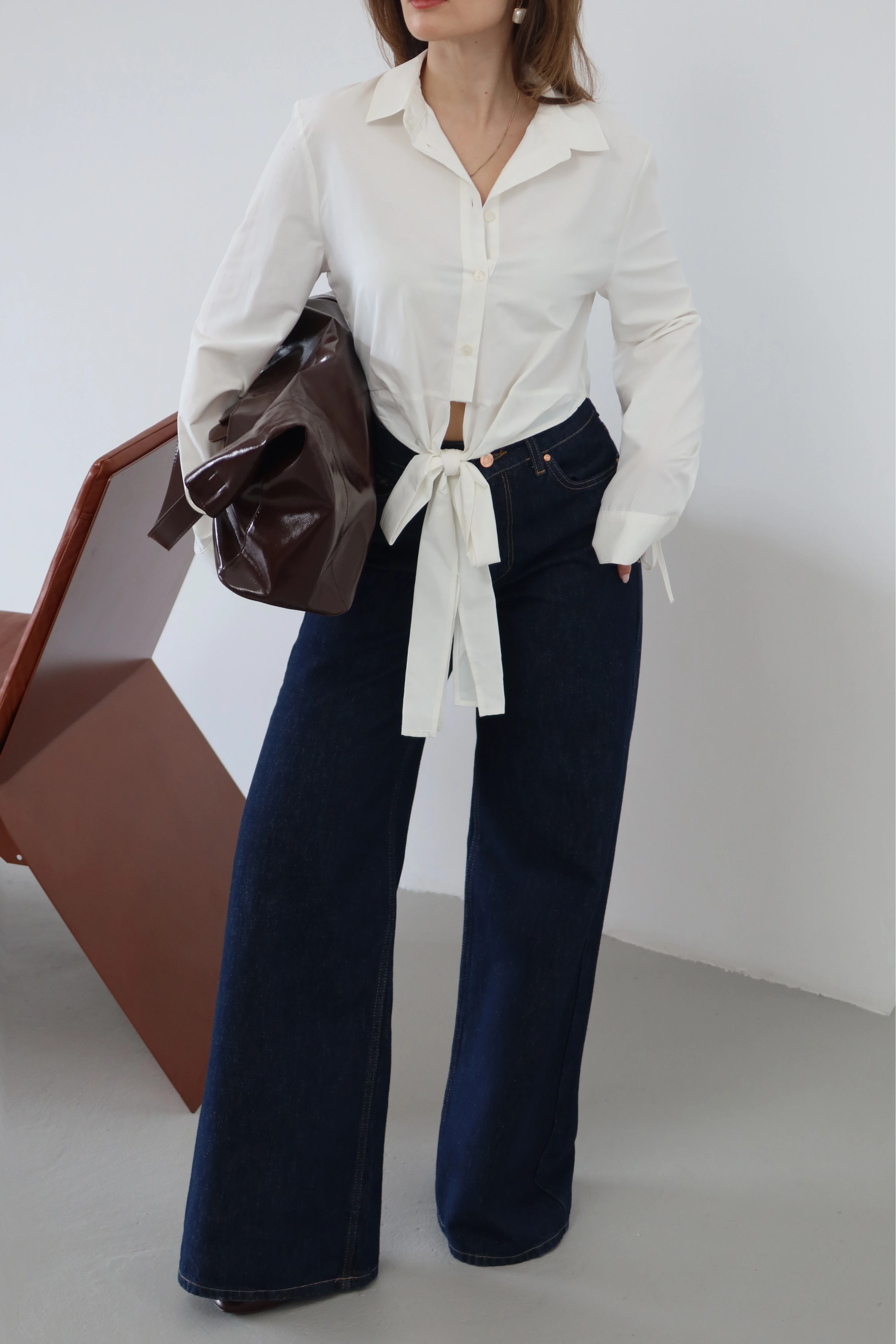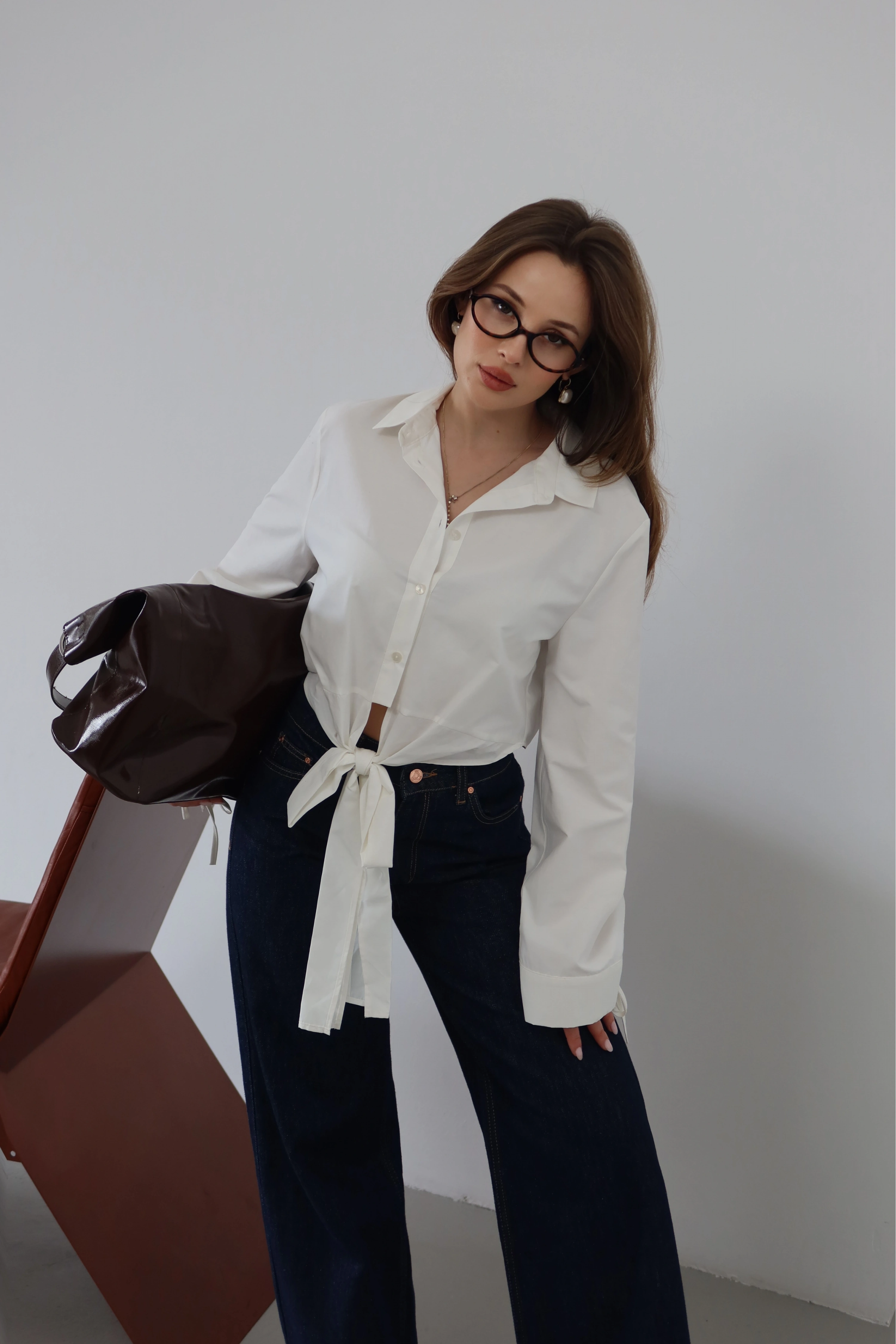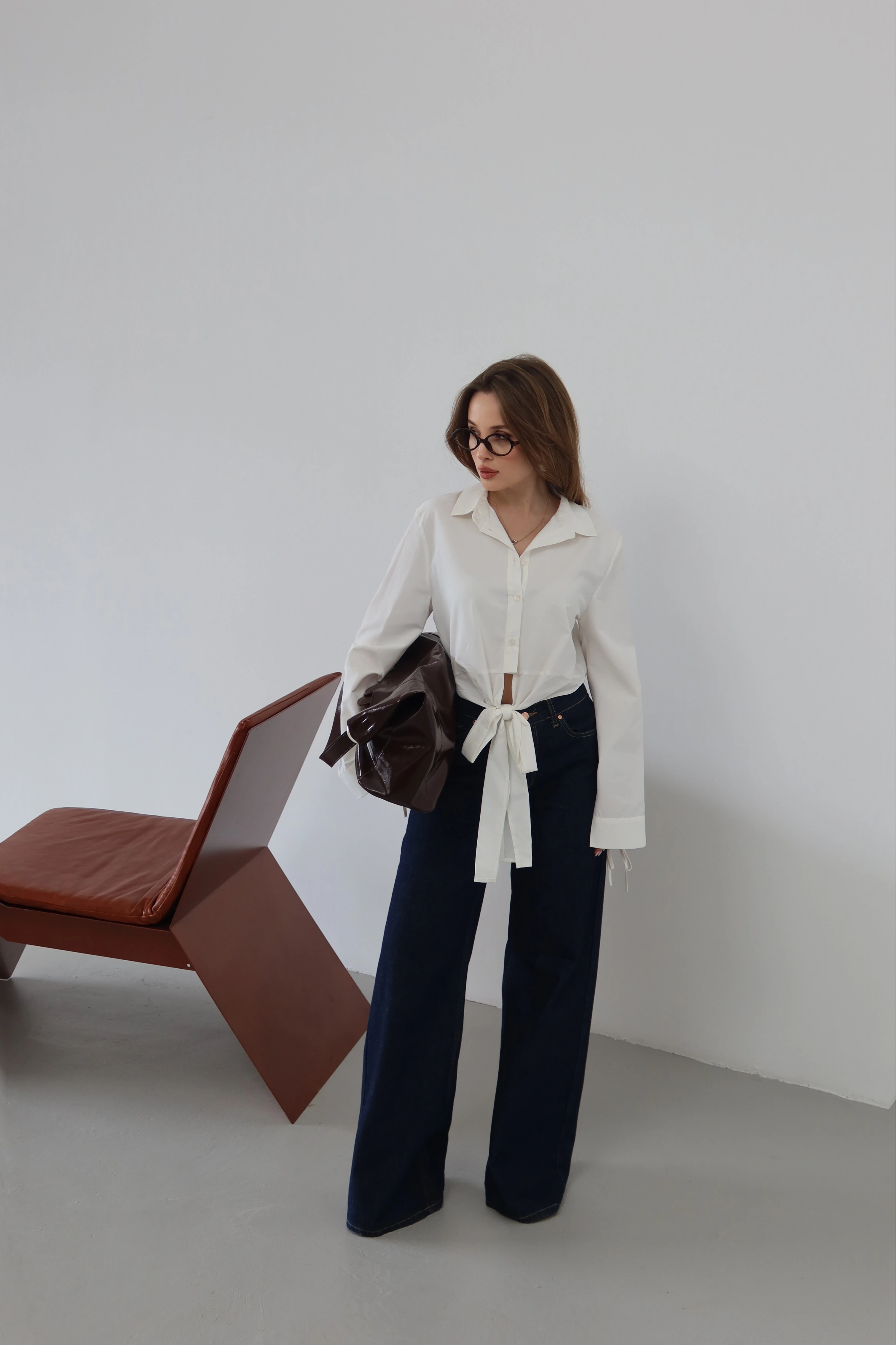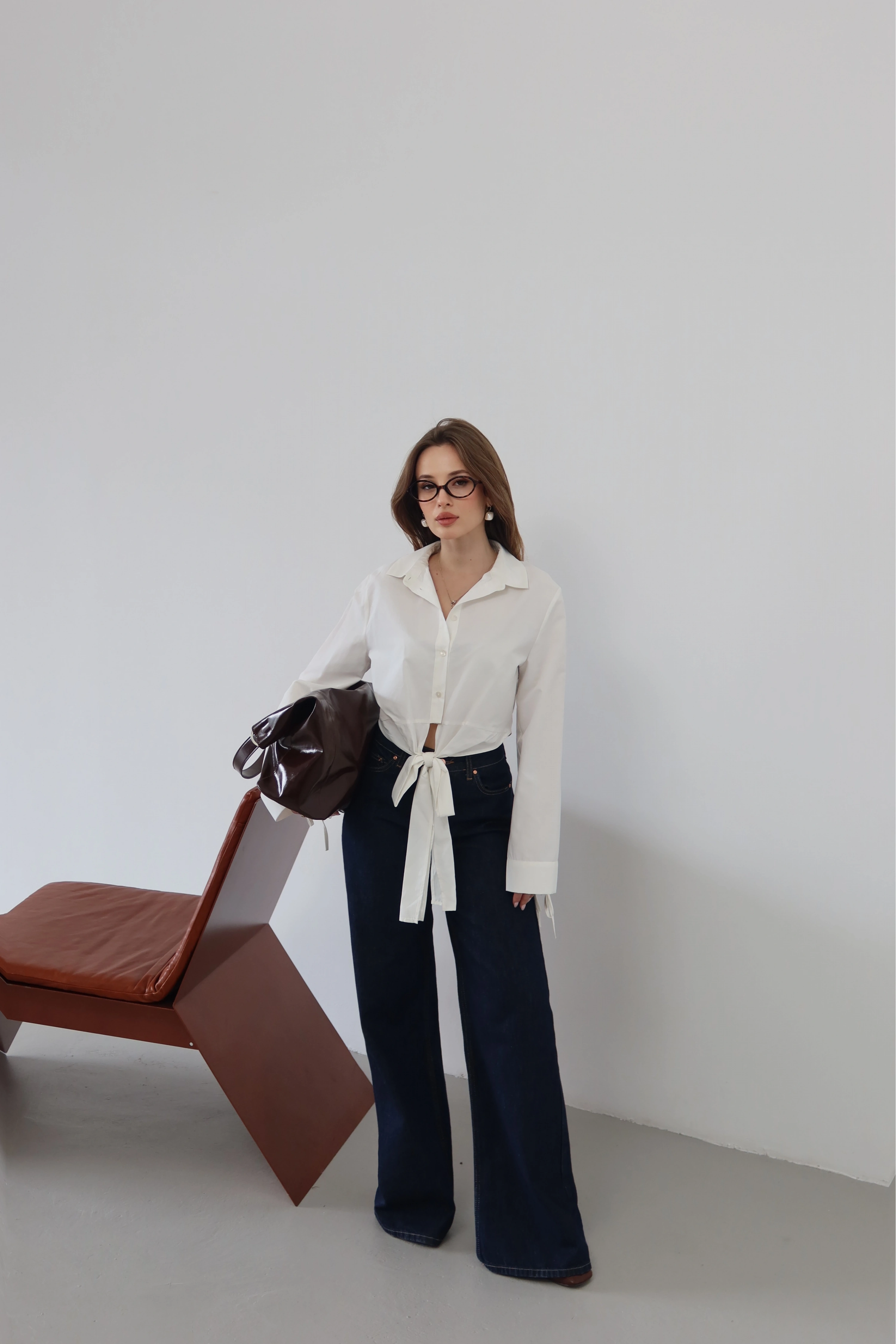 ROÉA, klasik beyaz gömleği ezber bozan bir "crop" formla yeniden yorumluyor. Öndeki geniş bağlama detayıyla bel hattınıza feminen bir vurgu yapan bu tasarım, uzun kollarındaki bağcık detaylarıyla hareket kazanıyor. Poplin dokusunun ferahlığını modern bir kesimle birleştiren gömlek, hem romantik bir akşam yemeği hem de şık bir şehir stili için gardırobunuzun en joker parçası olmaya aday.