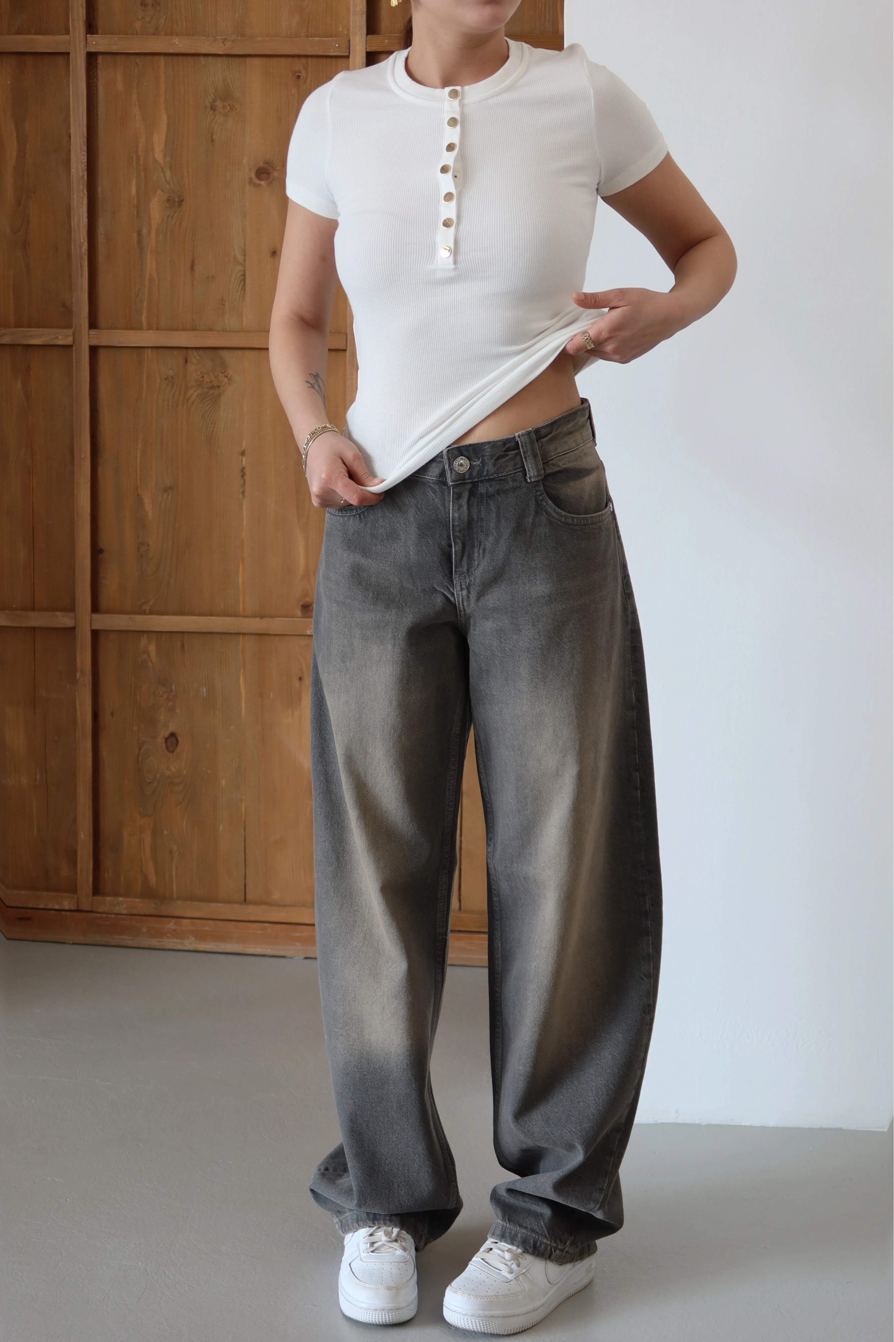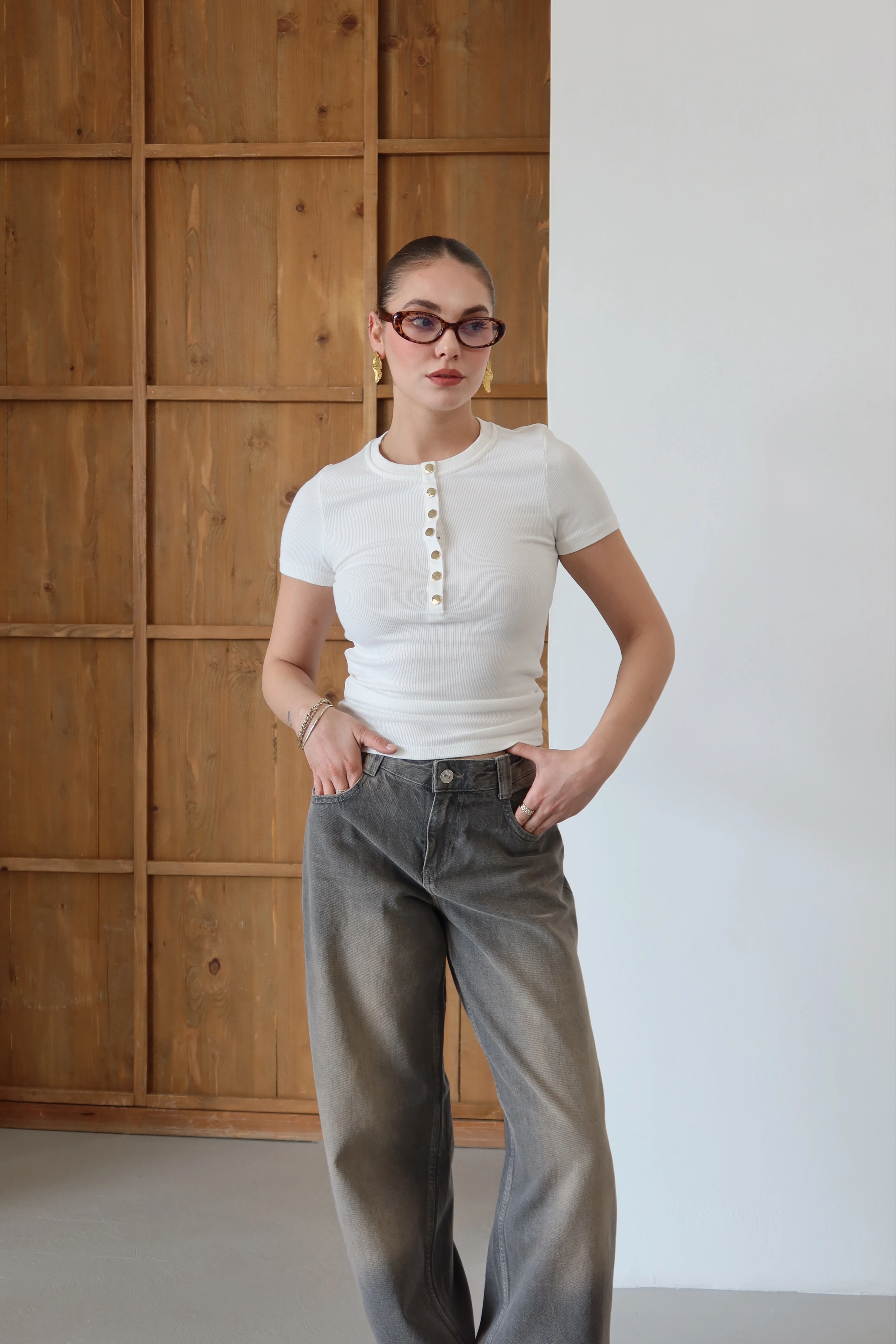 ROÉA’nın Önü Çıtçıtlı T-shirt tasarımı, günlük stilin en temel parçasına endüstriyel bir dokunuş katarak stilinizi hareketlendiriyor. Ön kısımdaki fonksiyonel çıtçıt detayları, yaka derinliğini dilediğiniz gibi ayarlamanıza olanak tanırken, tasarıma modern ve zahmetsiz bir hava katıyor. Vücudu saran esnek dokusu ve sade hatları, gold çıtçıtların ışıltısıyla birleşerek günün her anına uyum sağlayan ikonik bir parça yaratıyor.