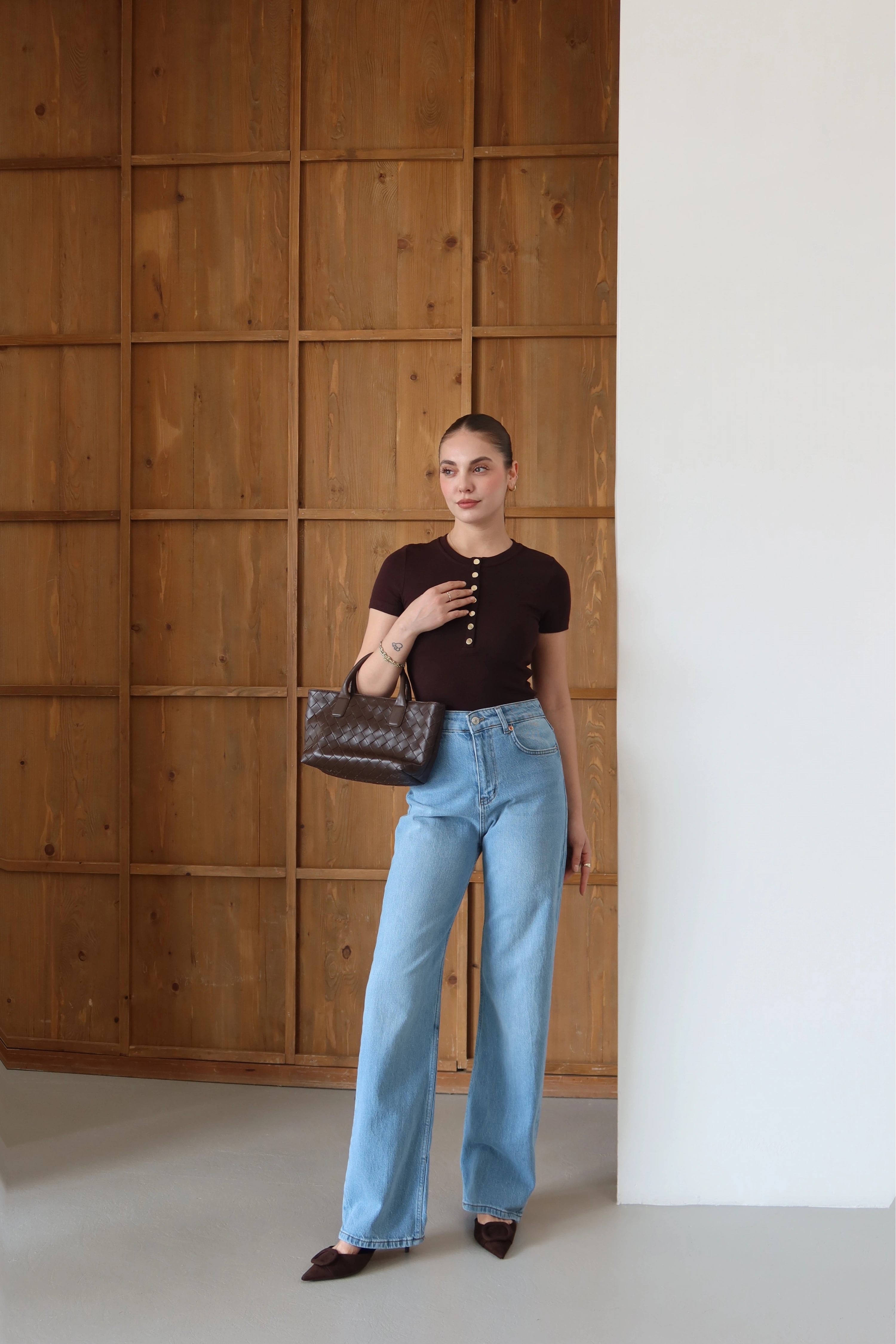 ROÉA’nın Önü Çıtçıtlı T-shirt tasarımı, günlük stilin en temel parçasına endüstriyel bir dokunuş katarak stilinizi hareketlendiriyor. Ön kısımdaki fonksiyonel çıtçıt detayları, yaka derinliğini dilediğiniz gibi ayarlamanıza olanak tanırken, tasarıma modern ve zahmetsiz bir hava katıyor. Vücudu saran esnek dokusu ve sade hatları, gold çıtçıtların ışıltısıyla birleşerek günün her anına uyum sağlayan ikonik bir parça yaratıyor.