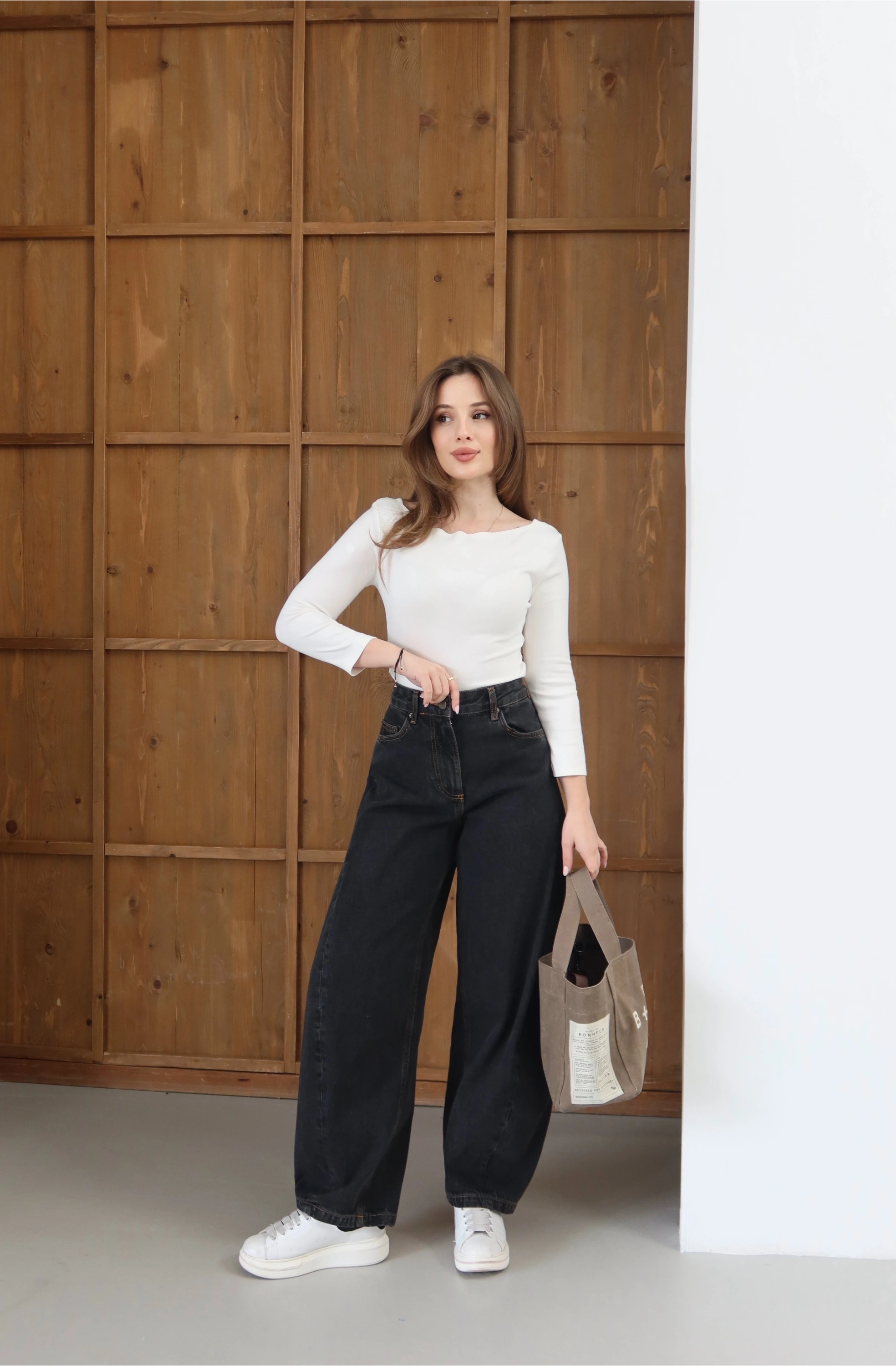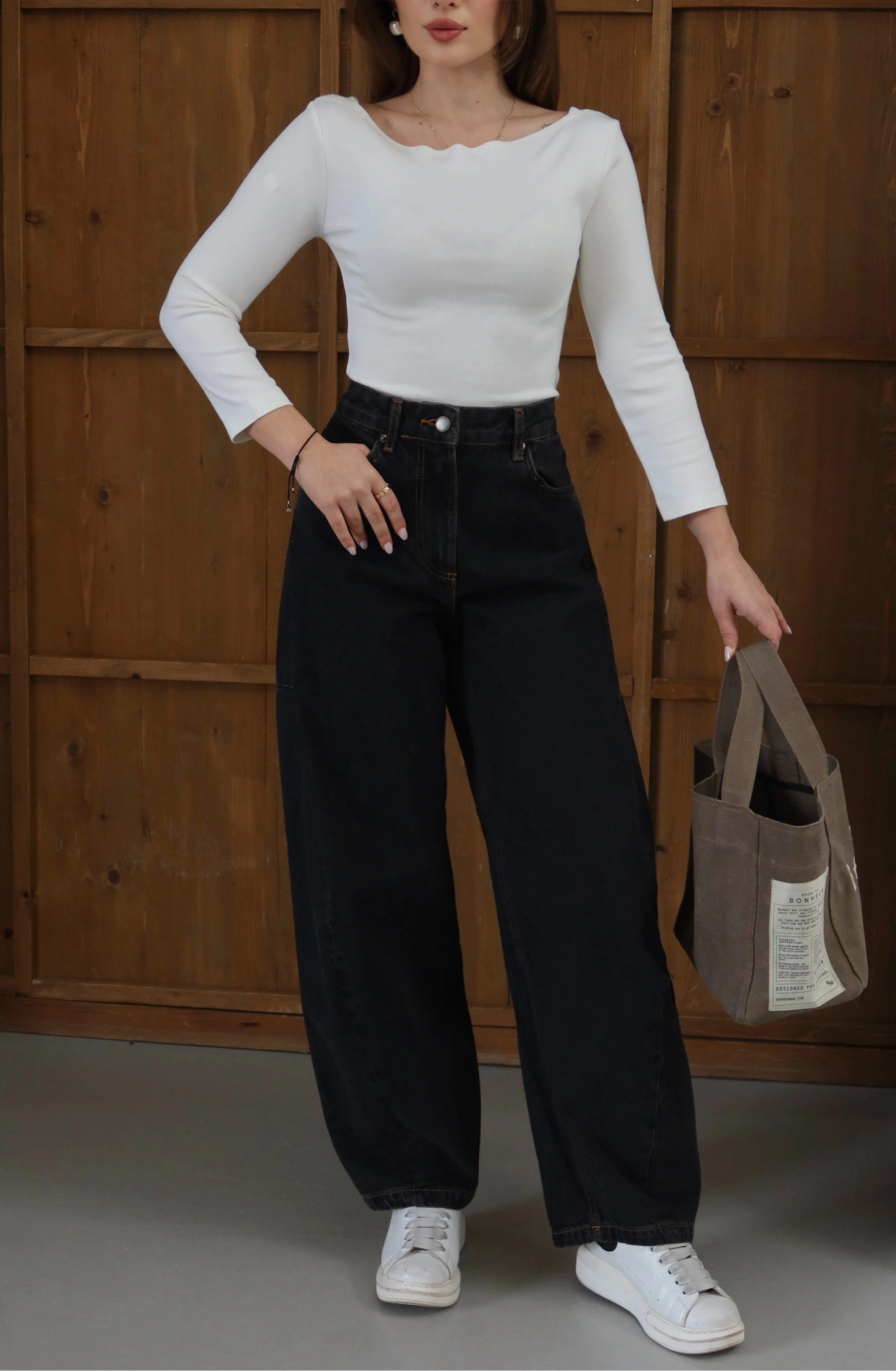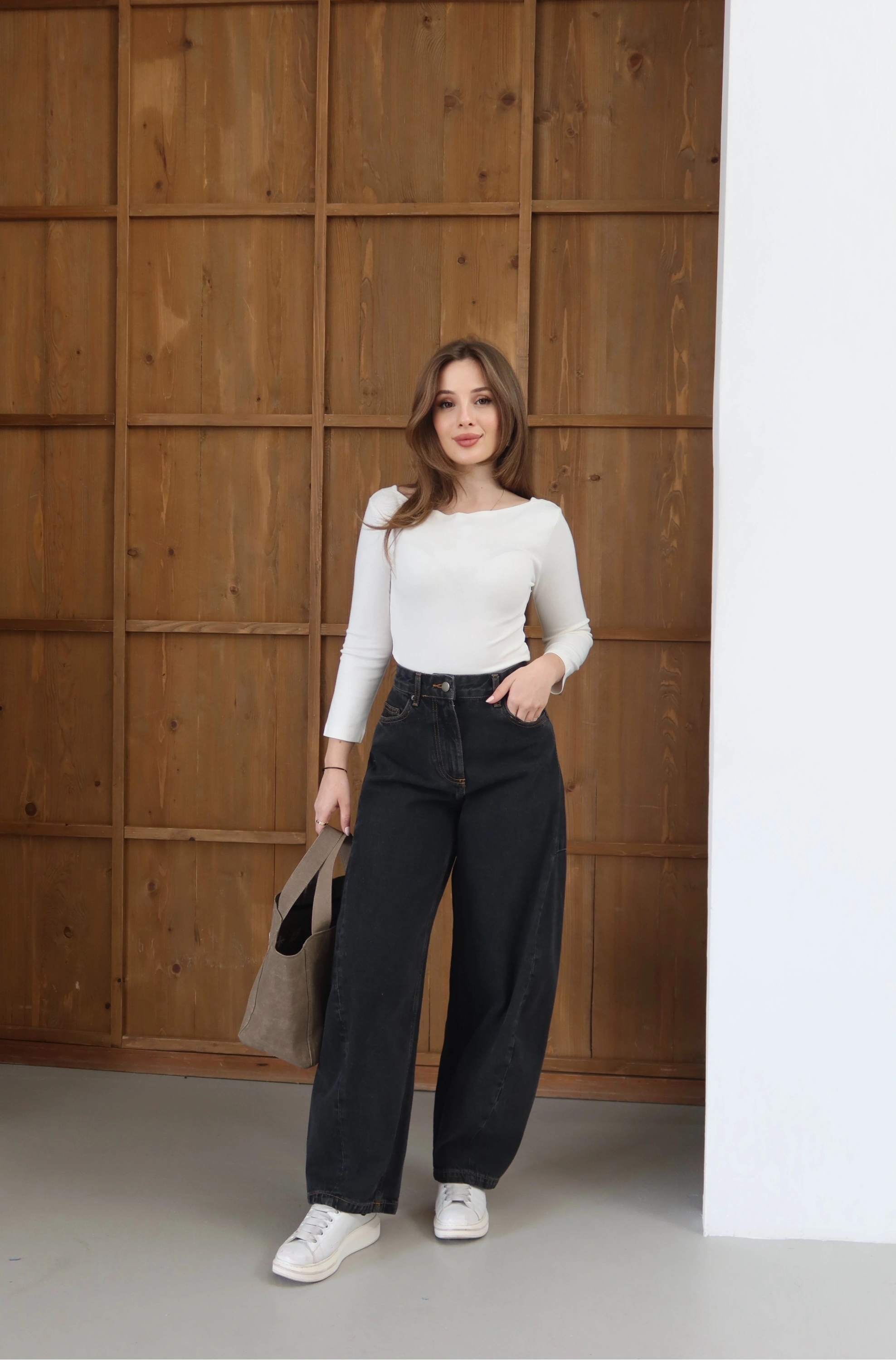 Siyahın derinliği, bilekte biten balon kesimin kavisli hatlarıyla buluşuyor. Orta bel yüksekliğinin sunduğu dengeli konfor, silüete modern bir hareket katıyor. Pamuklu denimin güçlü yapısını, özgür adımlarla birleştiren zamansız bir tasarım.