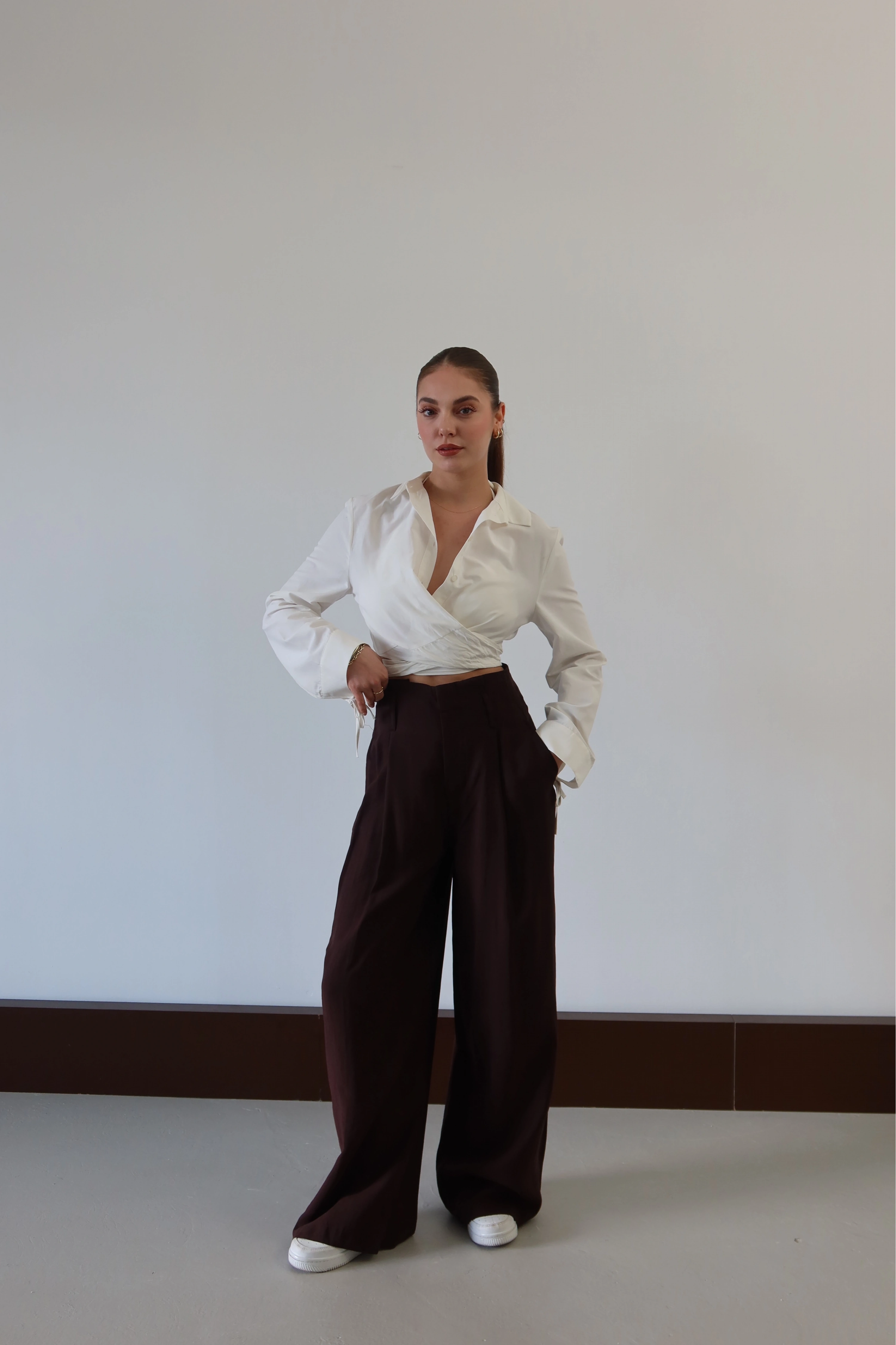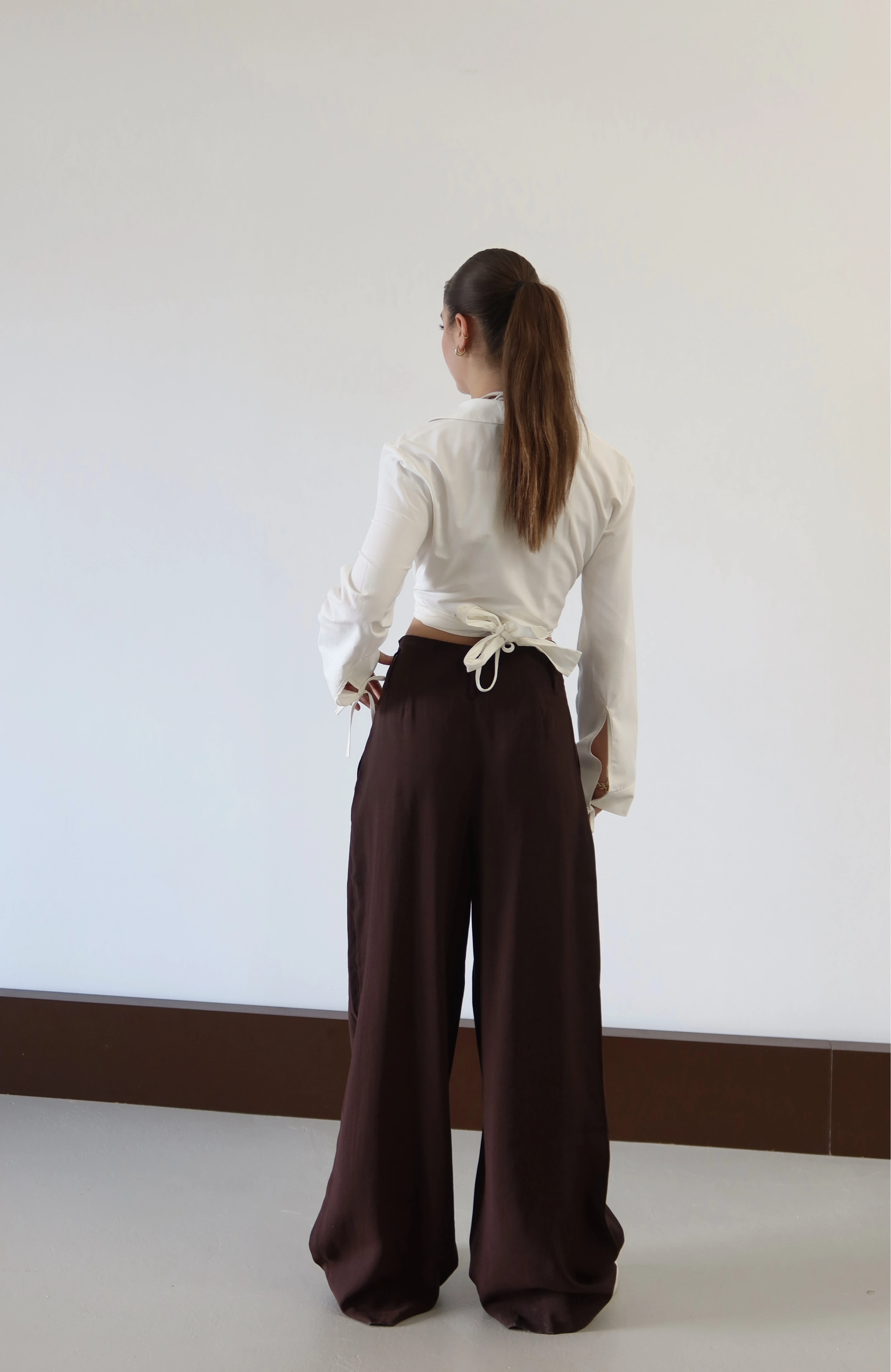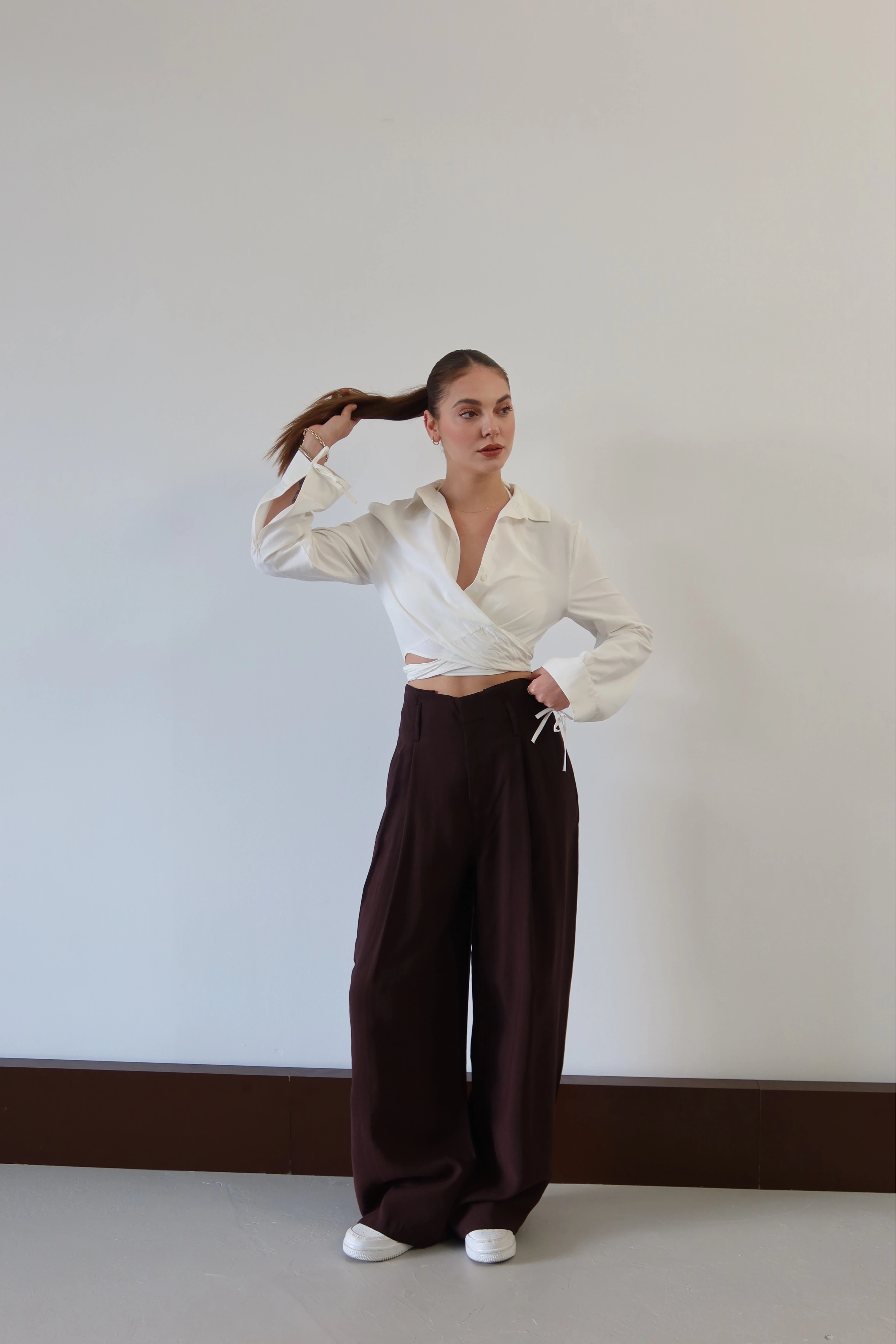 Geniş paçanın sunduğu sınırsız hacim, bel hattındaki pens detaylarıyla disipline ediliyor. Kumaşın kendi ağırlığıyla yarattığı dökümlü duruş, adımlara eforsuz bir zarafet katıyor. Belden aşağı süzülen jilet gibi keskin hattı ve konforu odağına alan yapısıyla, modern şehir hayatının en sofistike temel parçası.