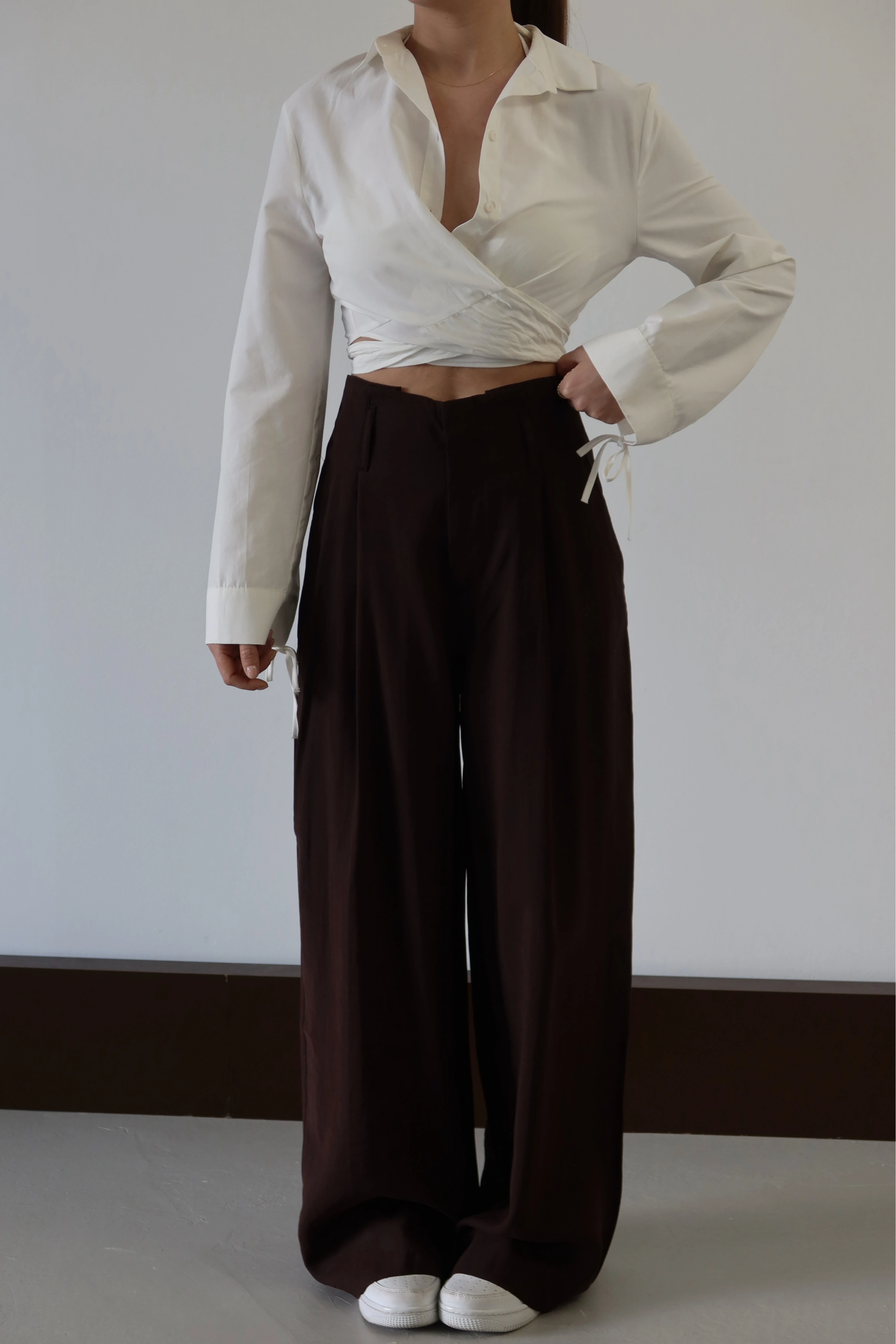 Detay: Bel hattını belirginleştiren pens dikişleri ve maksi boy geniş paça.