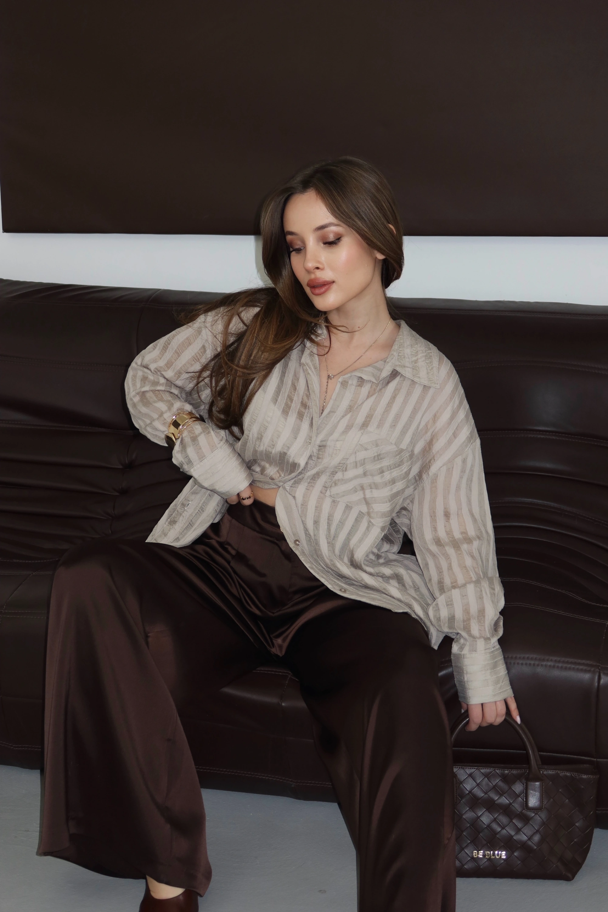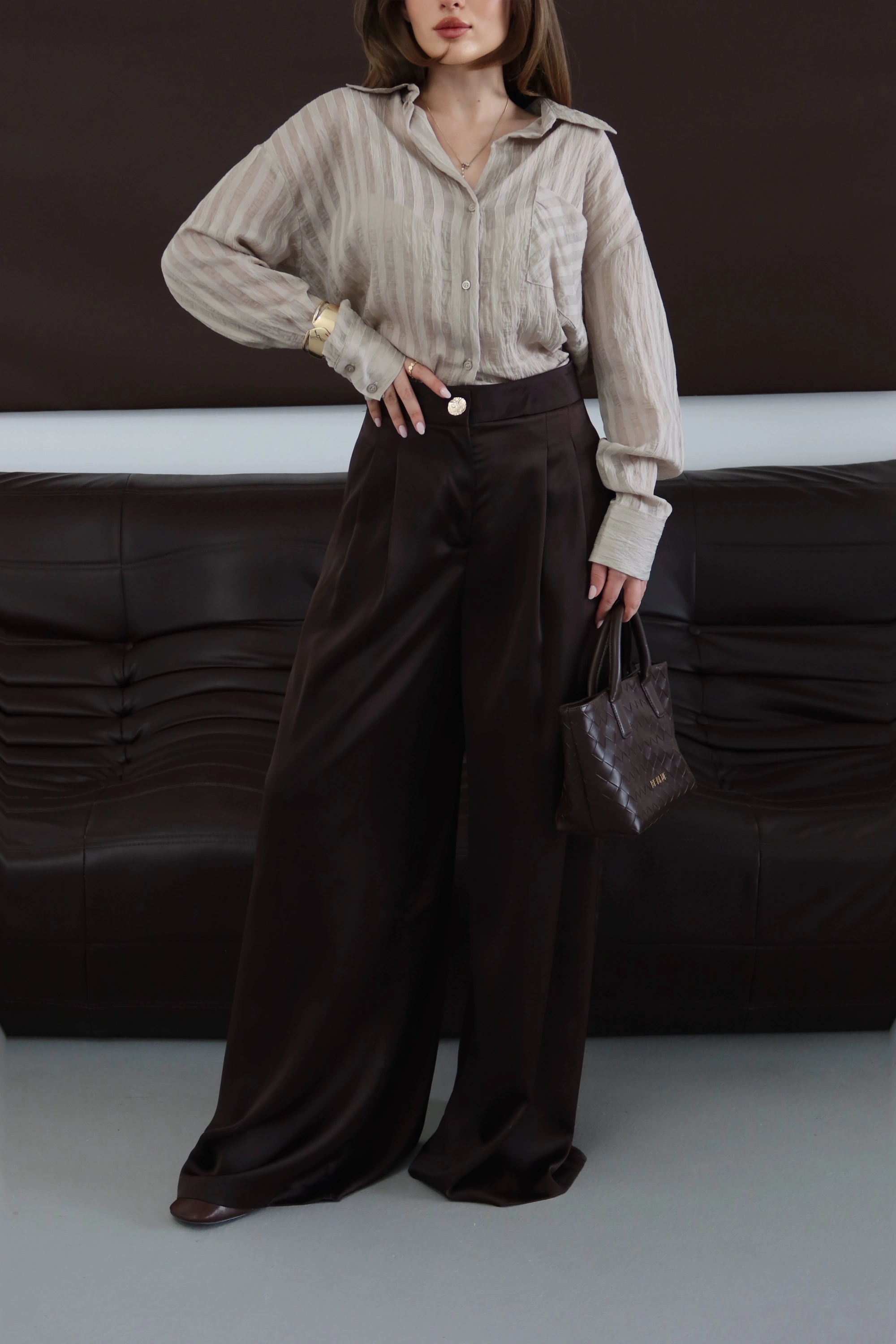 ROÉA Saten Yüzeyli Dökümlü Pantolon, konfor ve yüksek moda arasındaki o ince çizgide kusursuz bir denge kuruyor. Satenin karakteristik ışıltısını geniş ve dökümlü bir paça formuyla buluşturan tasarım, her hareketinizde vücudunuzla birlikte akan bir zarafet sunar. Yüksek bel kalıbı ve dökümlü yapısı, silüetinizi daha uzun ve akışkan gösterirken, kumaşın lüks tuşesi stilinize sofistike bir imza atar.