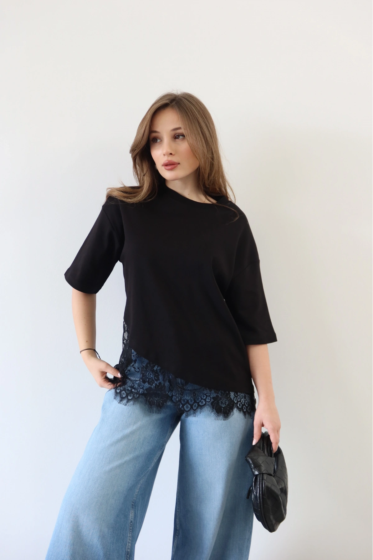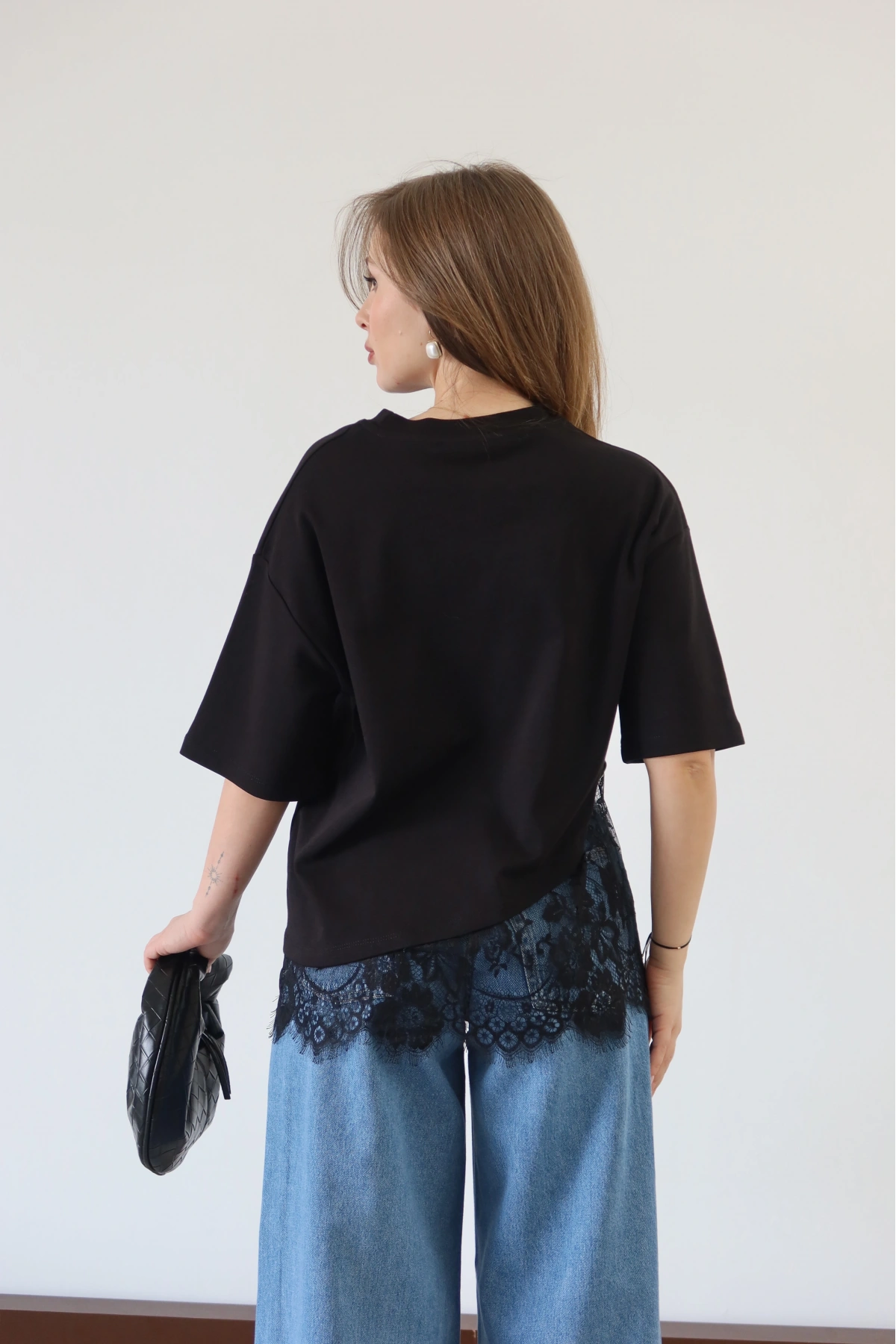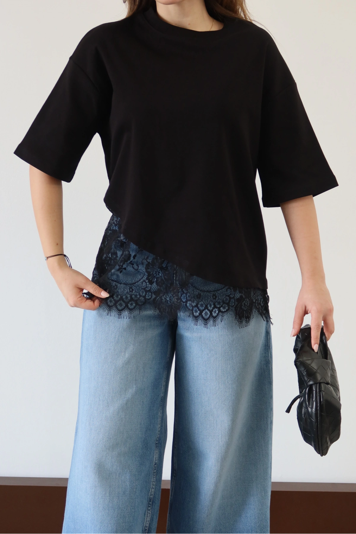 Eteği Dantelli T-shirt Siyah