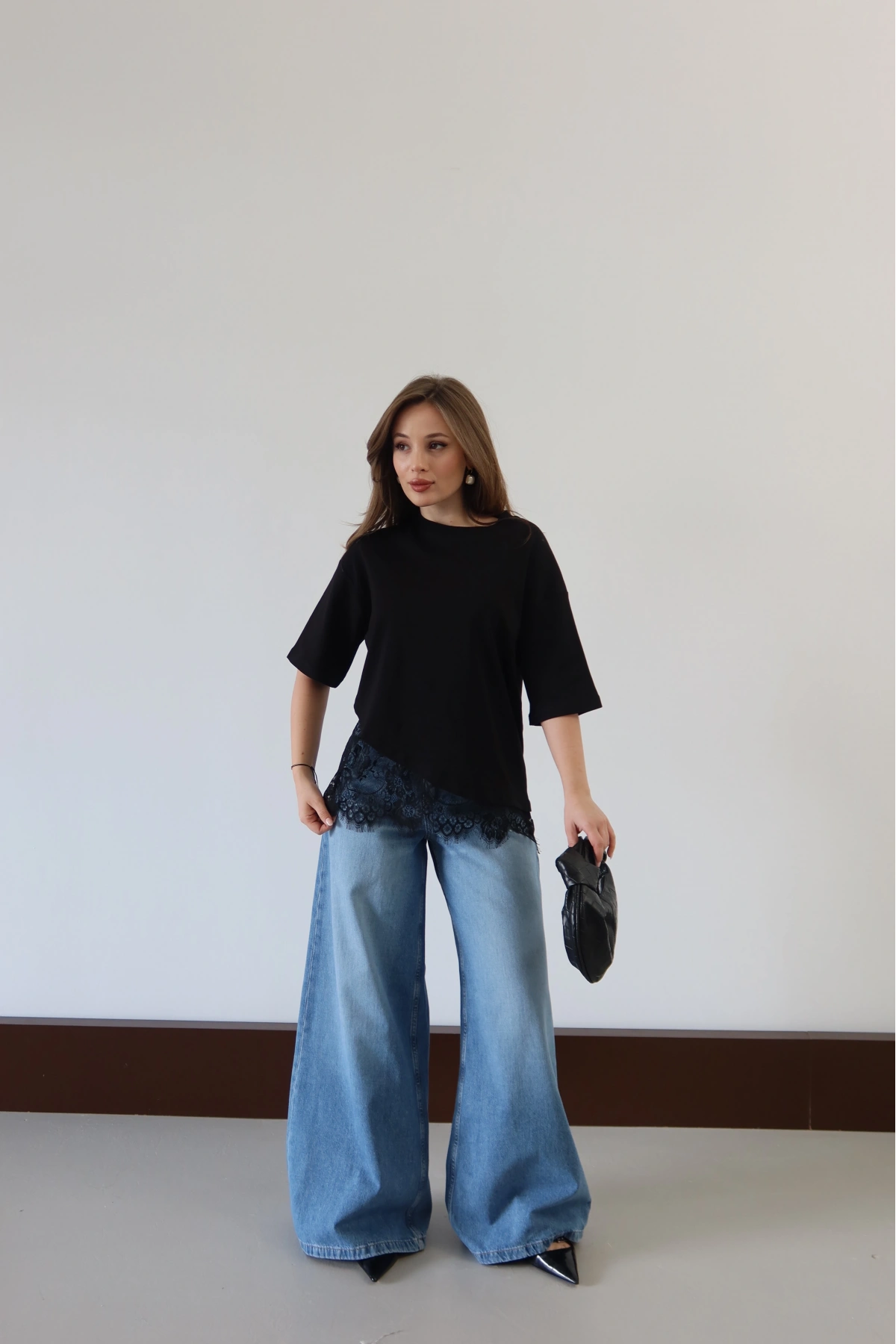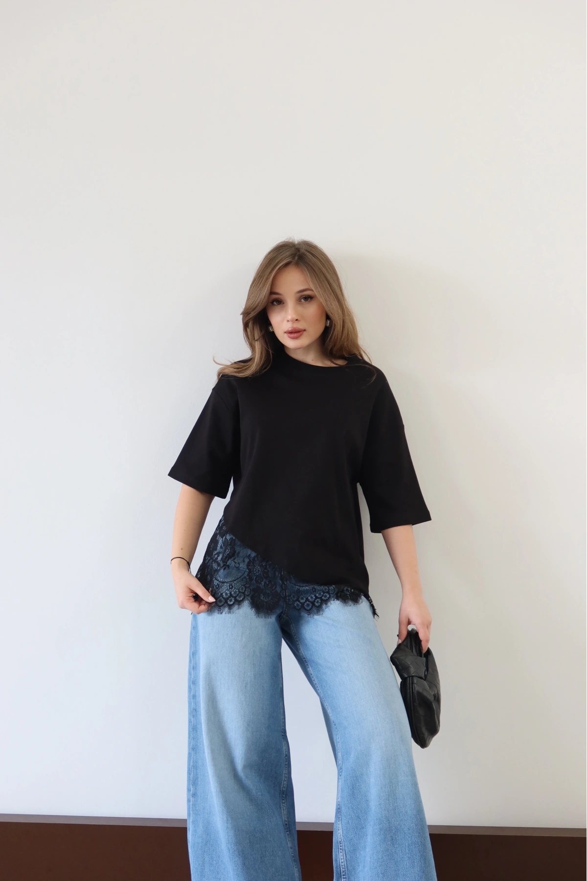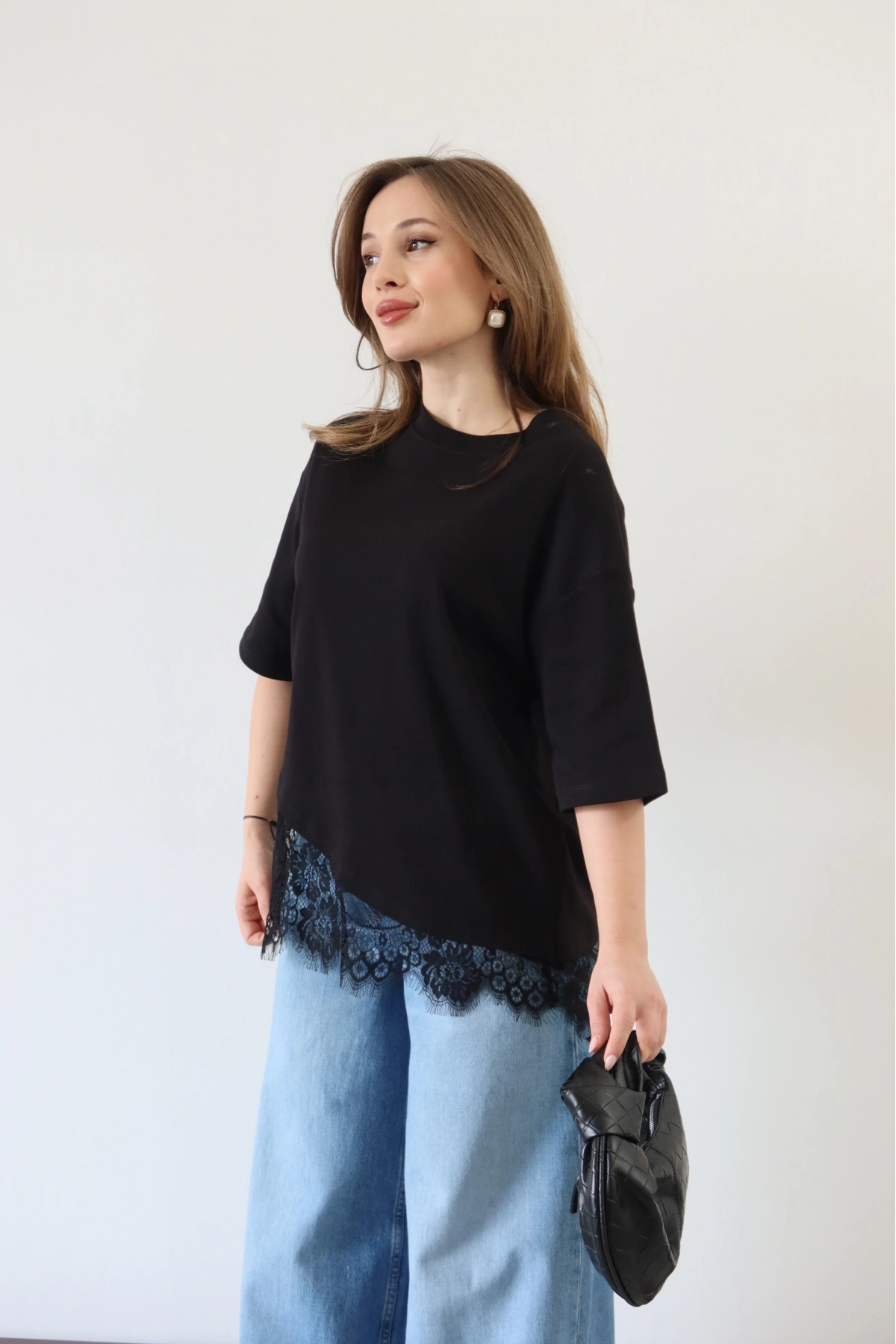Eteği Dantelli T-shirt Siyah