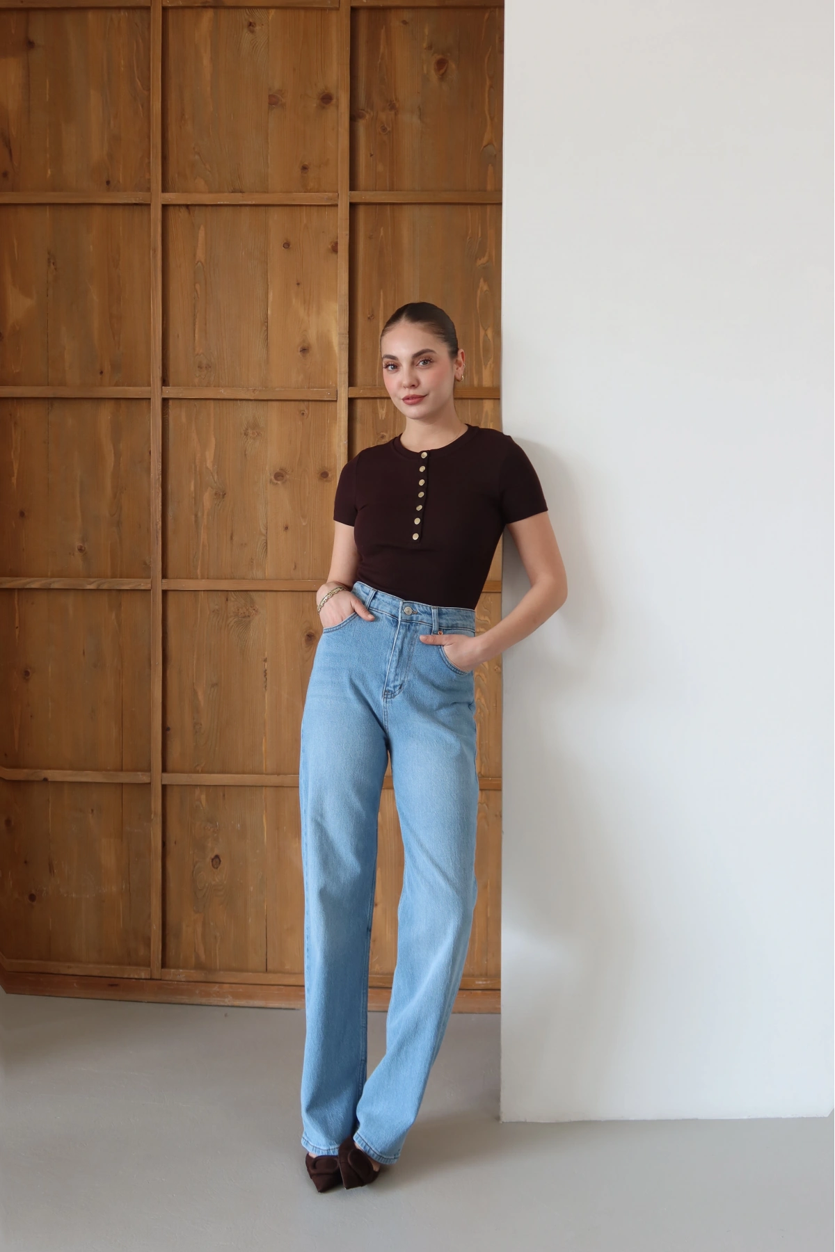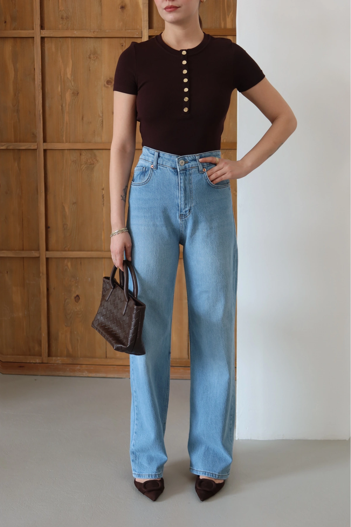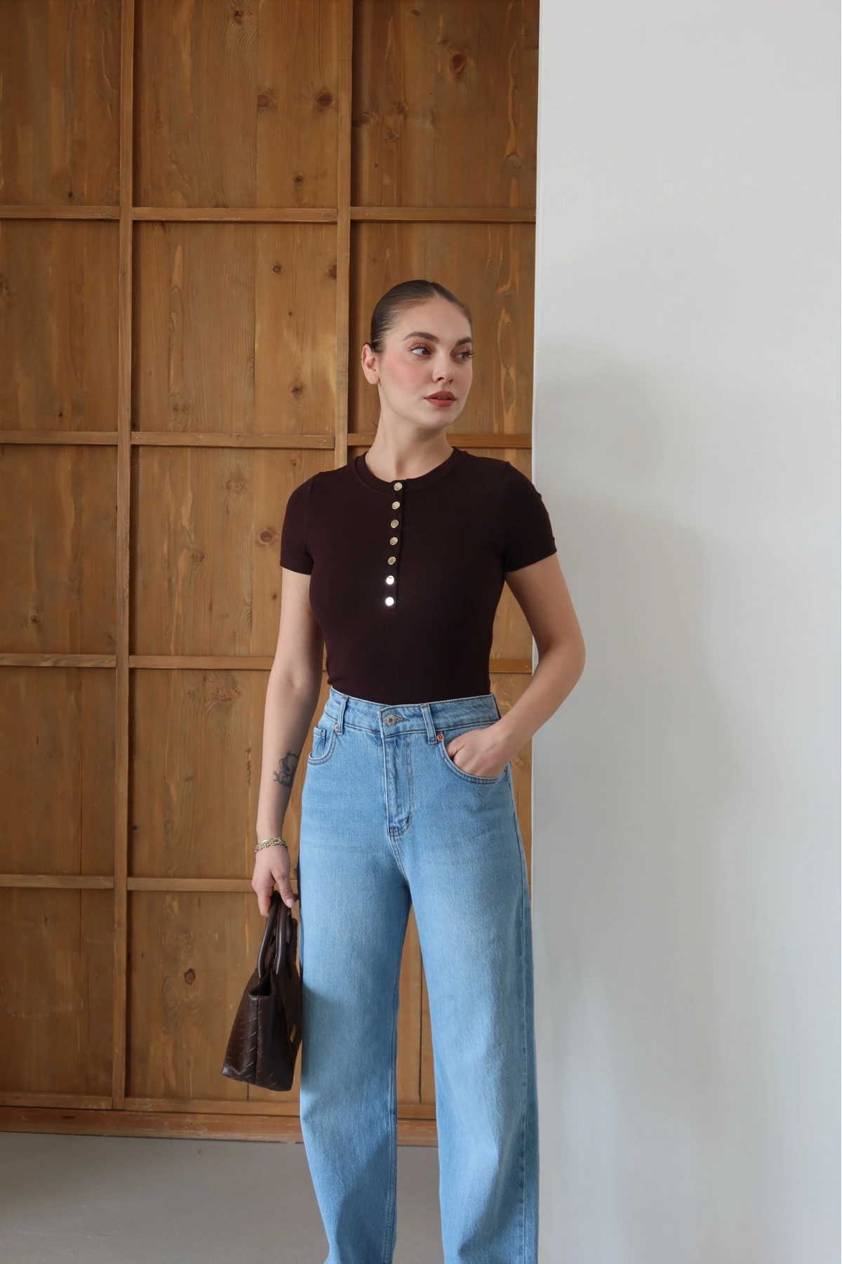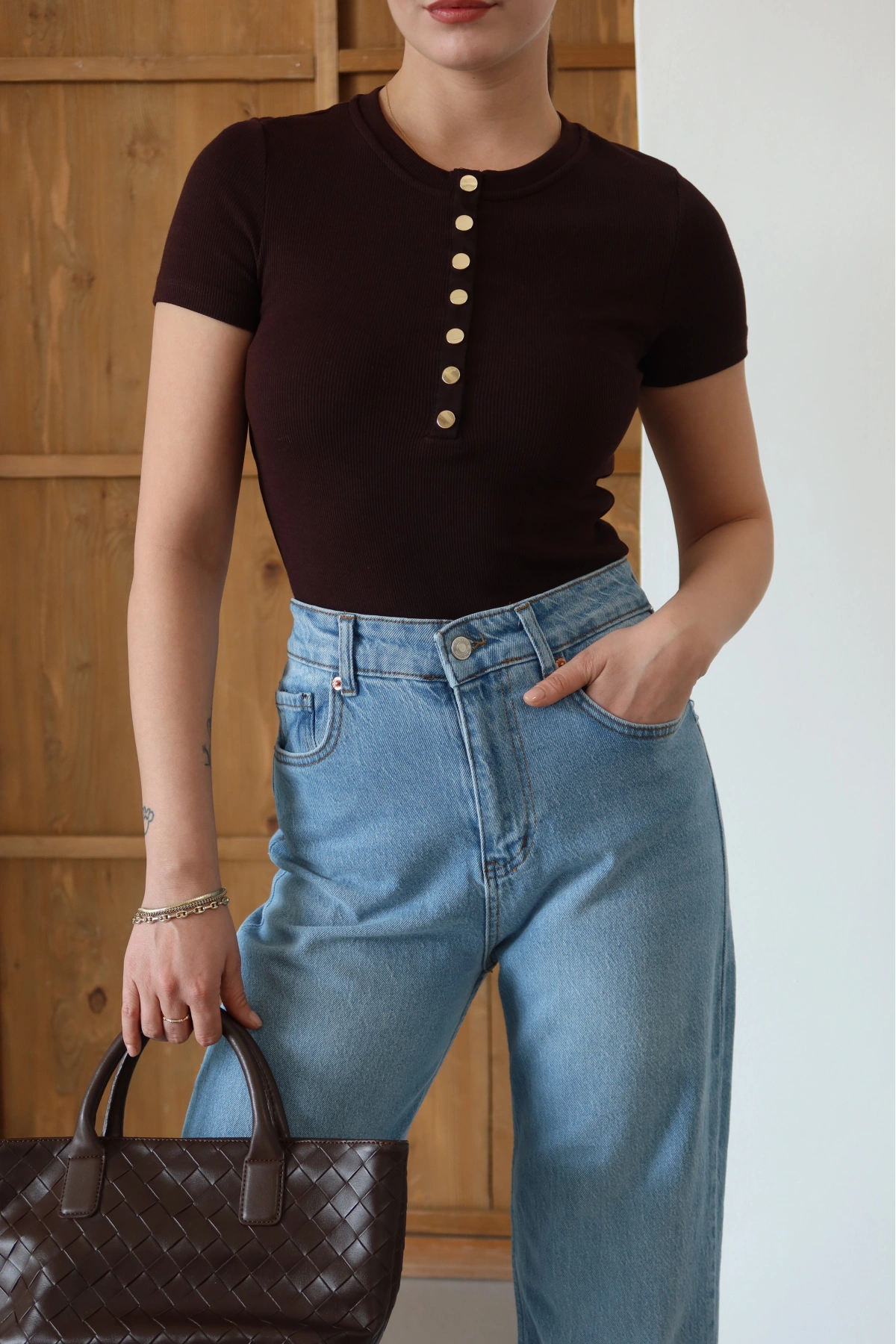 Kolu Dantelli Bisiklet Yaka T-shirt Kahve