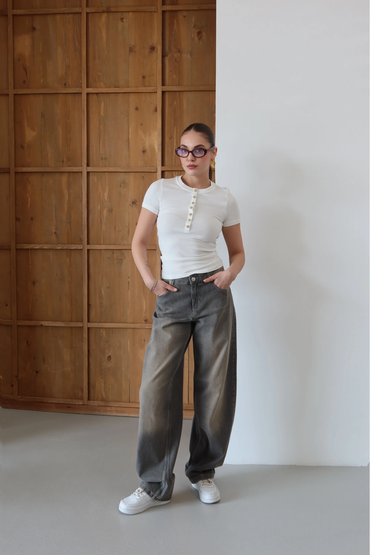Önü Çıtçıtlı T-shirt Beyaz