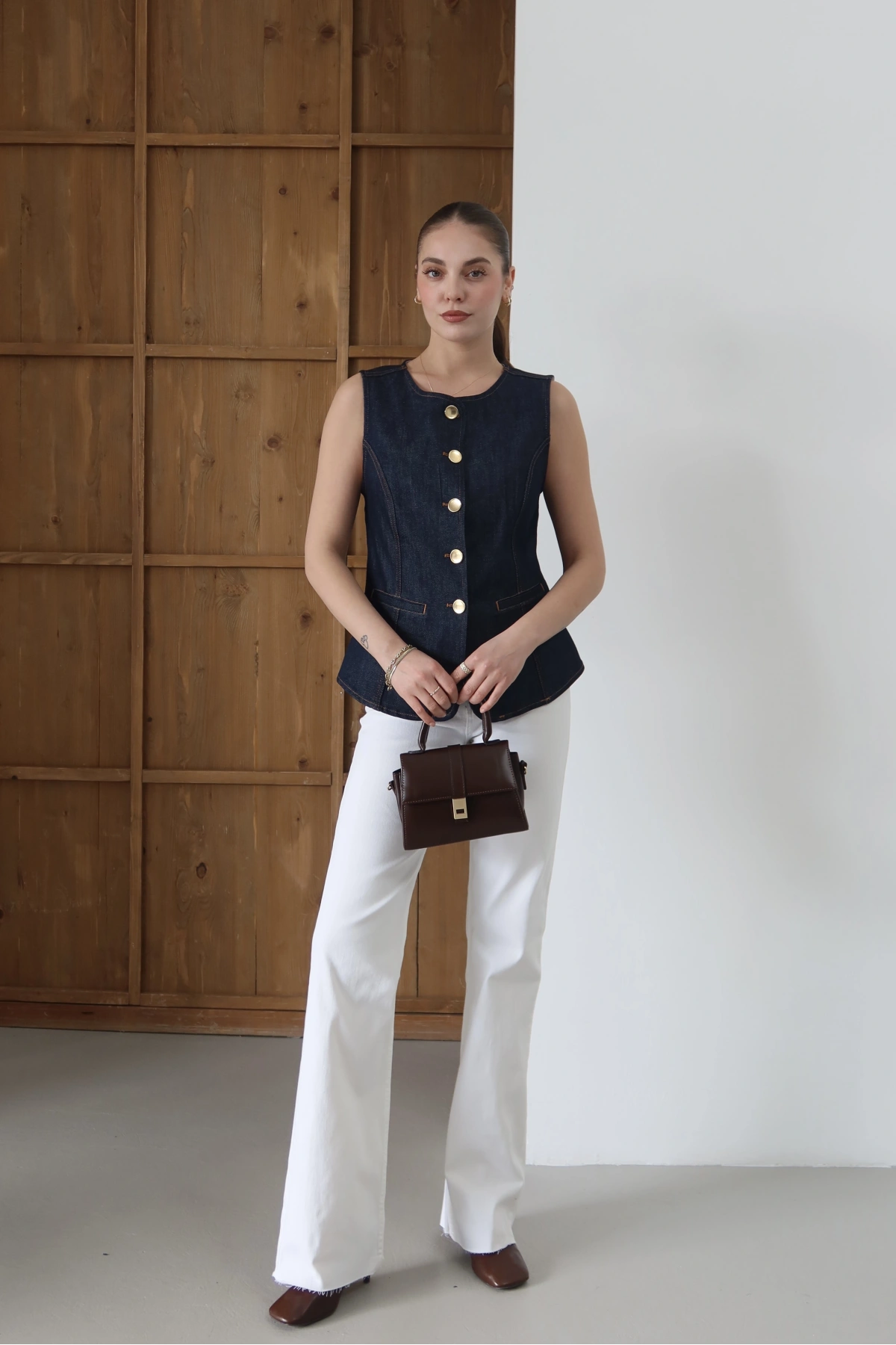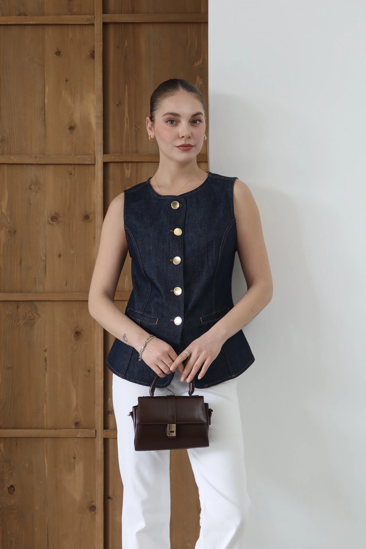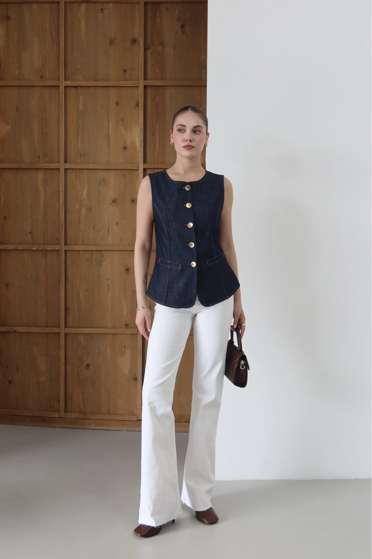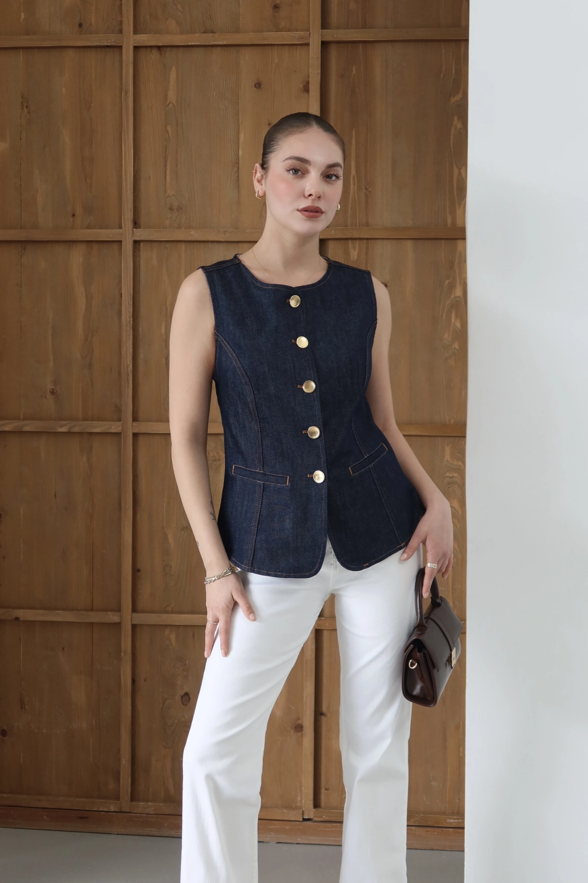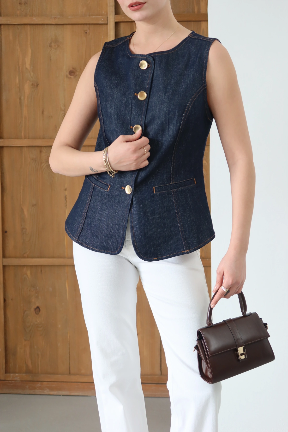 Bisiklet Yaka Gold Düğmeli Denim Yelek Lacivert