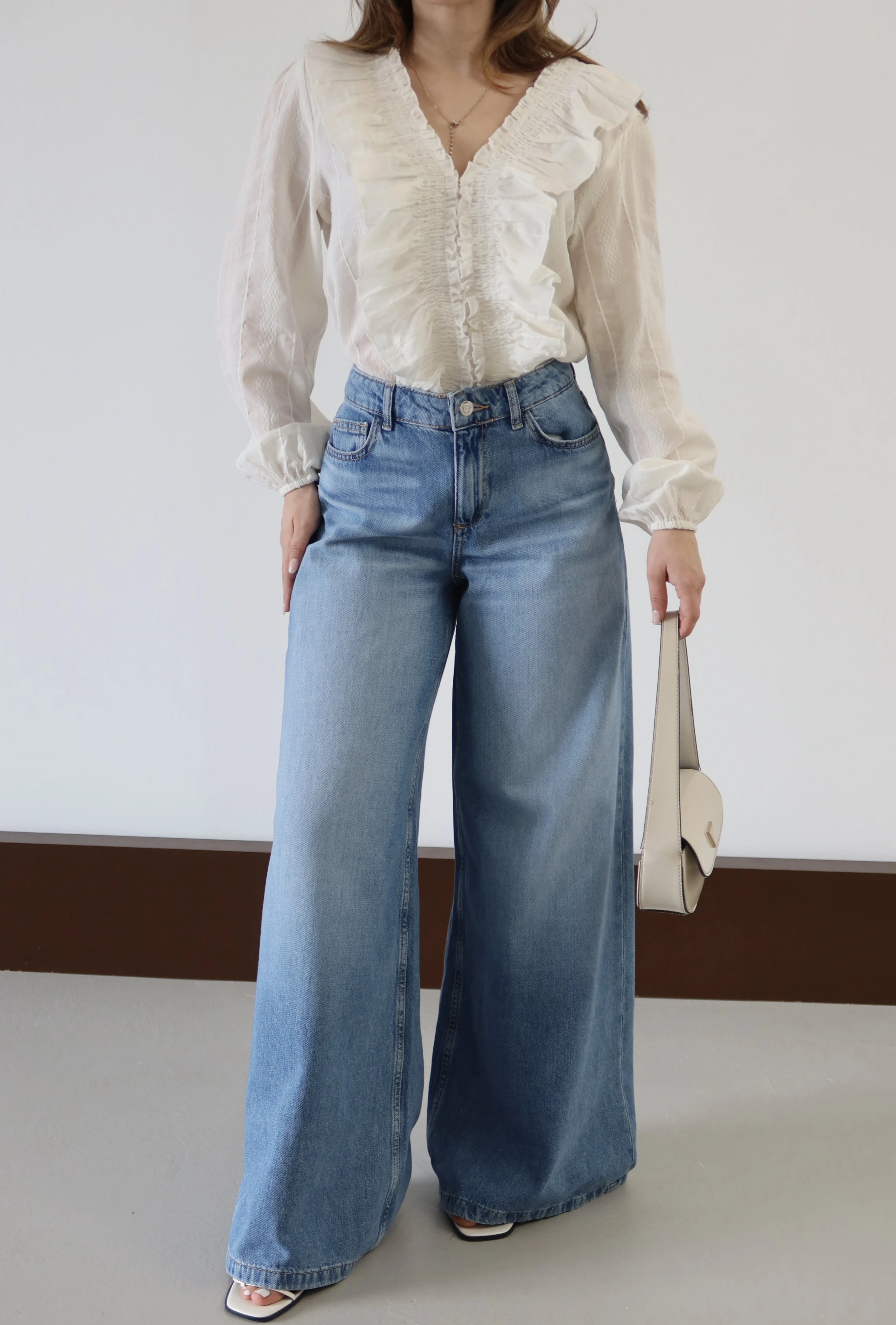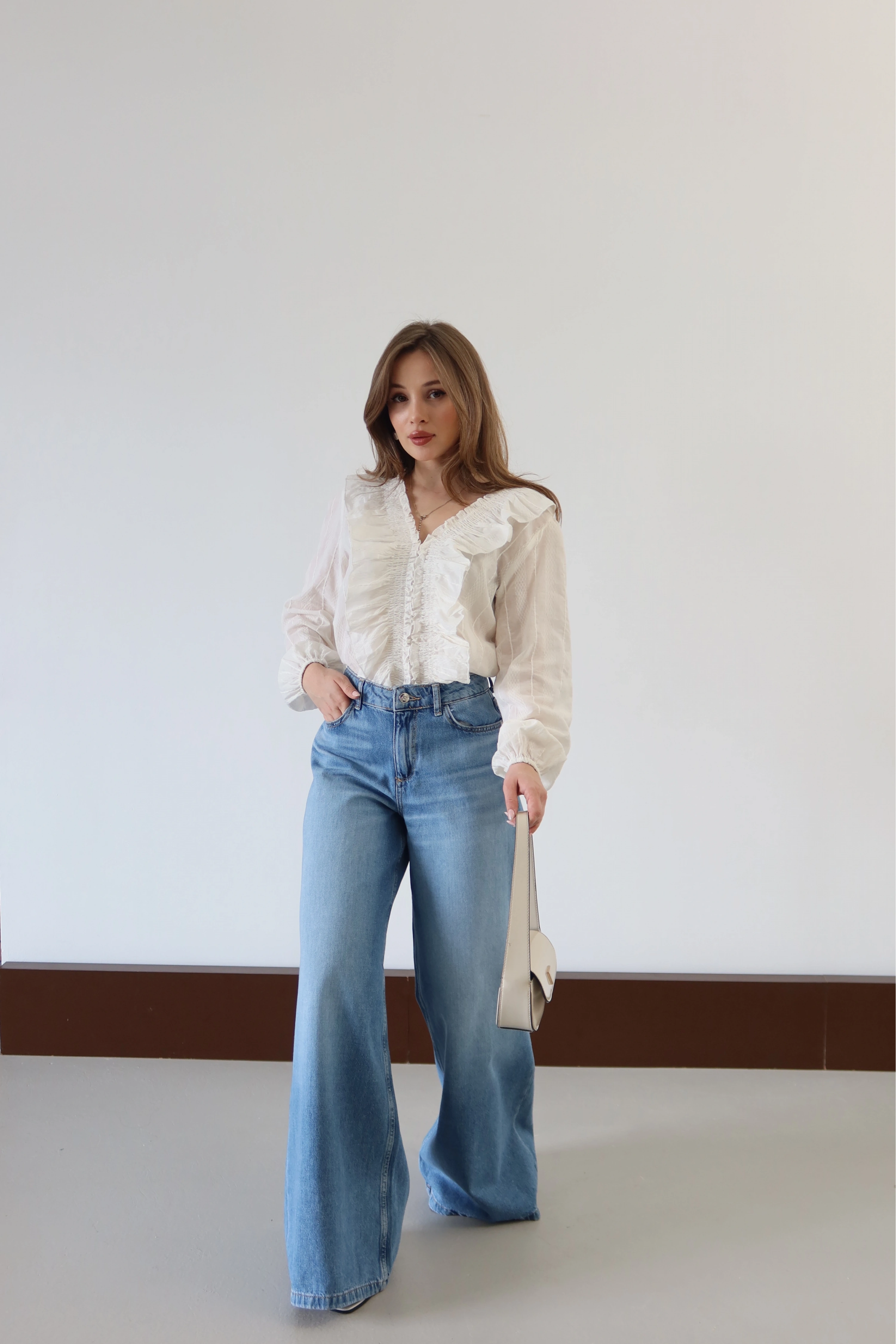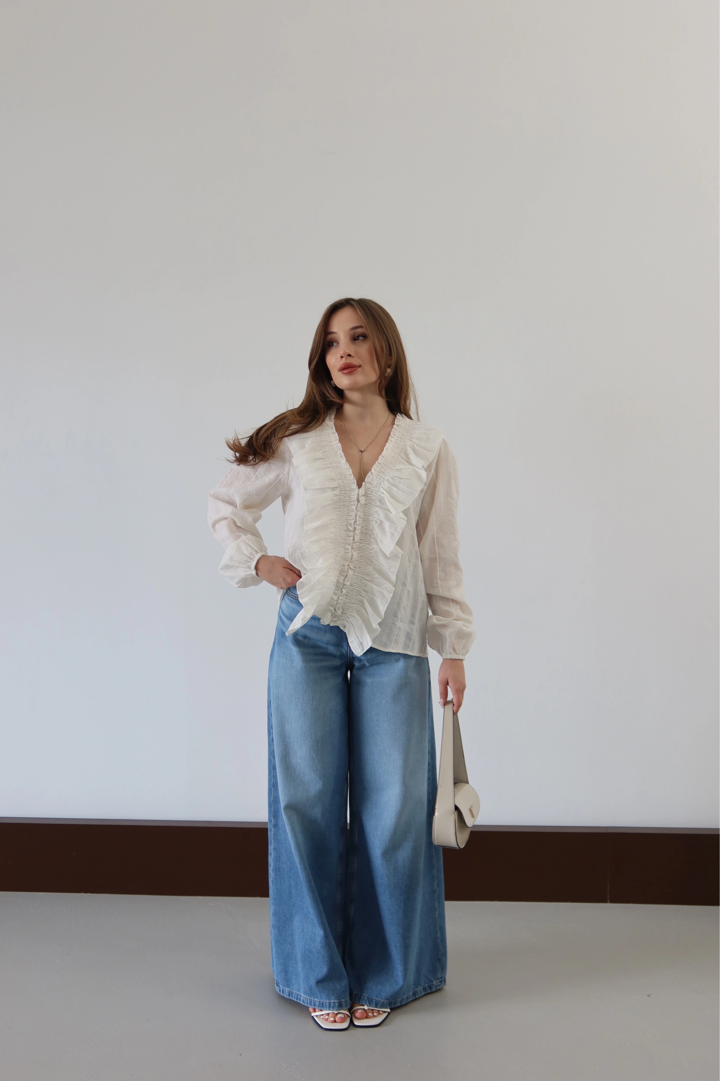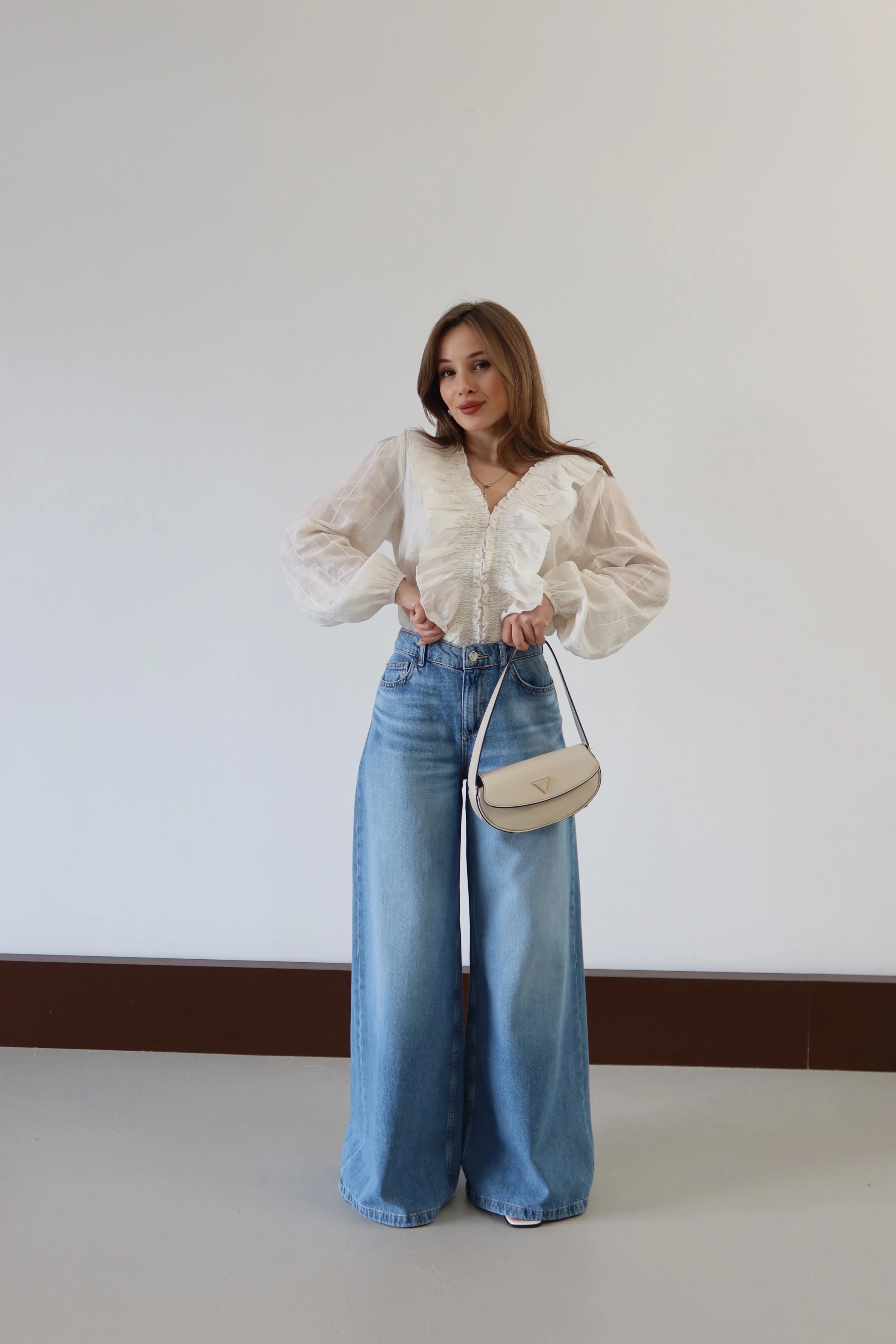 Yüksek belin mimari duruşu, buz mavisinin duruluğuyla buluşuyor. Geniş paça kesimiyle adımları özgürleştiren bu parça, özel yıkama dokusuyla karaktere bürünüyor. Şehir hayatının dinamizmine, denimin zamansız konforuyla eşlik eden bir silüet.