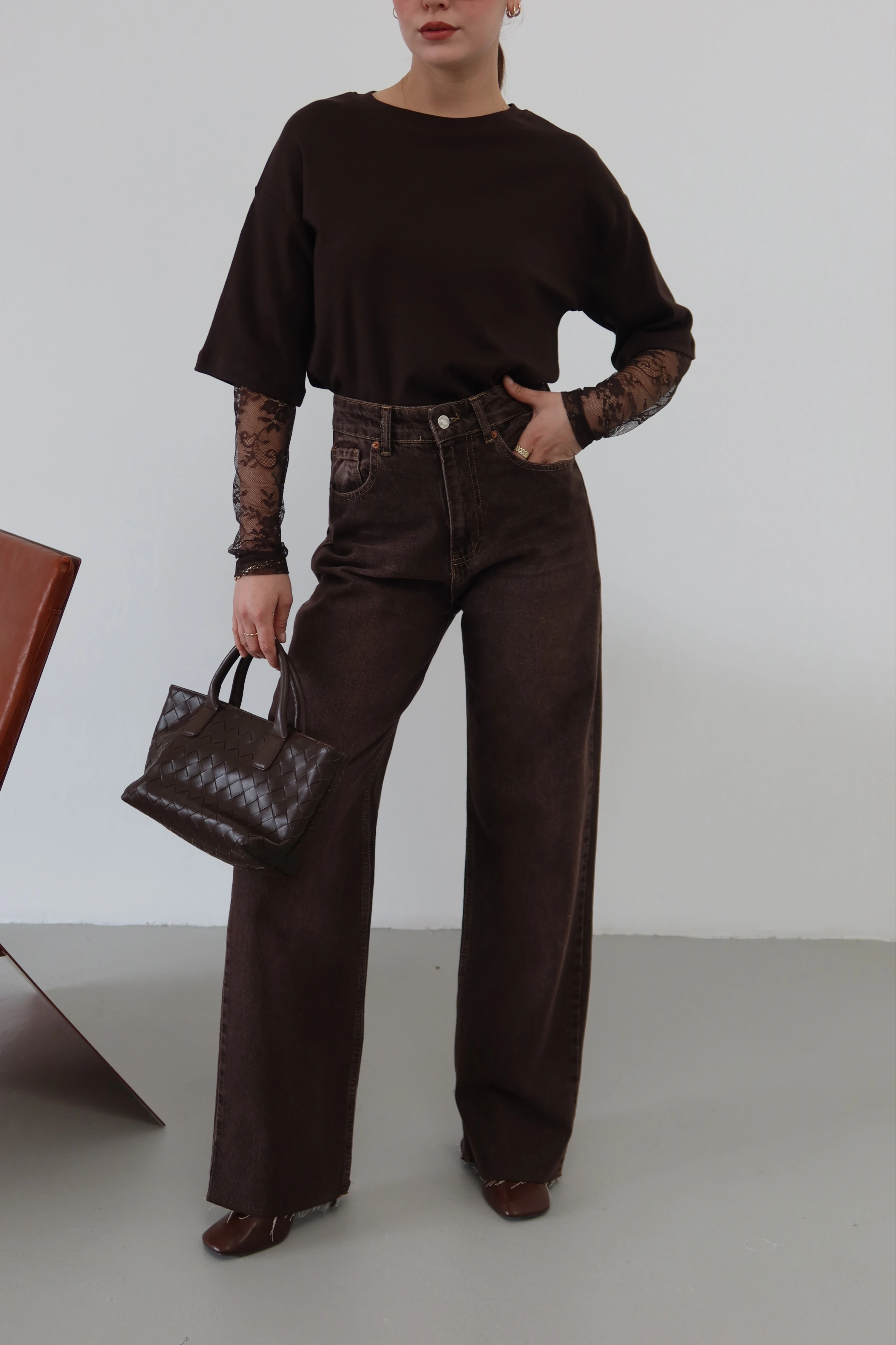 ROÉA’nın denim seçkisine eklenen bu özel parça, klasik boru paça formunu cesur bir kesik detayla yeniden yorumluyor. Yüksek bel kalıbı sayesinde beli mükemmel kavrayan tasarımı, dizden aşağı dümdüz inen hattıyla proporsiyonunuzu dengeler. Paça ucundaki ham bitiş (raw cut) ve sezonun en güçlü tonu olan sıcak kahve yıkaması, jean şıklığına modern bir tavır katar.
